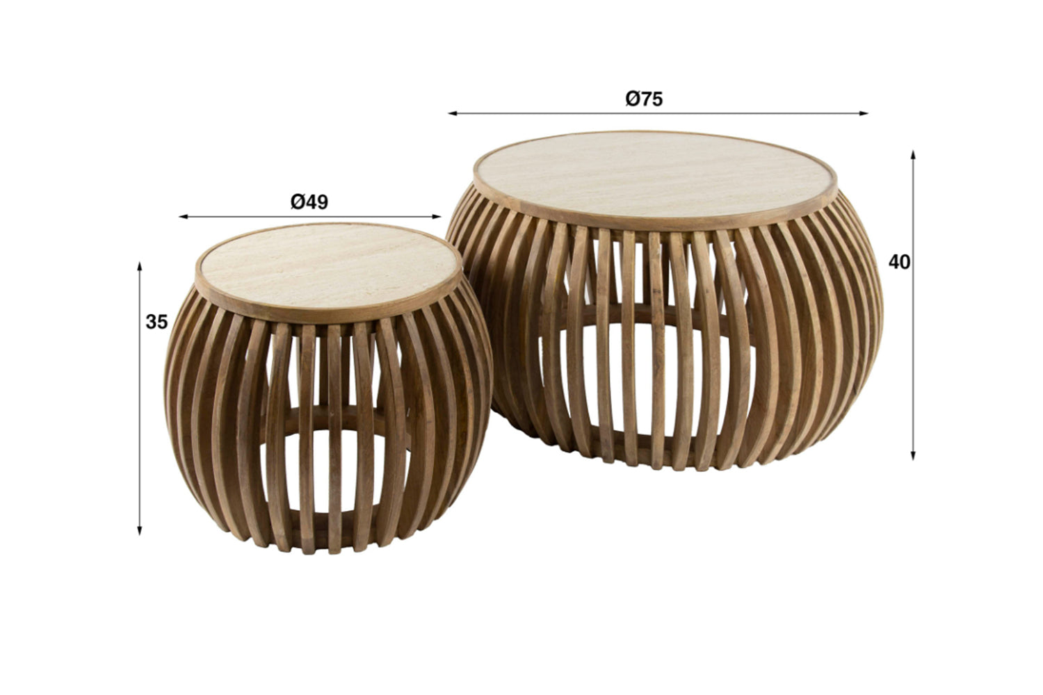 El juego de mesa de centro ATUEL de KAWOLA está fabricado en madera de mango maciza y desprende calidez y carácter. El tablero es de lujosa cerámica travertínica, que le confiere un aspecto moderno y sofisticado. Este conjunto es realmente imprescindible. El conjunto consta de dos mesas. La mesa más grande tiene un diámetro de 75 cm y una altura de 40 cm, mientras que la mesa más pequeña tiene un diámetro de 49 cm y una altura de 35 cm. Ya sea moderno, rústico o clásico, el juego de mesa de centro ATUEL se adapta sin esfuerzo a cualquier estilo de decoración gracias a su aspecto atemporal. Ideal como centro de mesa con estilo en el salón y una auténtica atracción para los amantes de los muebles de alta calidad.