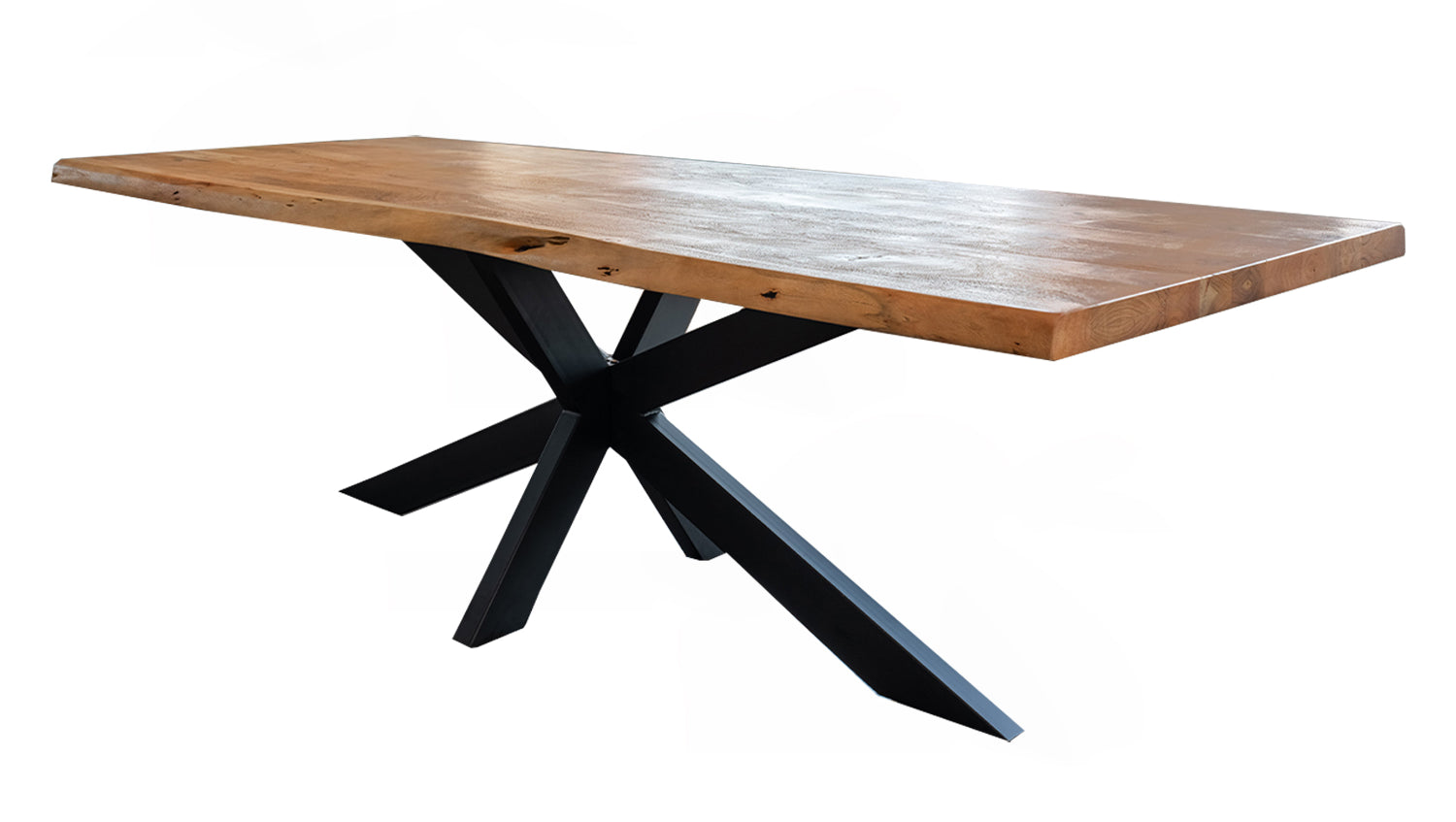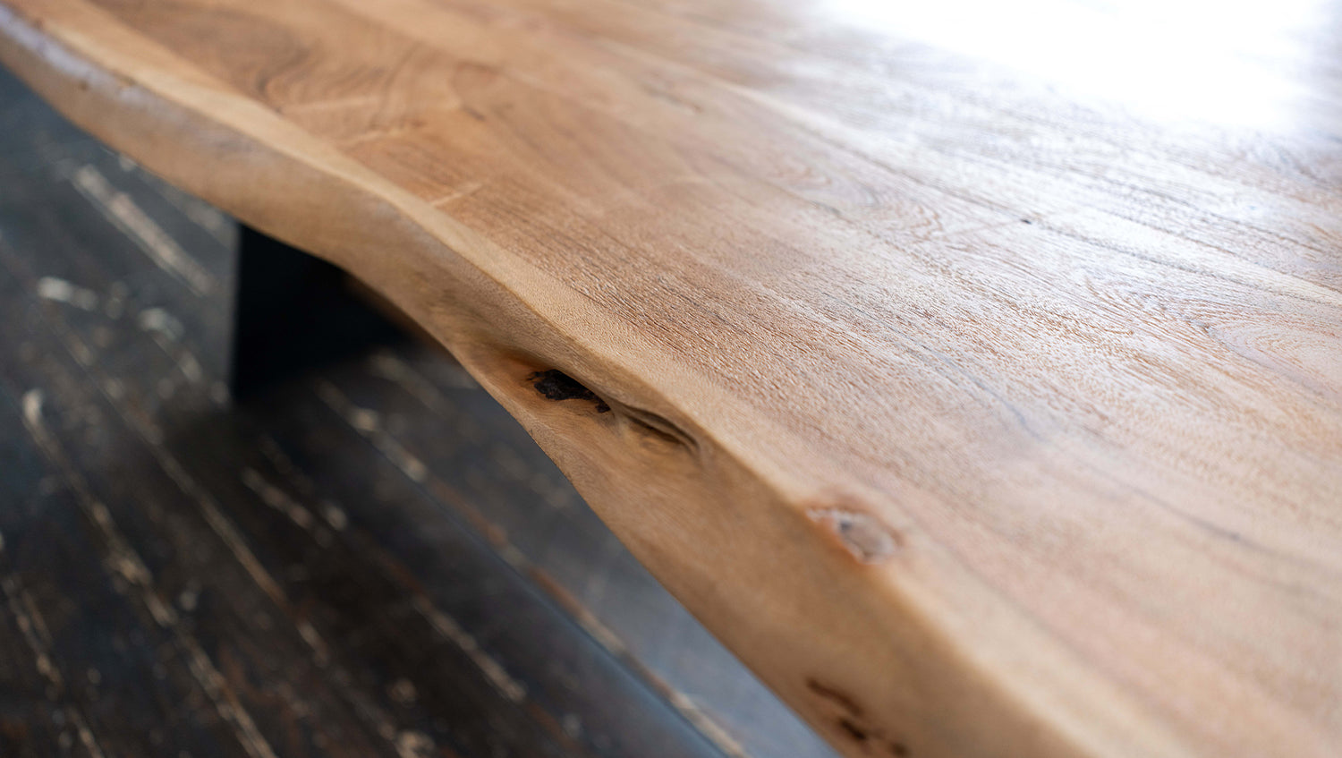 La mesa de madera maciza SELVA de KAWOLA combina un diseño atemporal con materiales naturales. La superficie del tablero de madera maciza de acacia está cepillada y es de color roble, lo que acentúa a la perfección el veteado natural de la madera. Impresiona con su característico borde de árbol, que refleja el crecimiento natural de la madera. Cada tablero es único y confiere a su comedor un ambiente cálido y acogedor. Disponible en longitudes de 200 cm, 220 cm, 240 cm, 260 cm, 280 cm y 300 cm, esta mesa de madera maciza ofrece espacio de sobra para veladas acogedoras o cenas con estilo. El bastidor rústico de base soldada de diseño industrial, pintado de negro y con una llamativa base de araña, confiere a la mesa un toque moderno e industrial. La Mesa de comedor SELVA no es sólo un mueble, sino una declaración de intenciones de alta calidad y diseño moderno. Perfecta para quienes desean combinar naturalidad y urbanidad en su hogar. Lleve un trozo de naturaleza a su comedor.
