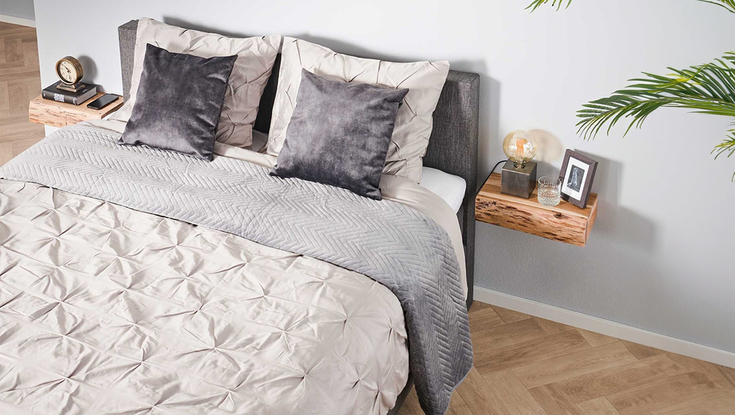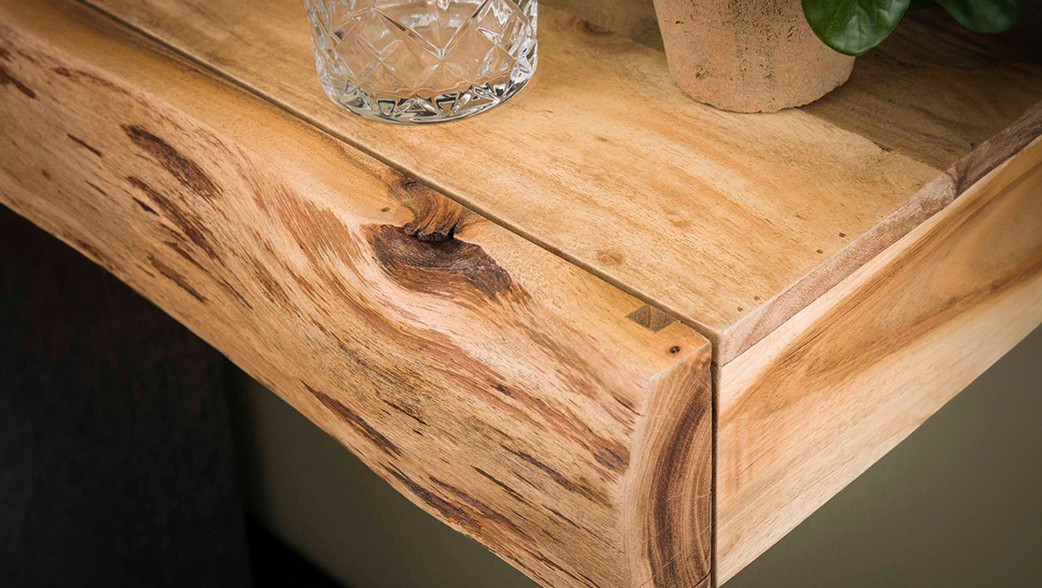 El juego de mesitas de noche KAWOLA SESA XL, compuesto por dos mesitas, impresiona por su elegante diseño y su elaboración de alta calidad. Fabricado en madera de acacia maciza y lacado en mate transparente, este juego de mesitas de noche de pared aporta una elegancia natural a su dormitorio. El cajón con borde natural confiere a las mesillas un aspecto único. El aspecto flotante se consigue mediante un sencillo montaje en la pared con sólo dos tornillos, ideal para conceptos de habitación modernos que ahorran espacio. Con unas dimensiones compactas de 40 x 20 x 10 cm, el conjunto es perfecto para guardar libros, teléfonos móviles o adornos. La elegante estructura de madera y el diseño minimalista hacen de la mesilla de noche de pared SESA XL de KAWOLA un elemento funcional destacado en cualquier dormitorio. Ideal para habitaciones pequeñas, camas con somier o como alternativa elegante a la clásica mesilla de noche.