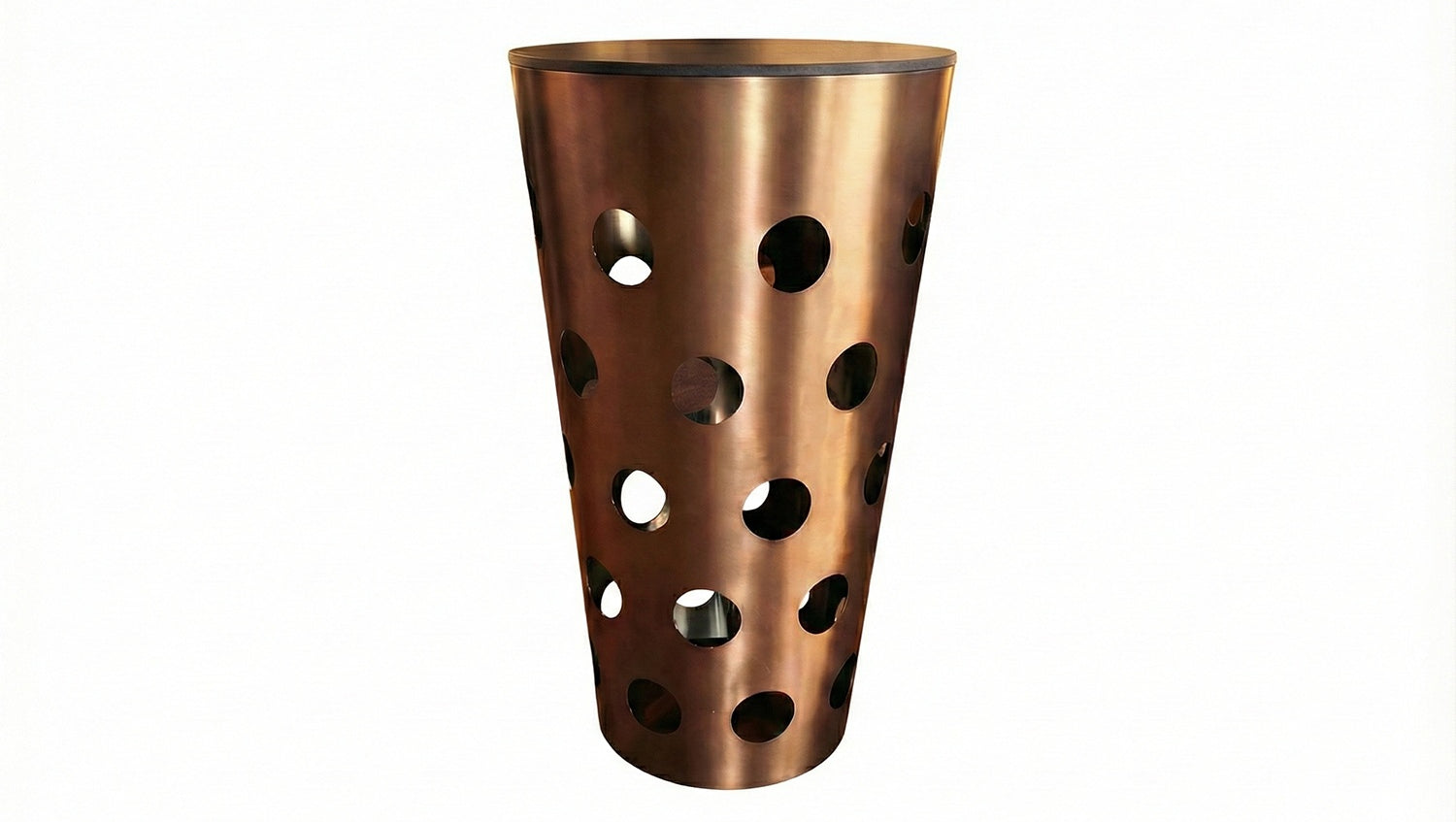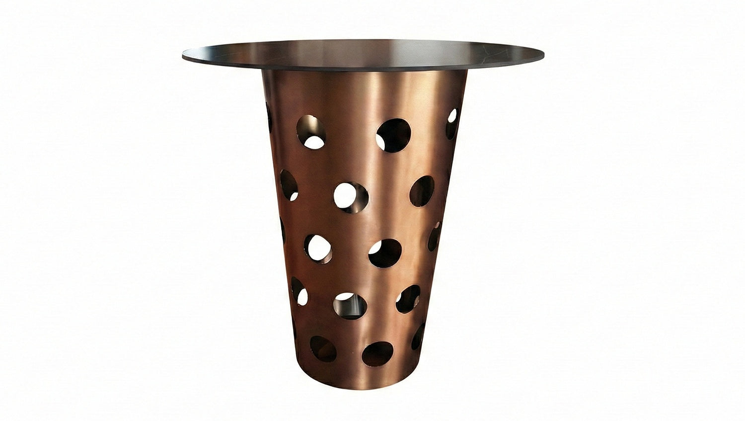 La mesa alta VINO de KAWOLA es una pieza llamativa con un alto valor de reconocimiento. Su estructura cónica con las llamativas aberturas redondas se inspira deliberadamente en el tradicional vaso Dubbe, símbolo de la convivencia y la cultura del disfrute. Es precisamente esta asociación la que confiere a la mesa su extraordinario efecto y la convierte en el centro comunicativo de cualquier bar o salón.