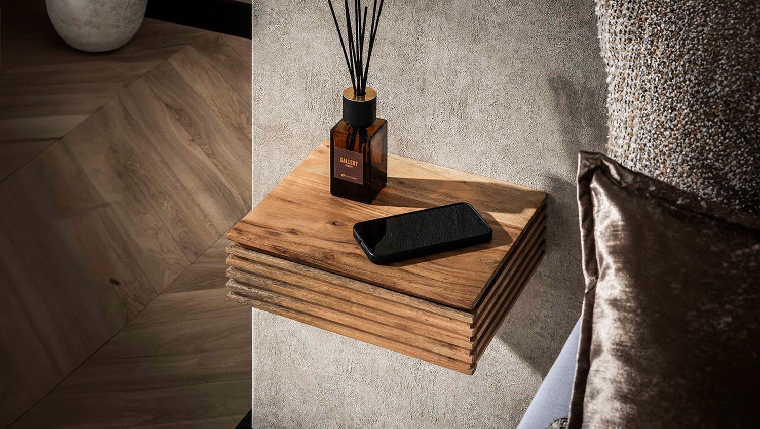 El juego de mesitas de noche FIRU de KAWOLA, compuesto por dos mesitas, impresiona por su elegante diseño y su elaboración de alta calidad. Fabricado en madera de acacia maciza con un llamativo diseño ondulado y lacado mate transparente, este juego de mesitas de noche de pared aporta una elegancia natural a su dormitorio. El aspecto flotante se consigue mediante un sencillo montaje en la pared con sólo dos tornillos, ideal para conceptos de habitación modernos que ahorran espacio. Con unas dimensiones compactas de 30 x 25 x 8 cm, el conjunto es perfecto para guardar libros, teléfonos móviles o adornos. La elegante estructura de madera y el diseño minimalista hacen de la mesita de noche de pared FIRU de KAWOLA un elemento funcional destacado en cualquier dormitorio. Ideal para habitaciones pequeñas, camas con somier o como alternativa elegante a la clásica mesilla de noche.