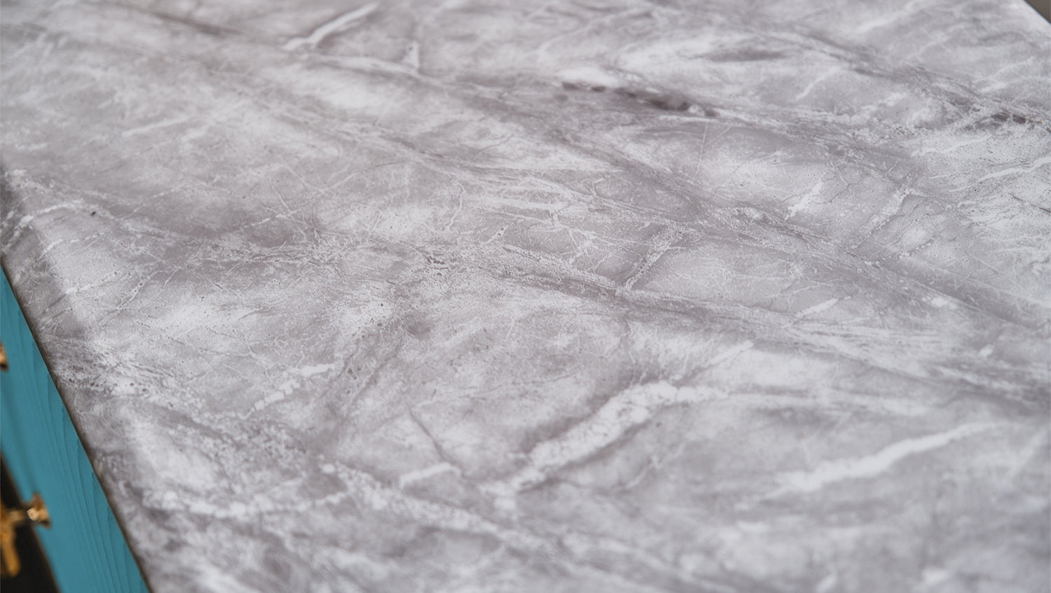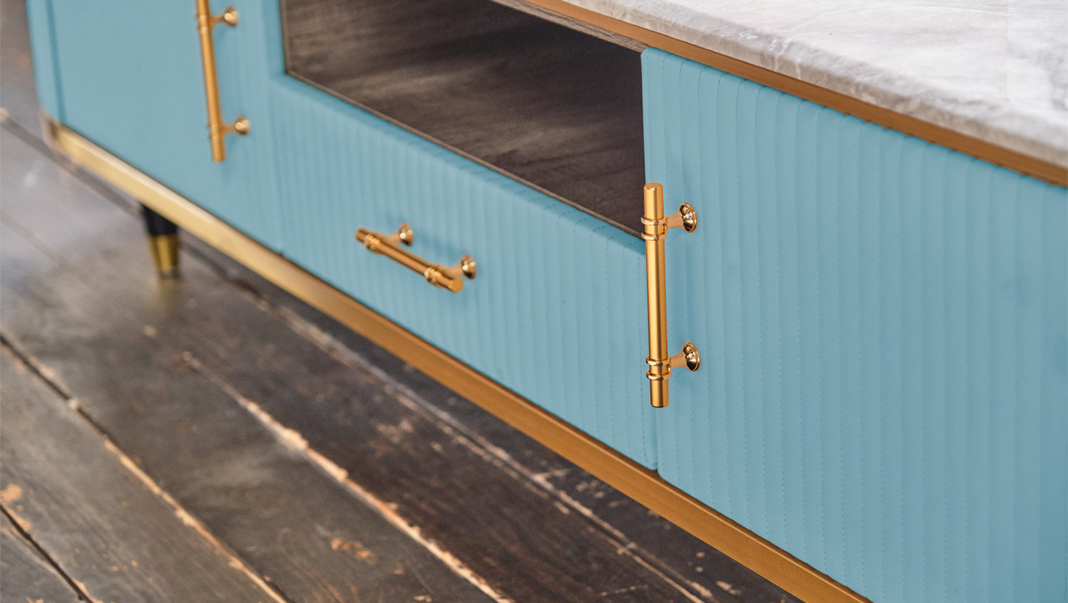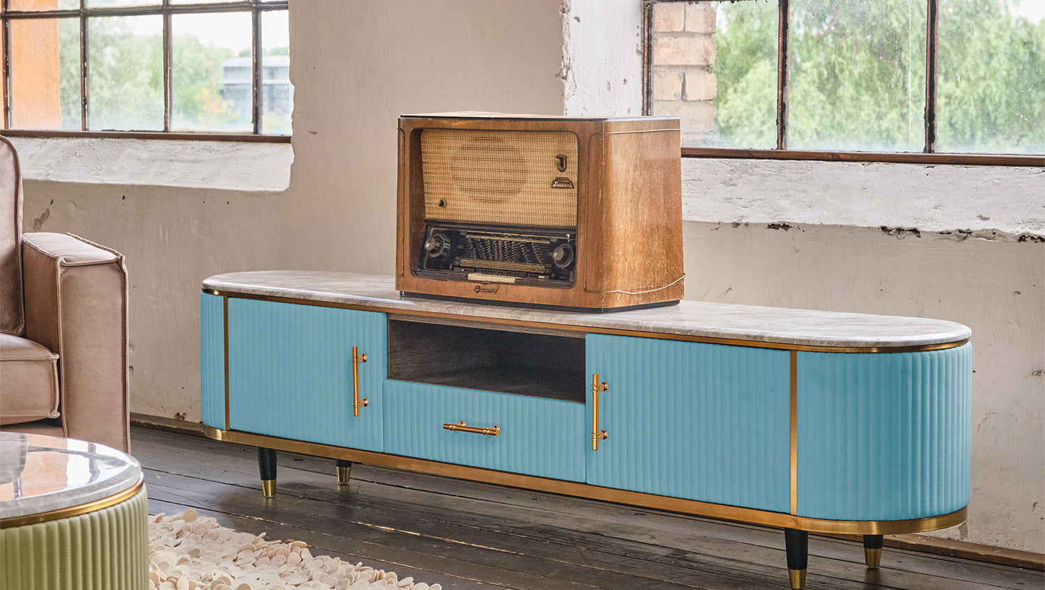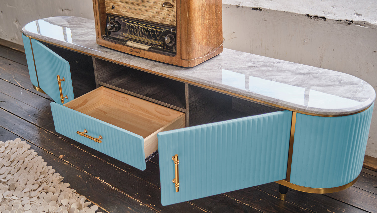 Mueble bajo para TV MARIA de KAWOLA, tapa de mármol, piel sintética, azul claro