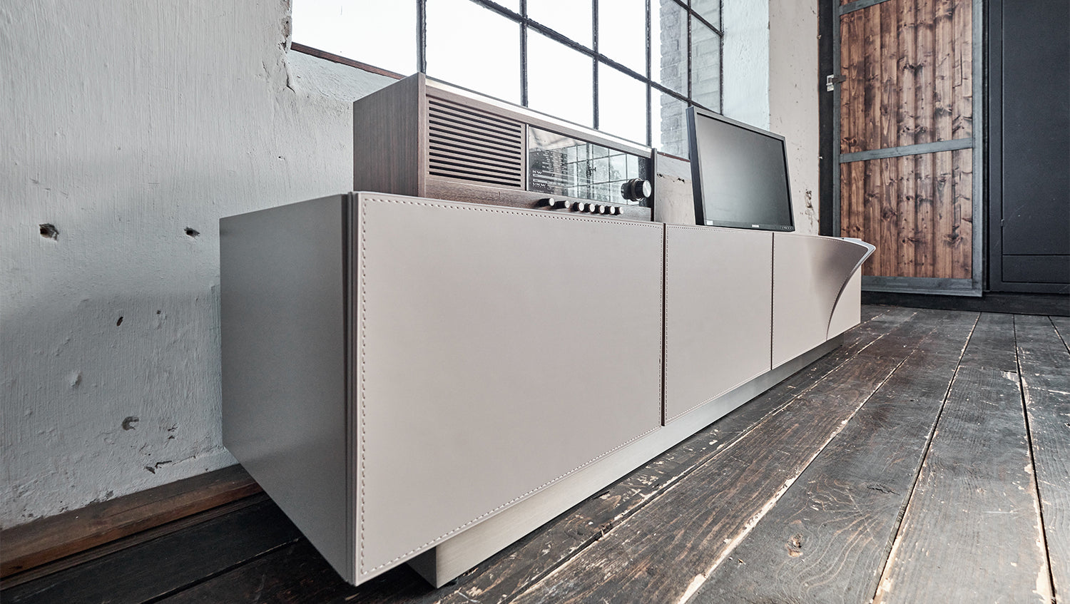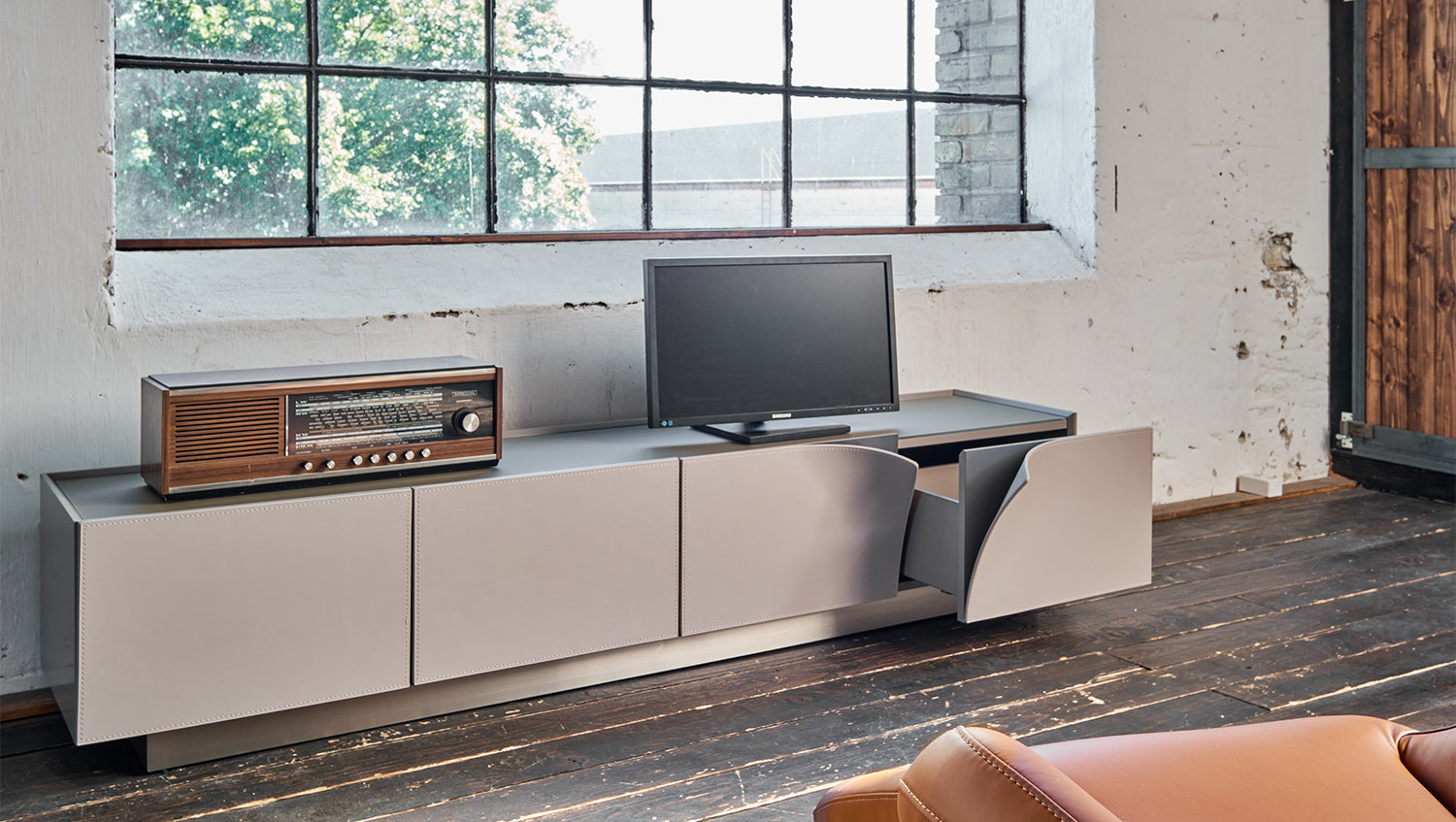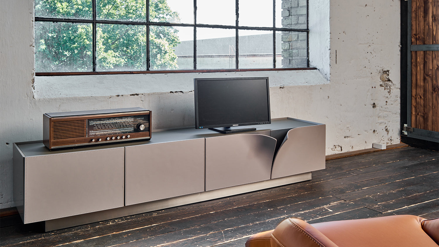 Mueble bajo para TV EMMA de KAWOLA, piel sintética, pie gris, acero inoxidable cepillado