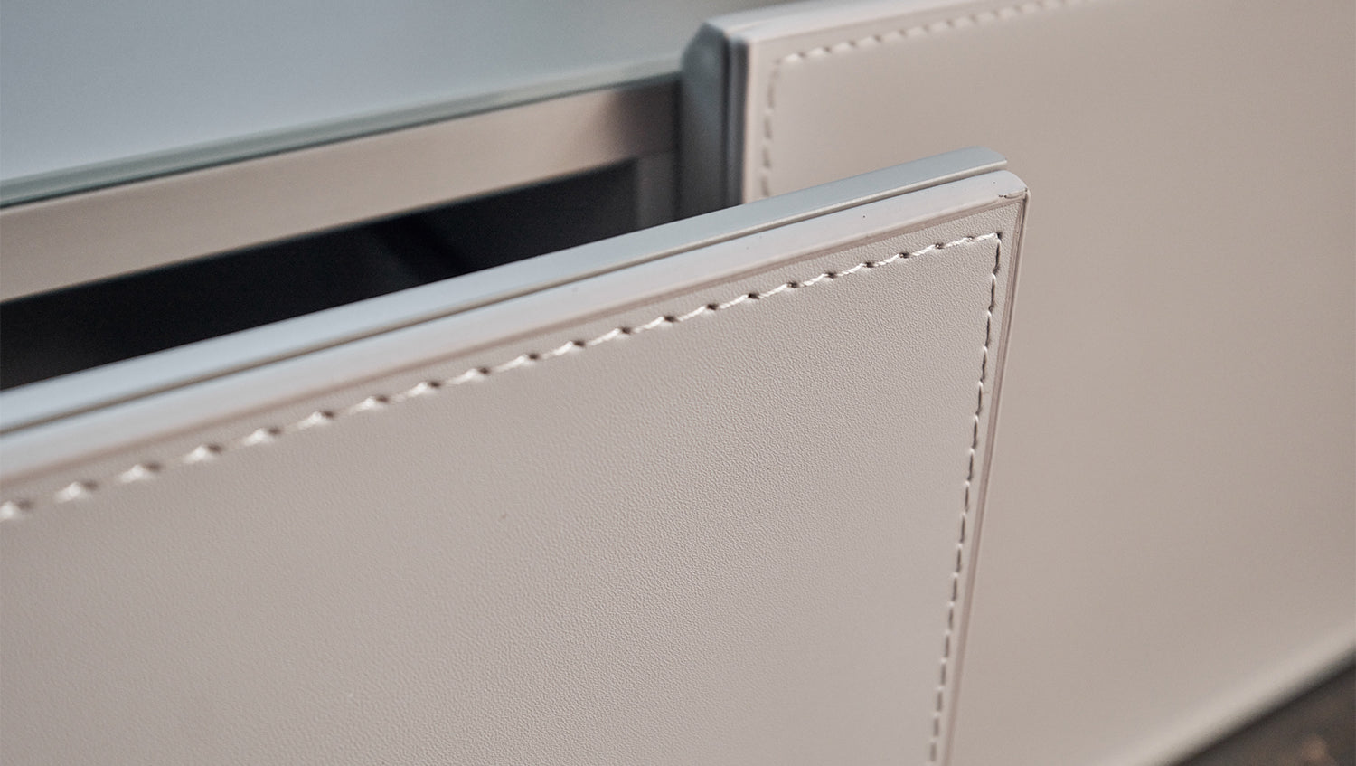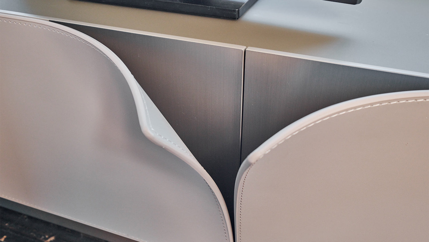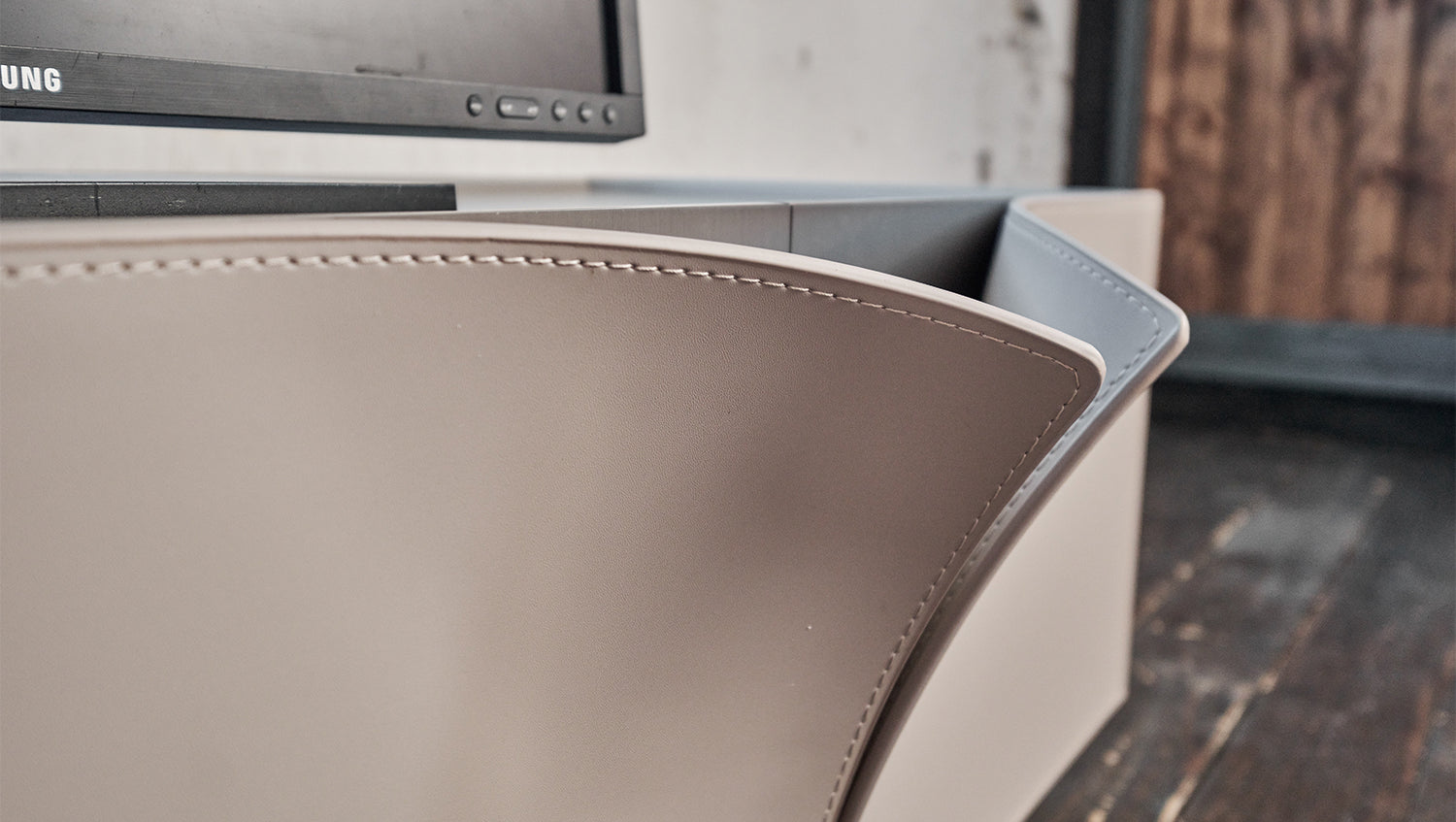 Mueble bajo para TV EMMA de KAWOLA, piel sintética, pie gris, acero inoxidable cepillado