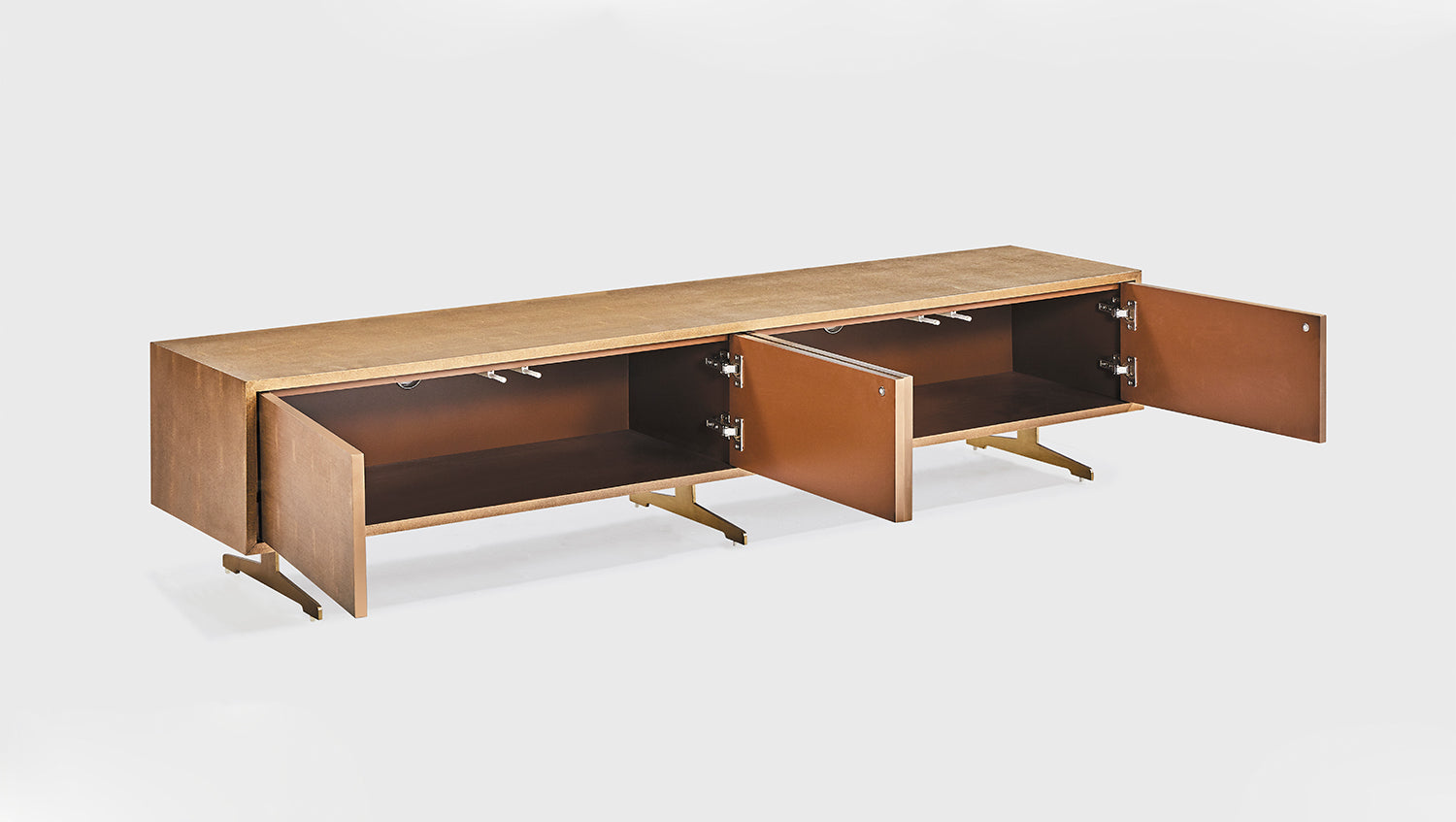 Mueble bajo para TV GALA de KAWOLA, 4 puertas, piel sintética, pie dorado, acero inoxidable cepillado