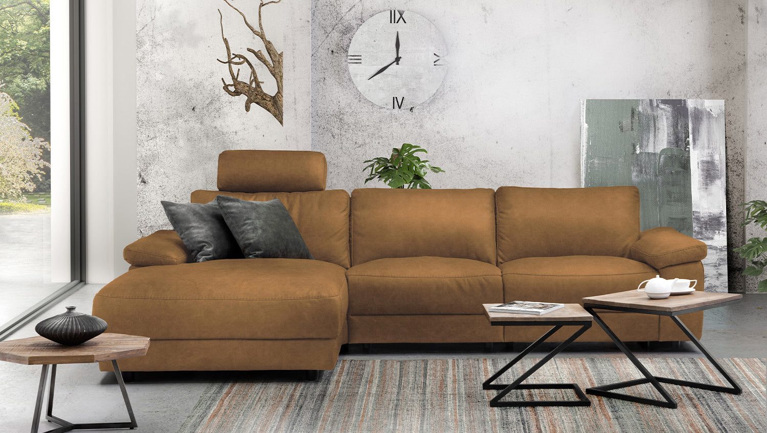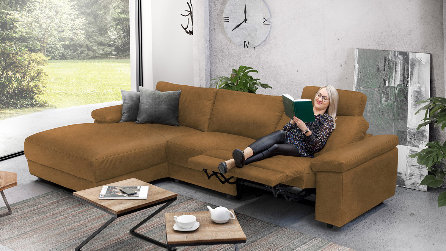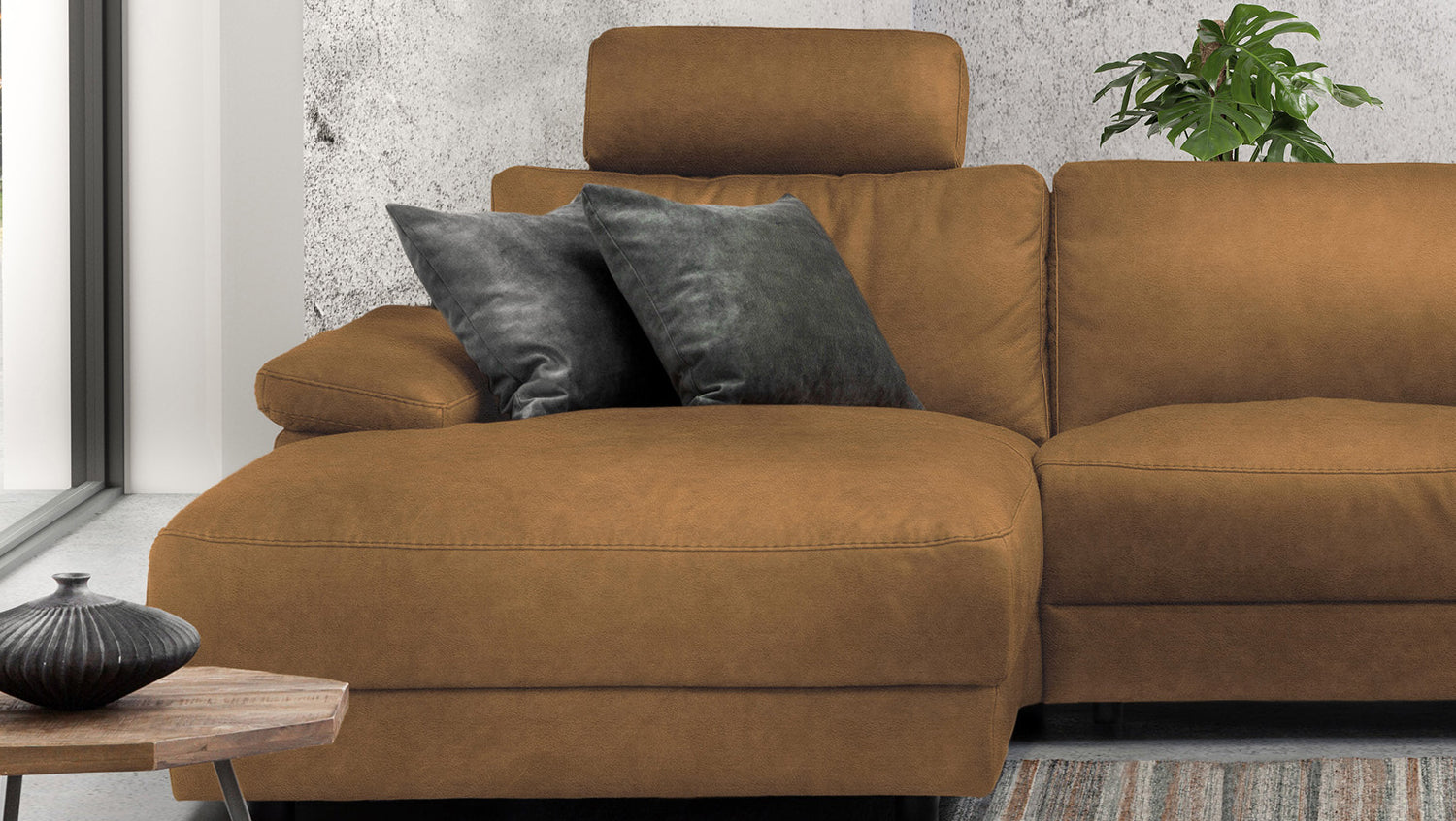 KAWOLA Sofá LOLA Sofá esquinero XL coñac con función relax motorizada varias fundas fundas