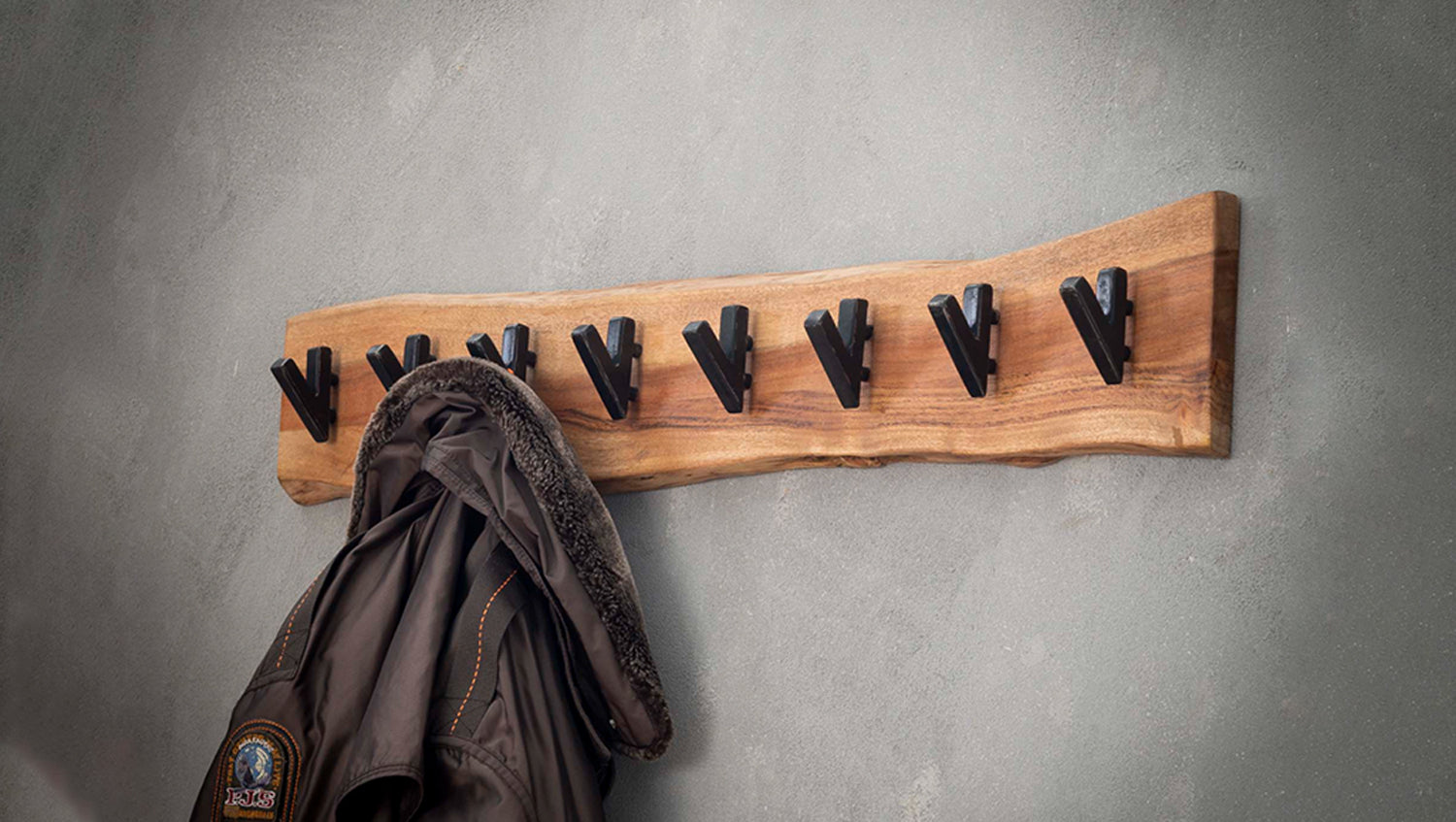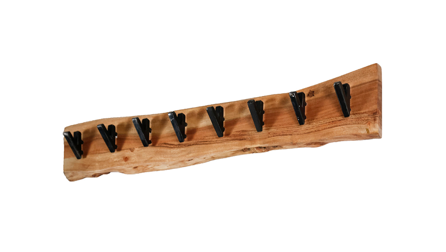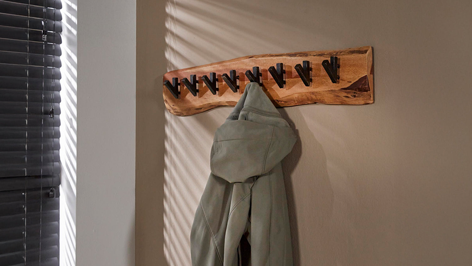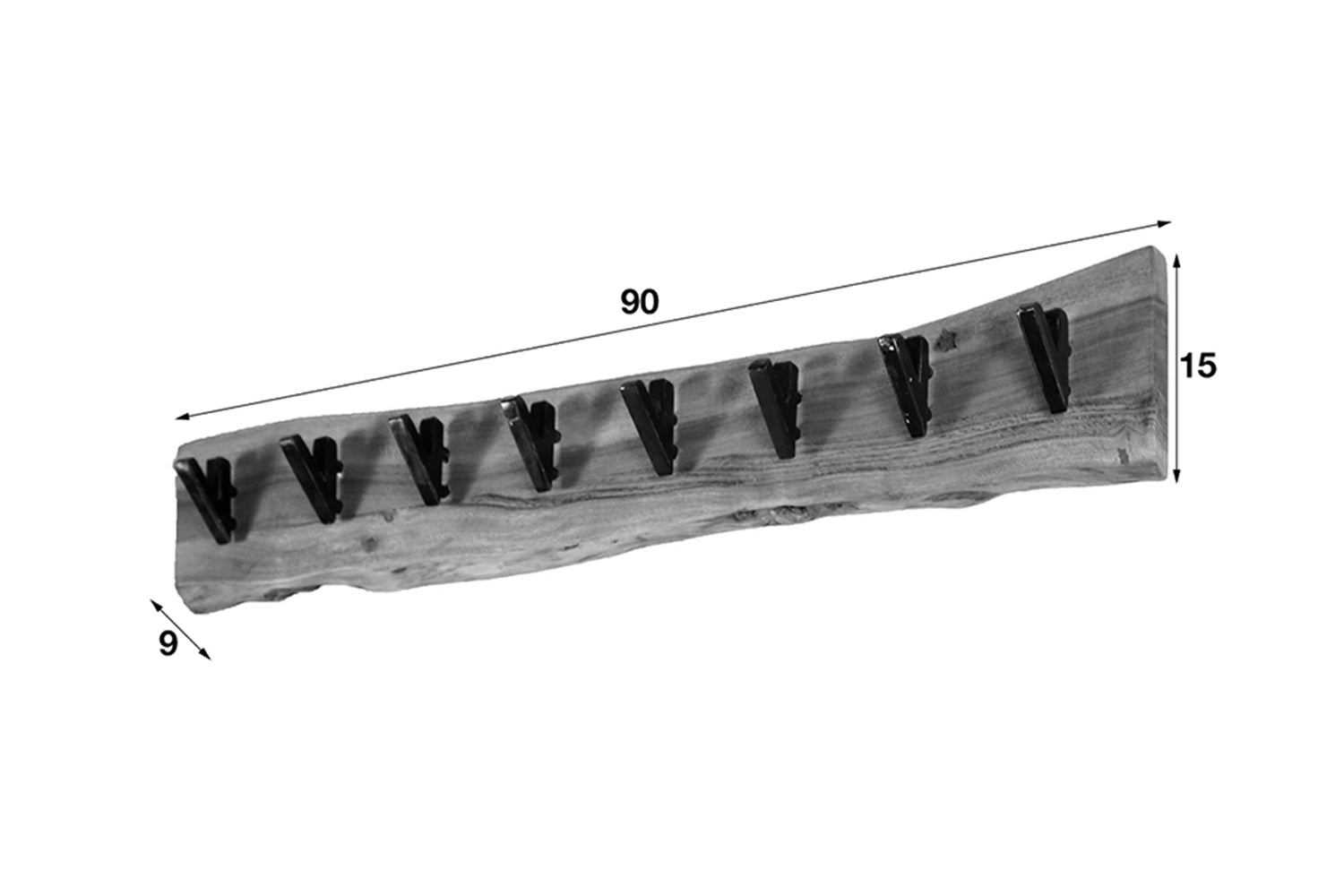 El perchero de pared NEREA de KAWOLA impresiona por su diseño único y natural. Fabricado en madera maciza de acacia, impresiona por sus finas vetas y llamativos nudos, que le confieren un encanto especial. La madera se procesa siguiendo métodos tradicionales, lo que confiere al Guardarropa un aspecto natural y único. Ocho robustos ganchos de metal pulido negro ofrecen espacio para chaquetas, bolsos y accesorios. Gracias a los dos ojales de la parte trasera, el Guardarropa de 90 cm de ancho, 15 cm de alto y 9 cm de profundidad puede montarse fácilmente en la pared. Elegante, compacto y funcional: ¡NEREA es la elección perfecta para el recibidor, el pasillo o el dormitorio!