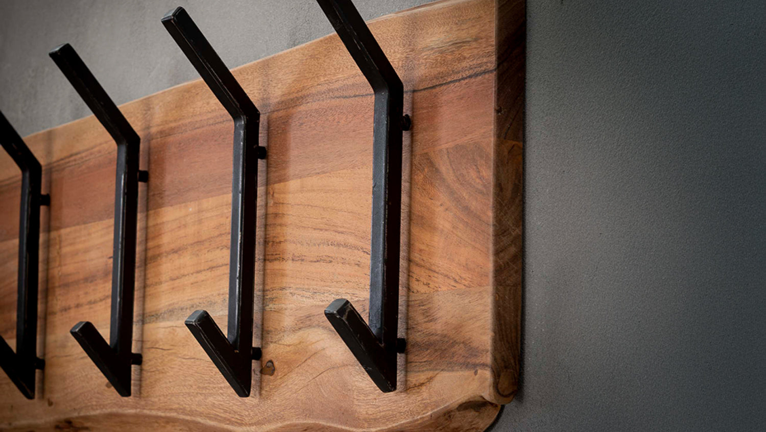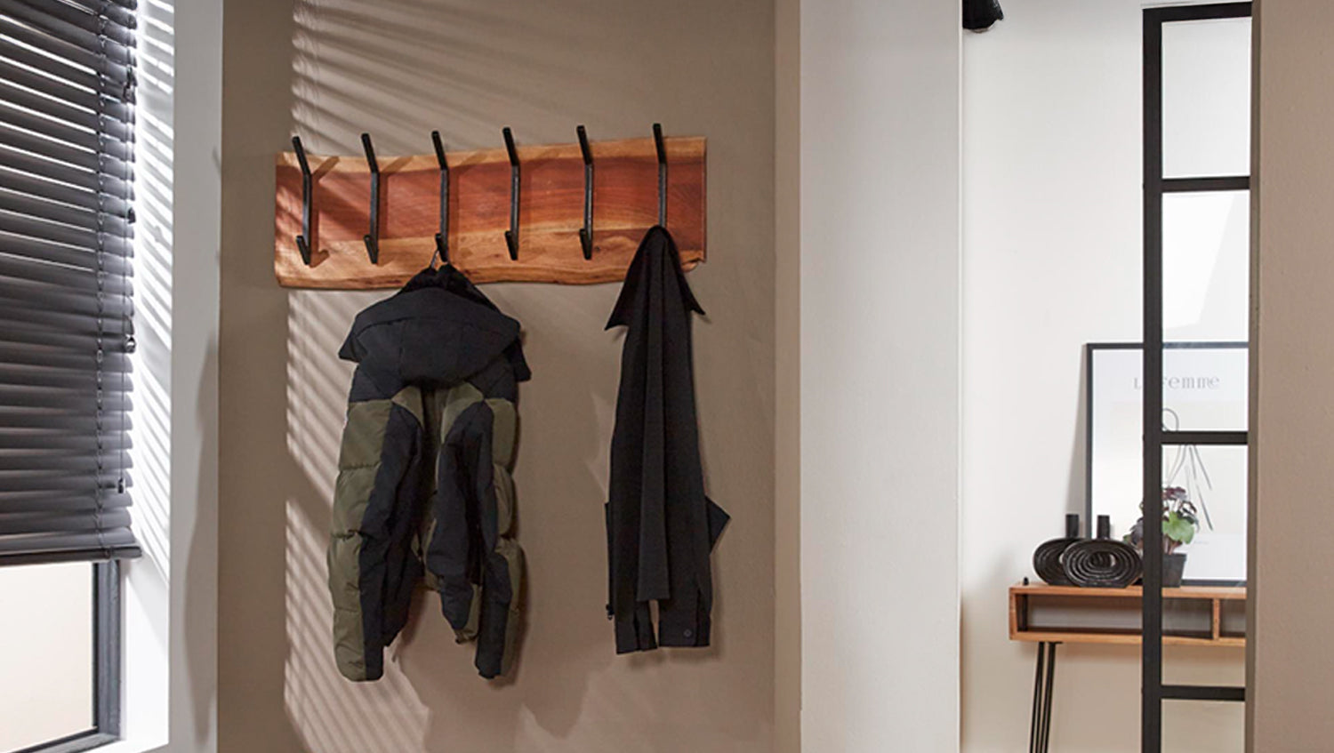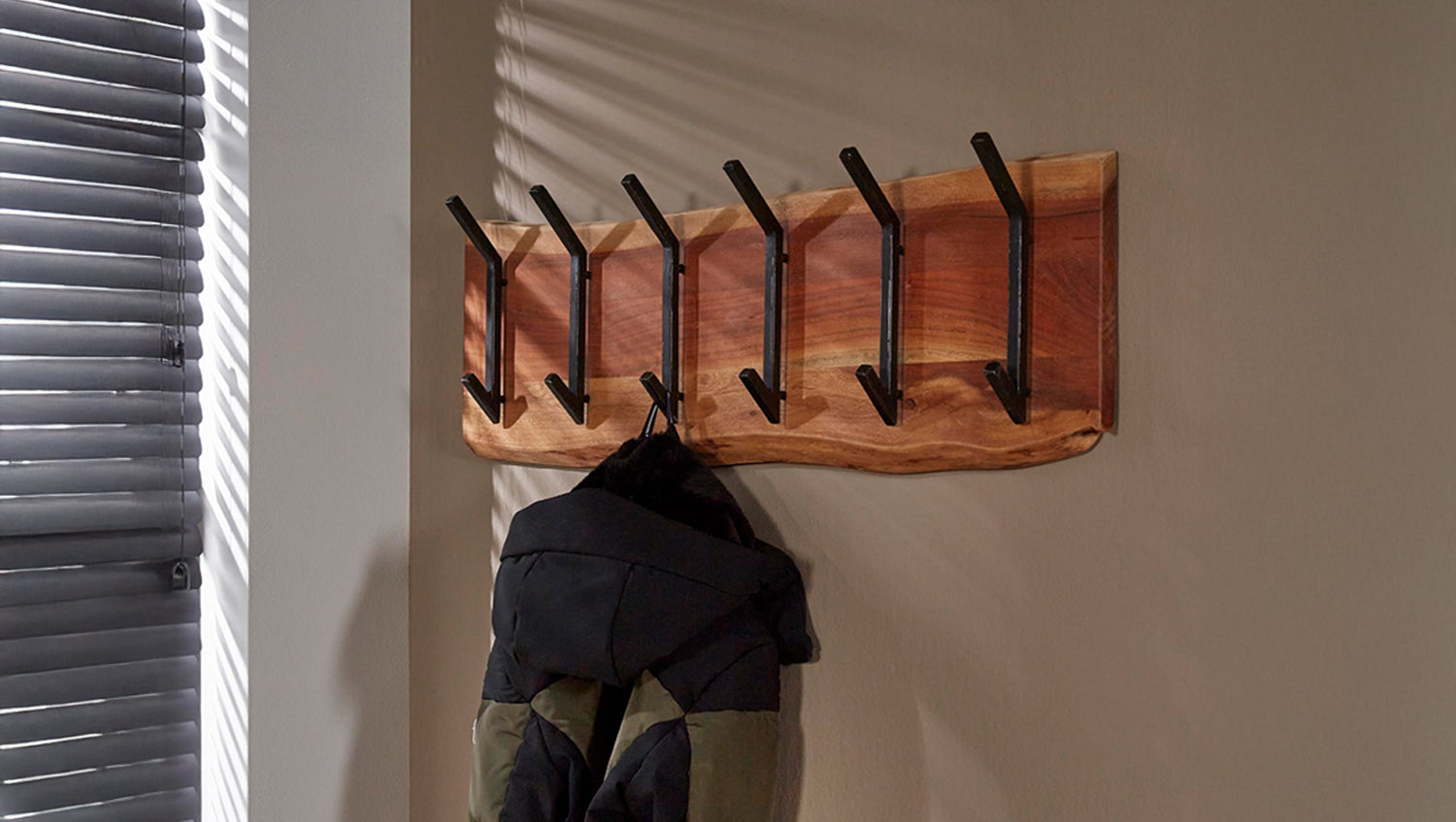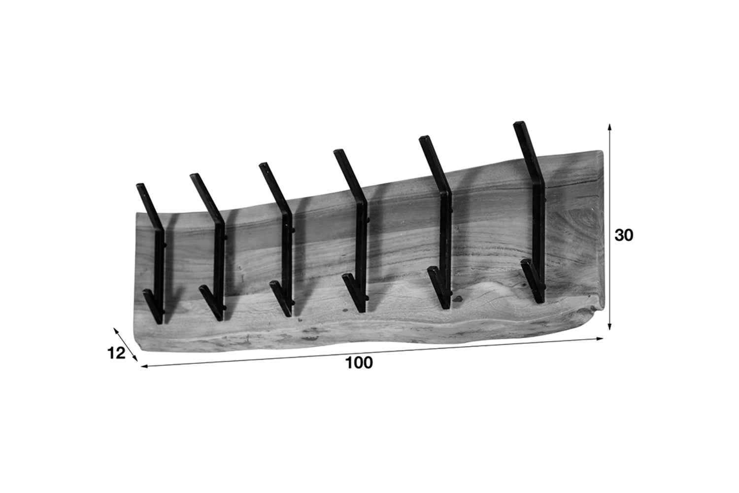 El perchero de pared NEREA de KAWOLA impresiona por su diseño único y natural. Fabricado en madera maciza de acacia, impresiona por sus finas vetas y llamativos nudos, que le confieren un encanto especial. La madera se procesa siguiendo métodos tradicionales, lo que confiere al Guardarropa un aspecto natural y único. 12 robustos ganchos de metal pulido negro ofrecen espacio para chaquetas, bolsos y accesorios. Gracias a los dos ojales de la parte trasera, el Guardarropa de 100 cm de ancho, 30 cm de alto y 12 cm de profundidad puede montarse fácilmente en la pared. Elegante, compacto y funcional: ¡NEREA es la elección perfecta para el recibidor, el pasillo o el dormitorio!