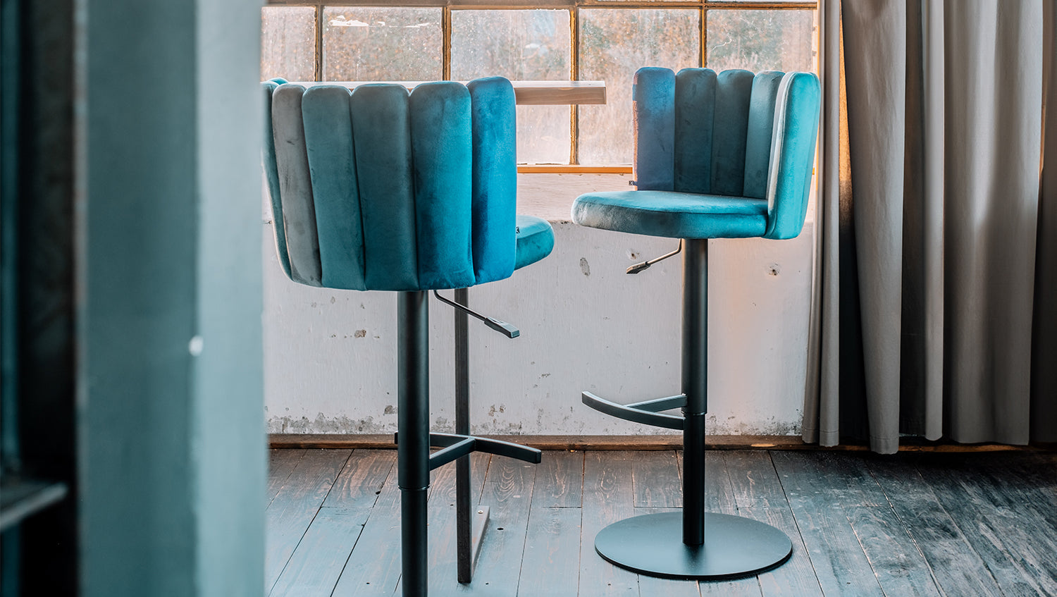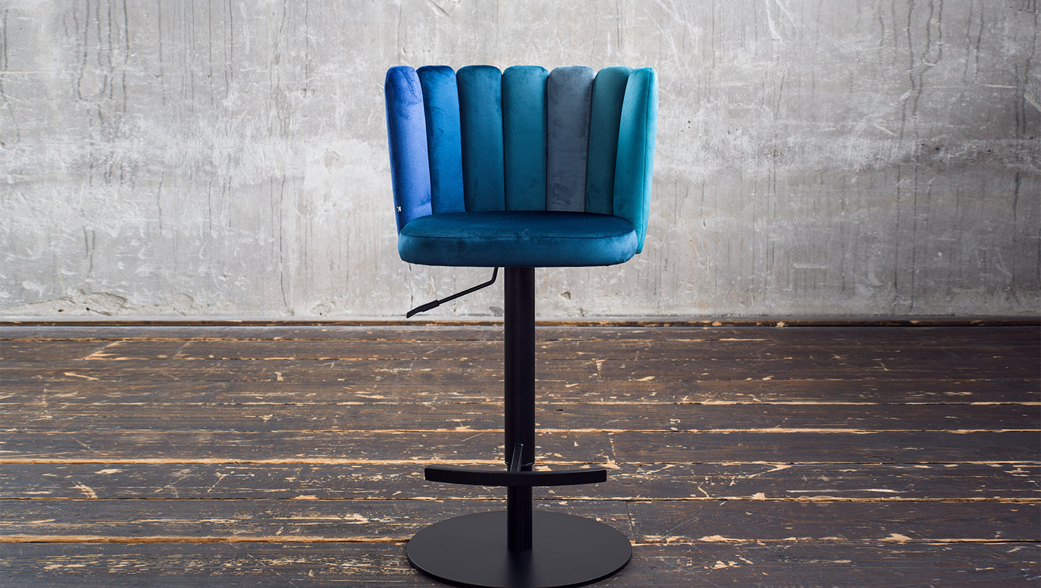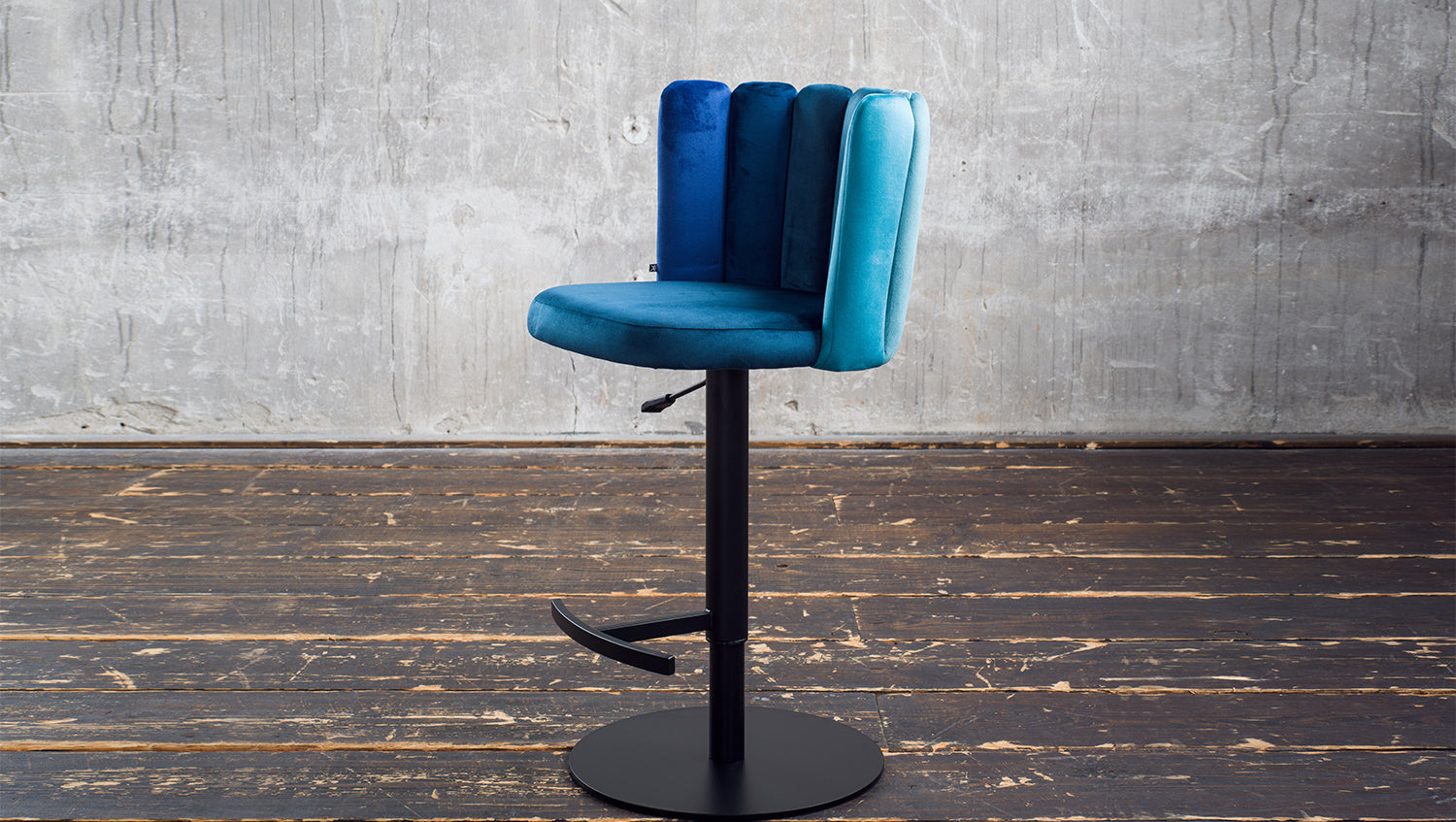 KAWOLA taburete de bar JADA silla giratoria regulable en altura Terciopelo azul