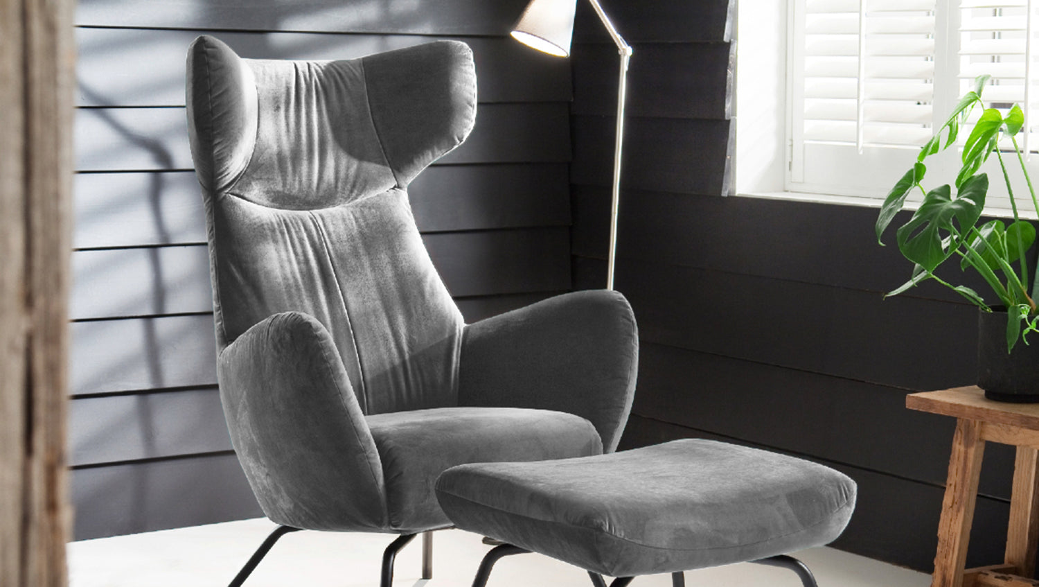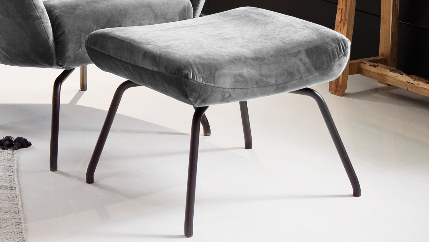 KAWOLA sillón LOTTE wing chair terciopelo plata con Puf