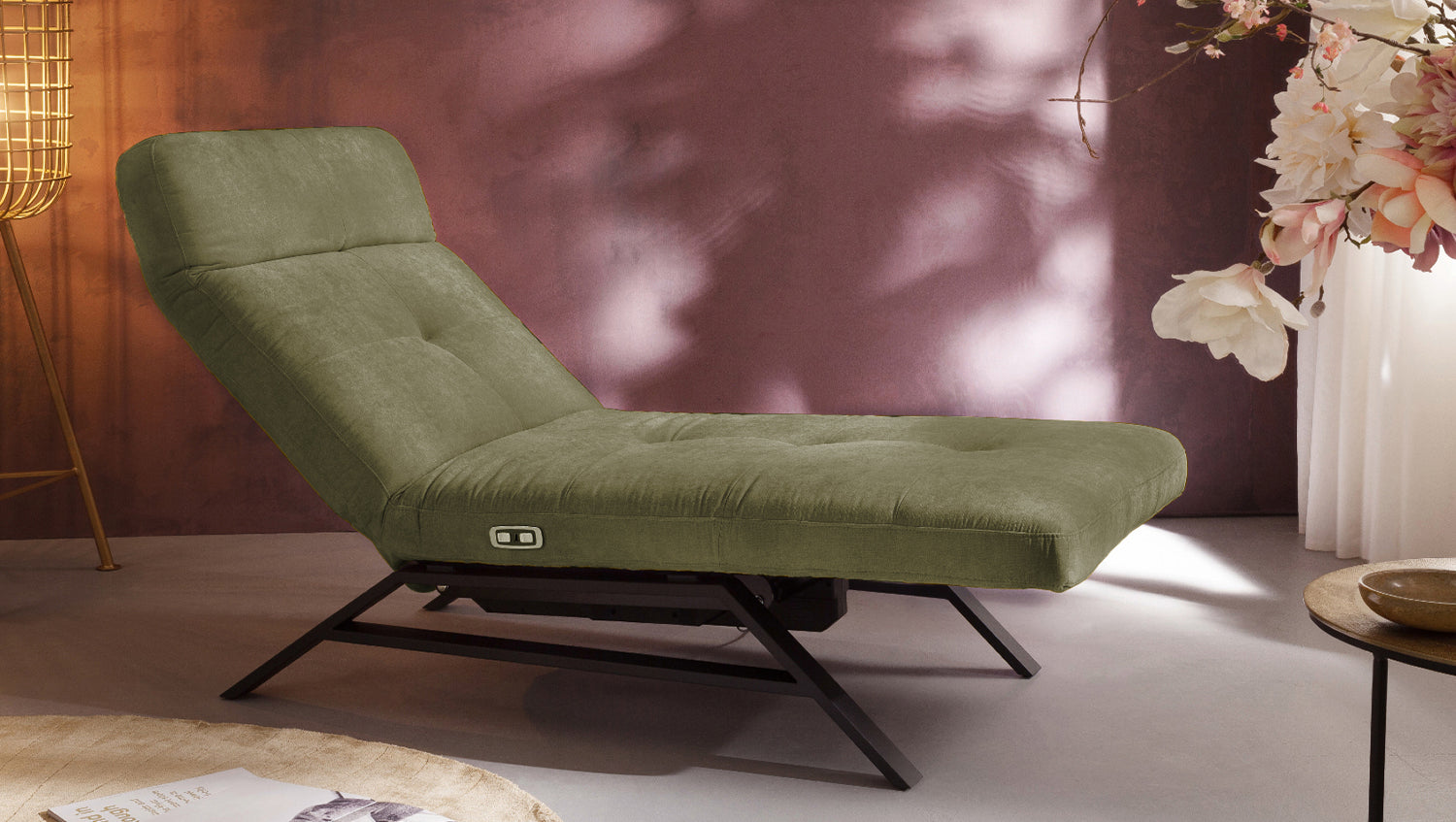 La Chaise longue AMERIVA de KAWOLA es una maravillosa combinación de diseño y funcionalidad. Las guías metálicas en negro mate contrastan con el moderno tejido de terciopelo. Sin embargo, la chaise longue no es sólo un verdadero atractivo visual, sino que también cumple todos los deseos en cuanto a funcionalidad. La función motorizada, que puede accionarse con los botones del lado derecho, ofrece una posición de reclinación infinitamente ajustable. La Chaise longue también dispone de conexión USB. La versatilidad de este mueble es tan variada como sus funciones: La chaise longue AMERIVA no sólo es ideal para el salón de casa, sino también para el vestíbulo o la sala de descanso.