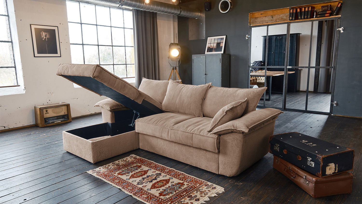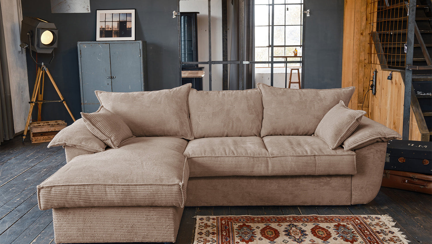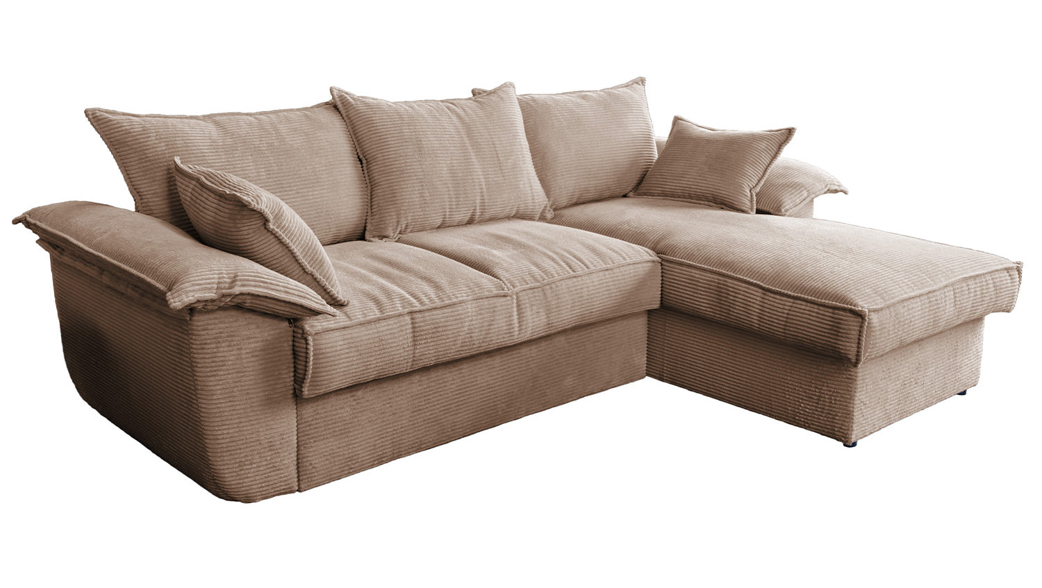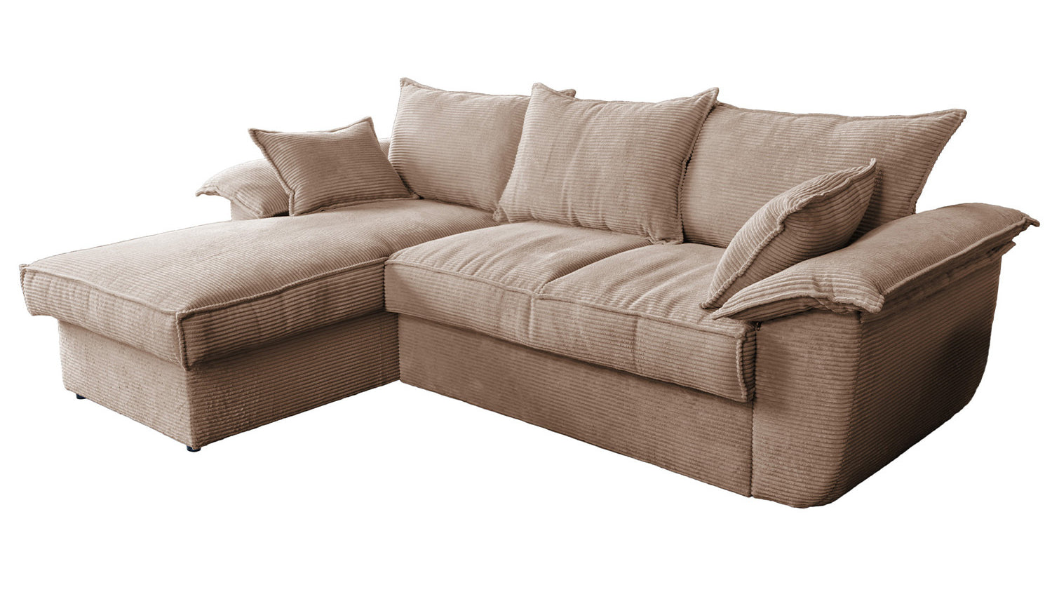 El sofá KAWOLA DAMETO es el nuevo todoterreno de nuestra gama. Con su moderno revestimiento de tela de pana, no sólo atrae todas las miradas, sino que su acolchado agradablemente suave también garantiza la máxima comodidad de asiento. Pero, sobre todo, convence por sus múltiples funciones adicionales. El sofá esquinero puede transformarse en un cómodo sofá cama en unos pocos pasos: basta con tirar de la parte inferior del sofá de 2 plazas hacia delante, plegarla hacia arriba y ¡listo! Pero eso no es todo: el sillón largo dispone de un generoso espacio de almacenamiento que puede abrirse sin esfuerzo abatiendo el asiento. El sillón largo también puede colocarse a ambos lados, lo que le ofrece la máxima flexibilidad para el diseño de su salón. Tanto a la izquierda como a la derecha, podrá adaptar fácilmente el sofá a su espacio. Cómodo, elegante, versátil y práctico, el sofá DAMETO se convertirá en la nueva estrella de su salón.