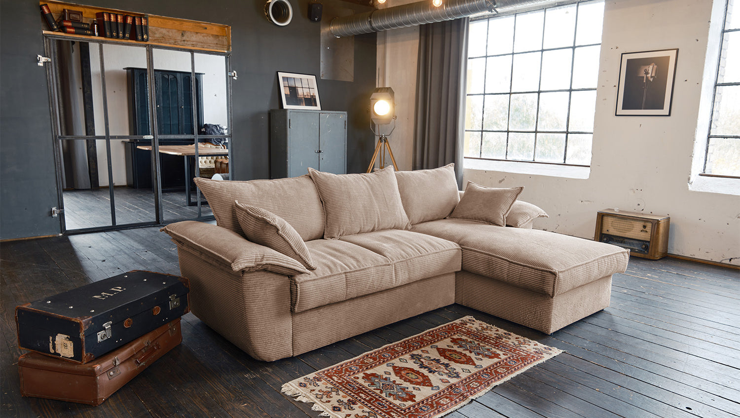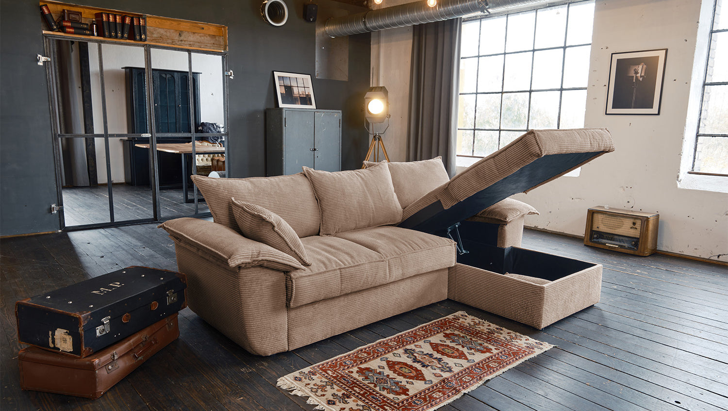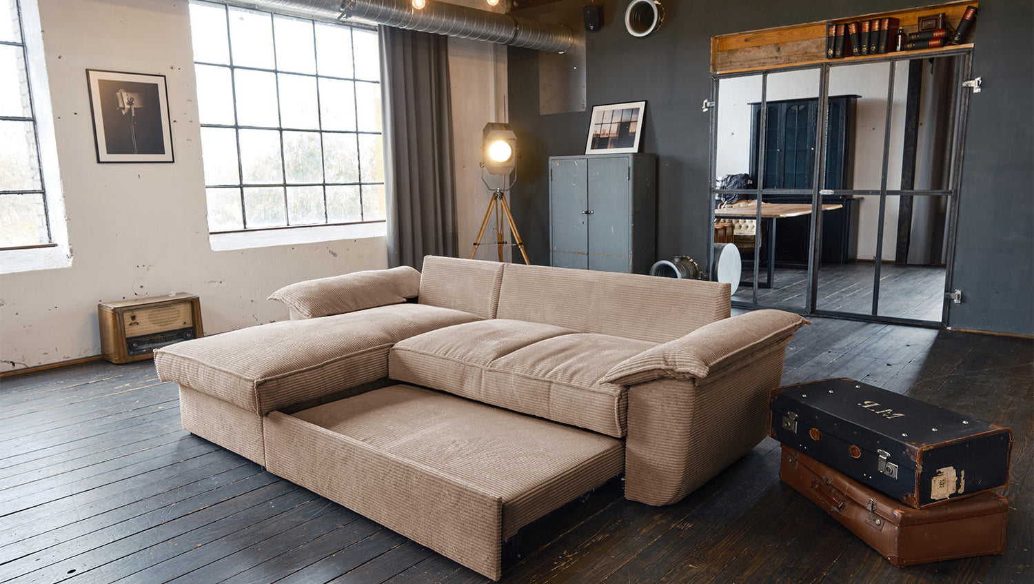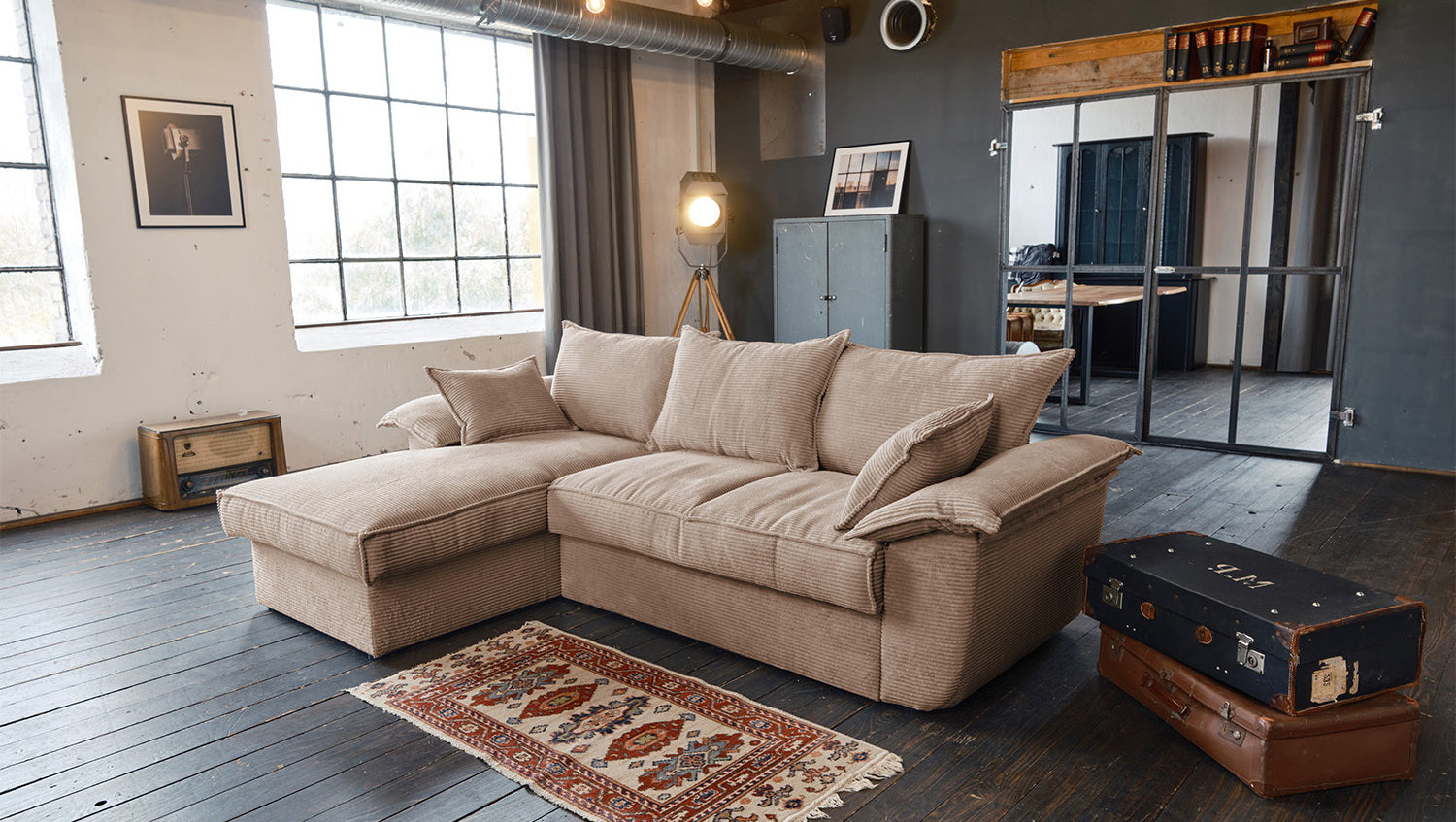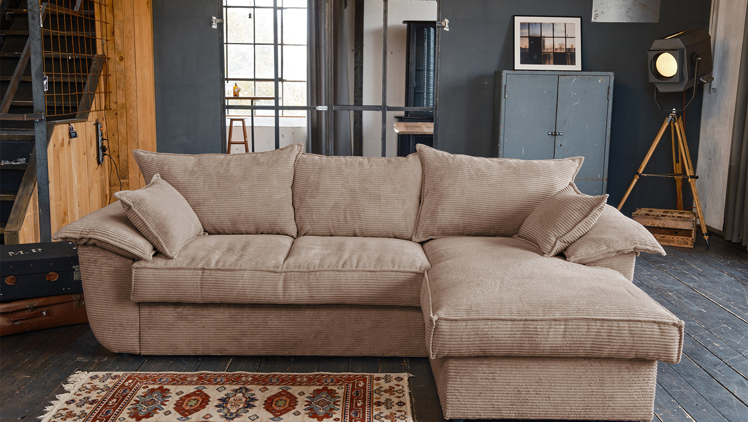 El sofá KAWOLA DAMETO es el nuevo todoterreno de nuestra gama. Con su moderno revestimiento de tela de pana, no sólo atrae todas las miradas, sino que su acolchado agradablemente suave también garantiza la máxima comodidad de asiento. Pero, sobre todo, convence por sus múltiples funciones adicionales. El sofá esquinero puede transformarse en un cómodo sofá cama en unos pocos pasos: basta con tirar de la parte inferior del sofá de 2 plazas hacia delante, plegarla hacia arriba y ¡listo! Pero eso no es todo: el sillón largo dispone de un generoso espacio de almacenamiento que puede abrirse sin esfuerzo abatiendo el asiento. El sillón largo también puede colocarse a ambos lados, lo que le ofrece la máxima flexibilidad para el diseño de su salón. Tanto a la izquierda como a la derecha, podrá adaptar fácilmente el sofá a su espacio. Cómodo, elegante, versátil y práctico, el sofá DAMETO se convertirá en la nueva estrella de su salón.