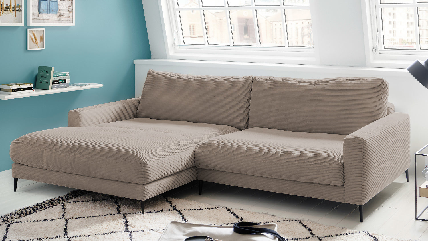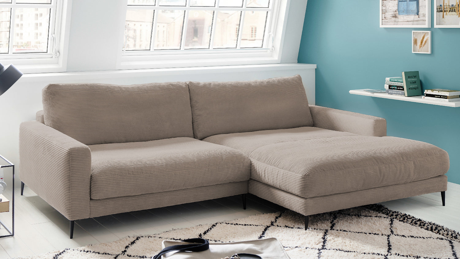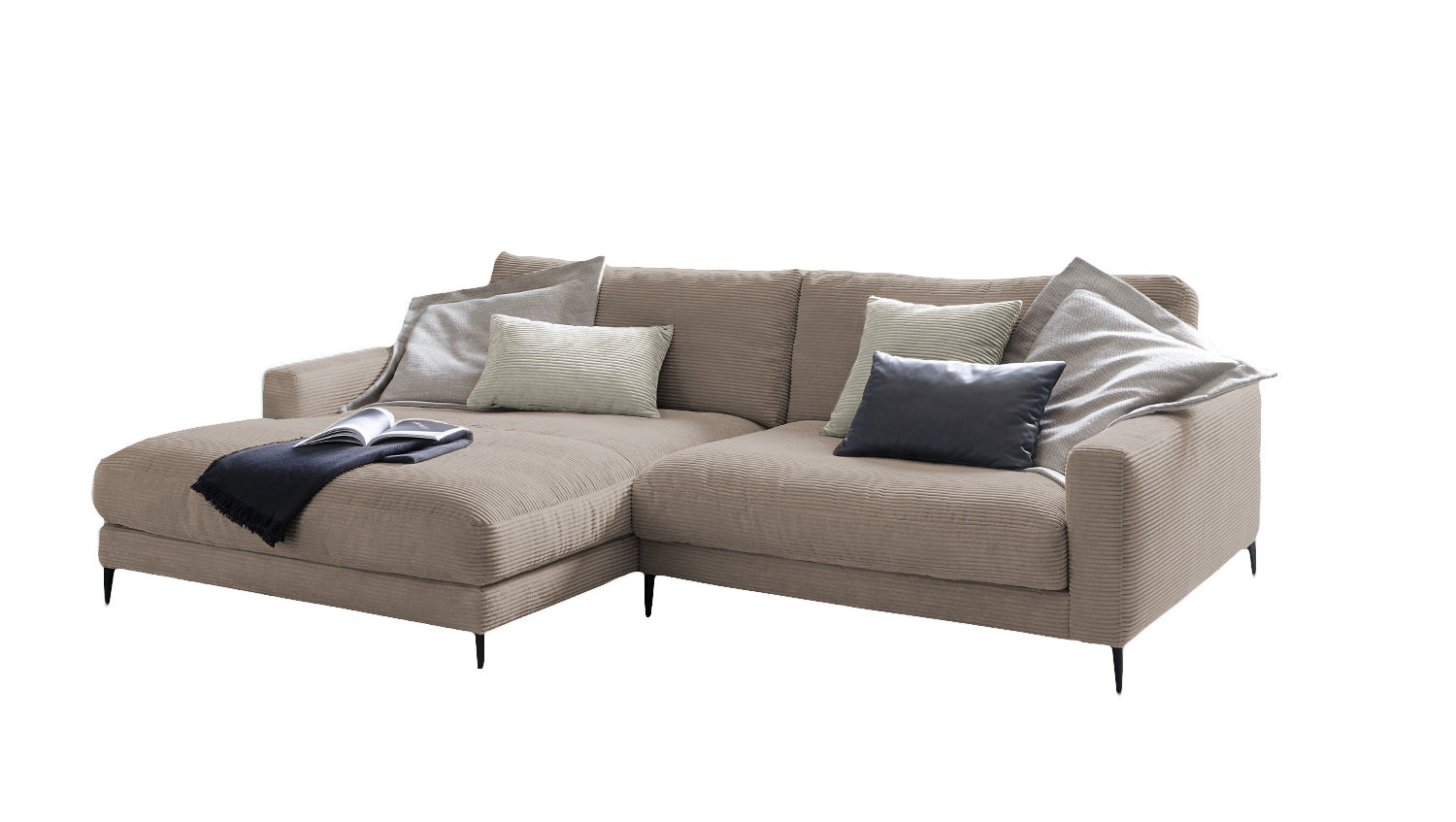 El sofá esquinero KAWOLA CARA combina el diseño clásico con la practicidad moderna y se integra a la perfección en cualquier interior. Sus formas suaves y el moderno revestimiento de tela Pana confieren al sofá una elegancia atemporal. La tapicería se amolda a la forma del cuerpo; las impresiones del asiento y las ondulaciones de la tapicería son típicas del producto. El asiento consta de una base de muelles con muelles ondulados de acero de elasticidad permanente y una funda superior, así como cojines de asiento sueltos de espuma de poliuretano. El asiento y el respaldo están tapizados con un relleno de alta calidad que contiene una mezcla de plumas. Para evitar que el material de relleno se comprima, los Cojines respaldo deben sacudirse después de su uso. Sea cual sea la ocasión, en el sofá CARA todos encontrarán un lugar para relajarse.