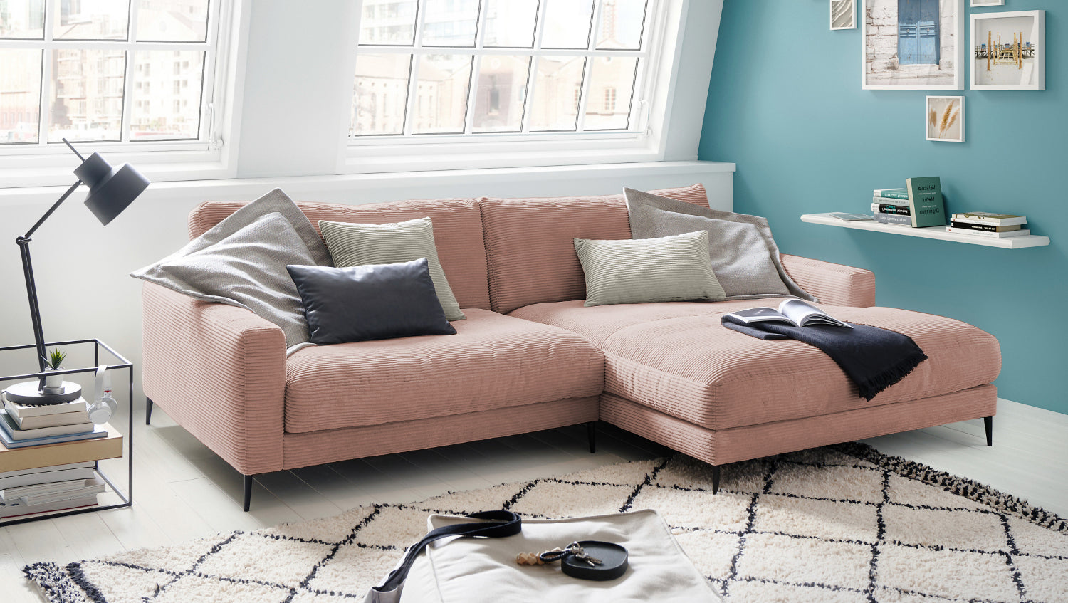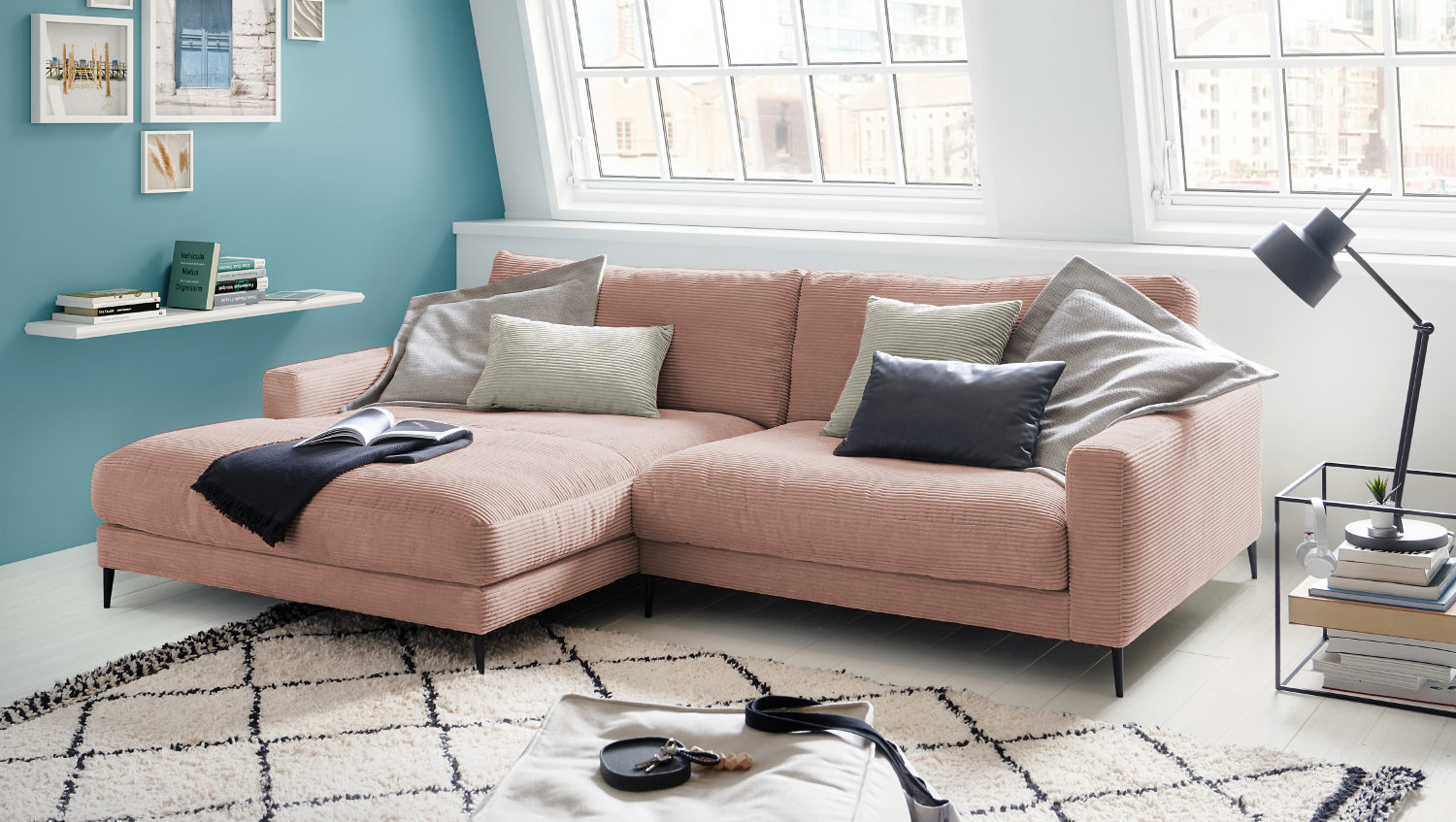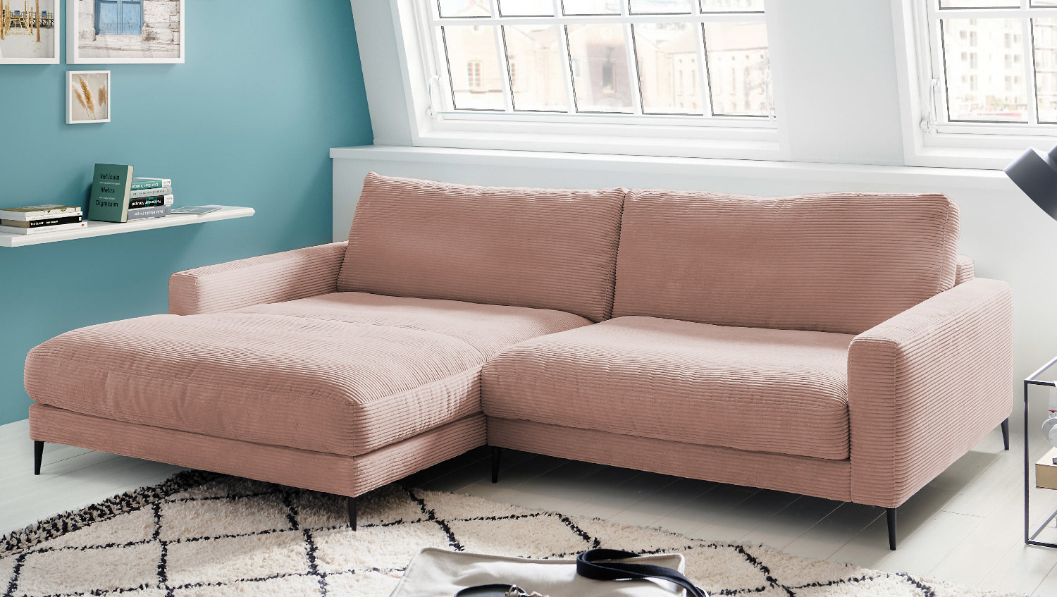 KAWOLA sofá esquinero CARA sofá pana rosa