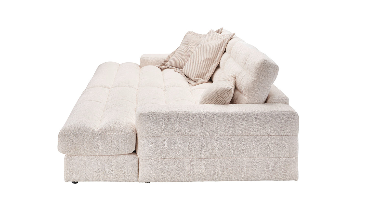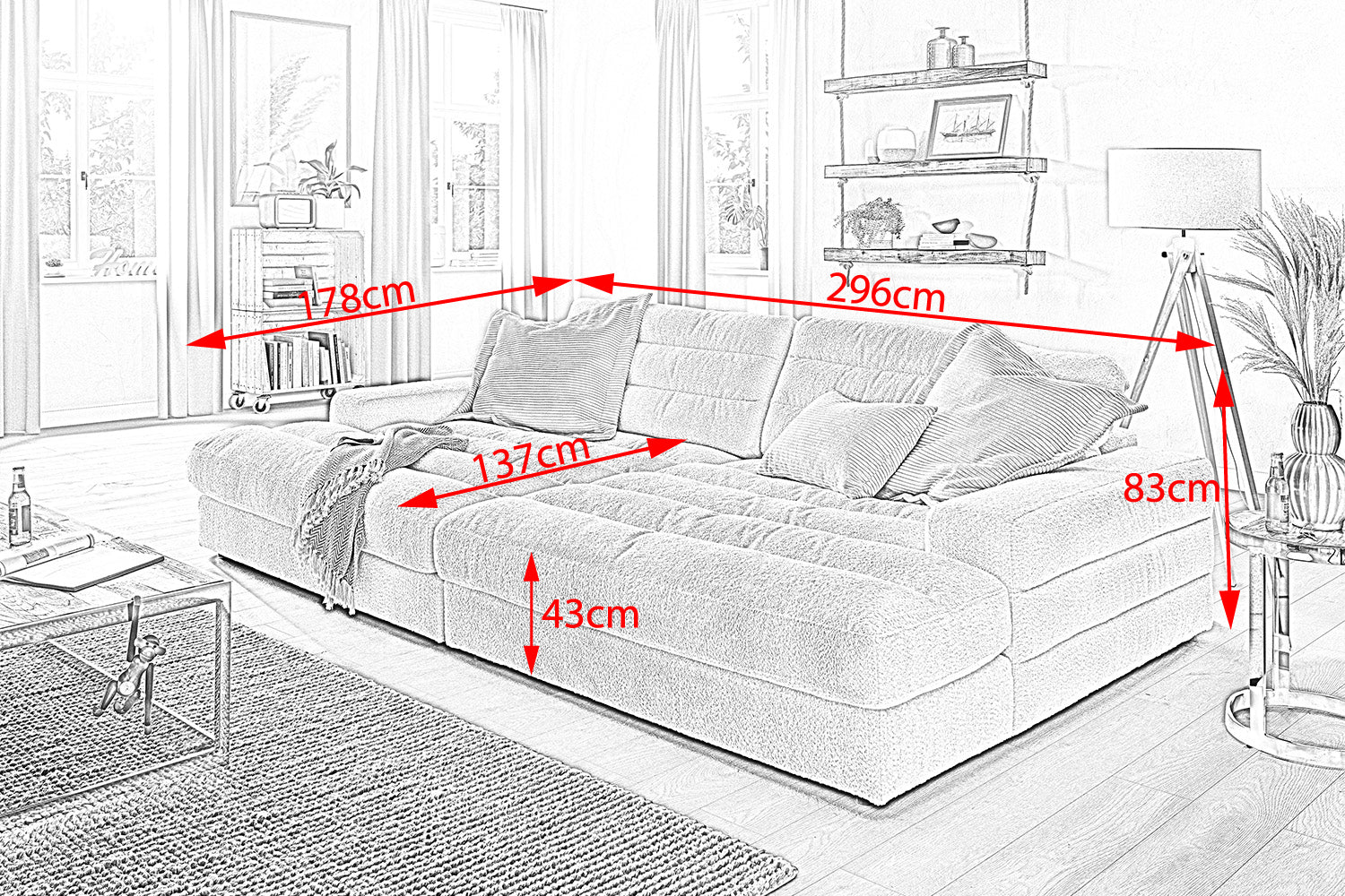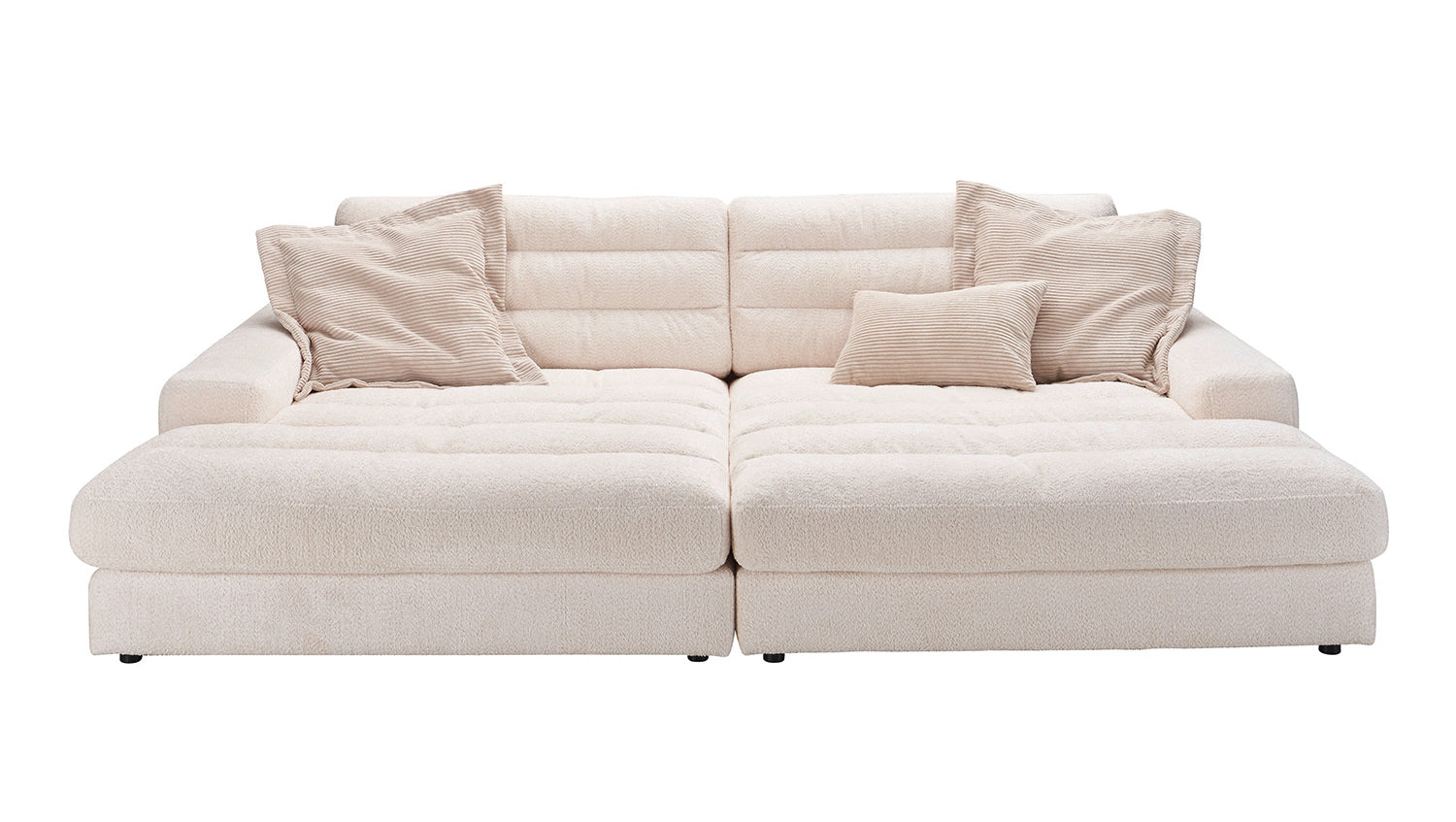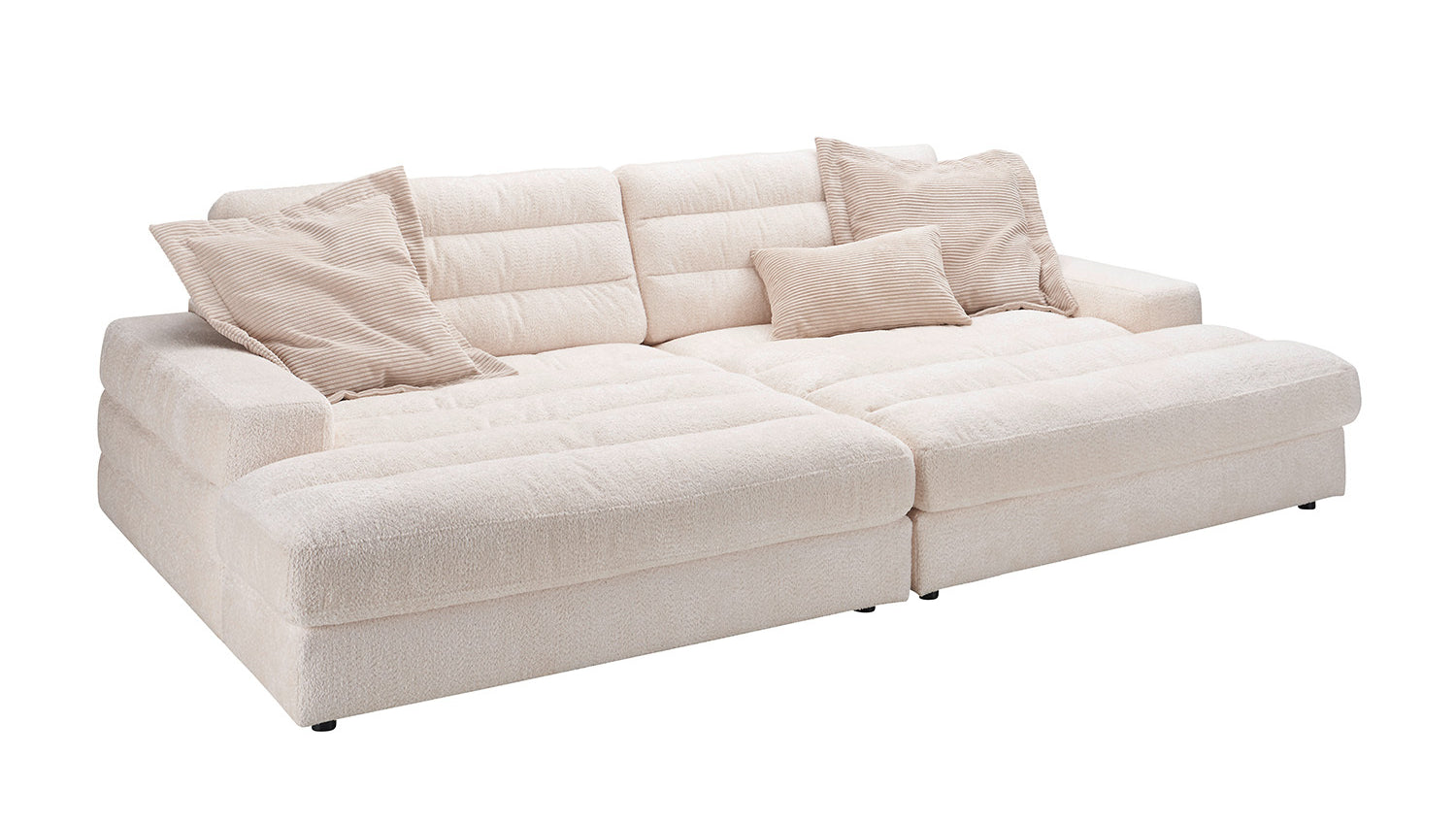El Sofá extra ancho KAWOLA LANA impresiona por su estilo y elegancia. La funda, agradablemente suave, recuerda a la lana de oveja, tanto a la vista como al tacto, y garantiza un mullido placer al sentarse. El diseño clásico confiere al sofá una belleza atemporal que confiere a su salón un ambiente de bienestar único. La tapicería garantiza la máxima comodidad y se adapta a la forma del cuerpo. Las impresiones del asiento y las ondulaciones de las fundas son típicas del producto. El asiento consta de una base de muelles con muelles ondulados de acero de elasticidad permanente y una funda superior, así como cojines de asiento sueltos de espuma de poliuretano. El asiento y el respaldo están tapizados con un relleno de alta calidad que contiene una mezcla de plumas. Para evitar que el material de relleno se comprima, los cojines respaldo y asiento deben sacudirse después de cada uso. Relájese en el sofá KAWOLA LANA y déjese llevar lejos de la gris vida cotidiana...