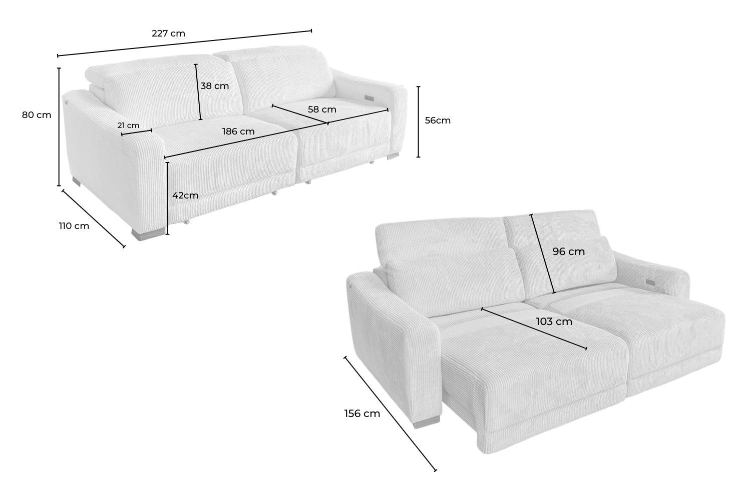 El sofá de 3 plazas KIANA impresiona por su acertada combinación de diseño moderno, características funcionales y un confort excepcional. Con su elegante revestimiento de pana, se integra armoniosamente en una gran variedad de estilos de vida y se convierte rápidamente en la pieza central del salón. Las rayas tridimensionales de pana confieren a la tela una textura elegante y garantizan un tacto agradablemente suave, cálido y grueso que invita a relajarse. Una característica especial del sofá son las dos funciones integradas de extensión del asiento, tanto en el asiento izquierdo como en el derecho, que permiten transformar KIANA en un Sofá extra ancho en un abrir y cerrar de ojos. Ambos lados pueden ajustarse cómodamente de forma eléctrica y permiten regular de forma continua la profundidad del asiento y del respaldo. Cuando está completamente extendido, el sofá alcanza una profundidad de hasta 156 cm y una profundidad de asiento de aproximadamente 102 cm, ideal para reclinarse, estirarse y desconectar. Para mayor comodidad, el sofá dispone de dos reposacabezas ajustables individualmente hasta una altura máxima de 96 cm. KIANA es la elección ideal para todo aquel que busque un sofá funcional de alta calidad con un aspecto elegante que impresione tanto por sus características funcionales como por su aspecto acogedor. Ya sea para pasar la tarde frente al televisor, echar una cabezadita o simplemente para sentirse bien, este sofá ofrece el máximo confort con sólo pulsar un botón.