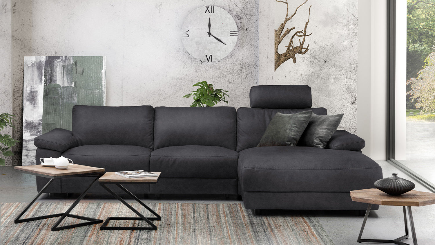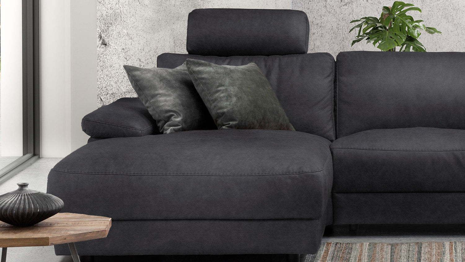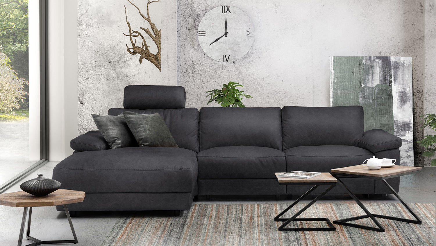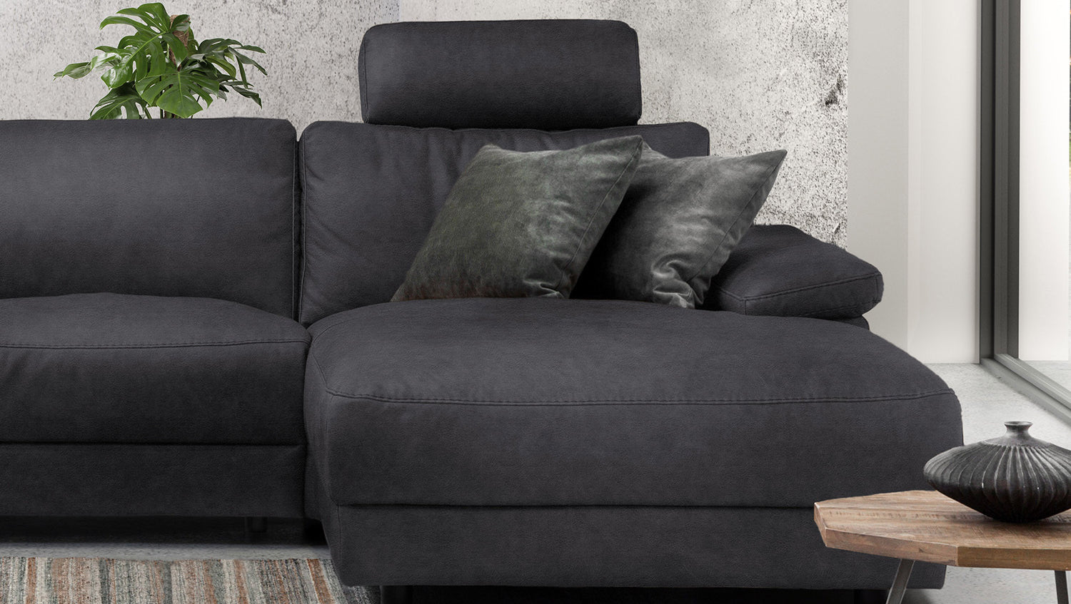 El sofá esquinero KAWOLA LOLA convence por su aspecto atemporal. Además, este mueble es muy funcional. El elemento de asiento derecho dispone de una función de reclinación motorizada que permite desplazar el respaldo hacia atrás y extender el reposapiés. Otro elemento destacado es el reposacabezas con aspecto de cojín, que también puede ajustarse a voluntad. El armazón es de madera maciza encolada y las superficies del asiento y el respaldo son muy cómodas gracias a su estructura de varias capas. La funda de piel de alta calidad o de tela de estilo vintage es muy fácil de cuidar y confiere al sofá una elegancia clásica. Los pies de plástico empotrados con aspecto flotante crean un atractivo contraste. El acolchado muy desenfadado de los asientos, respaldos y reposabrazos ofrece además una gran comodidad de asiento. El sofá esquinero LOLA se integra a la perfección en cualquier entorno y destaca en cualquier lugar.