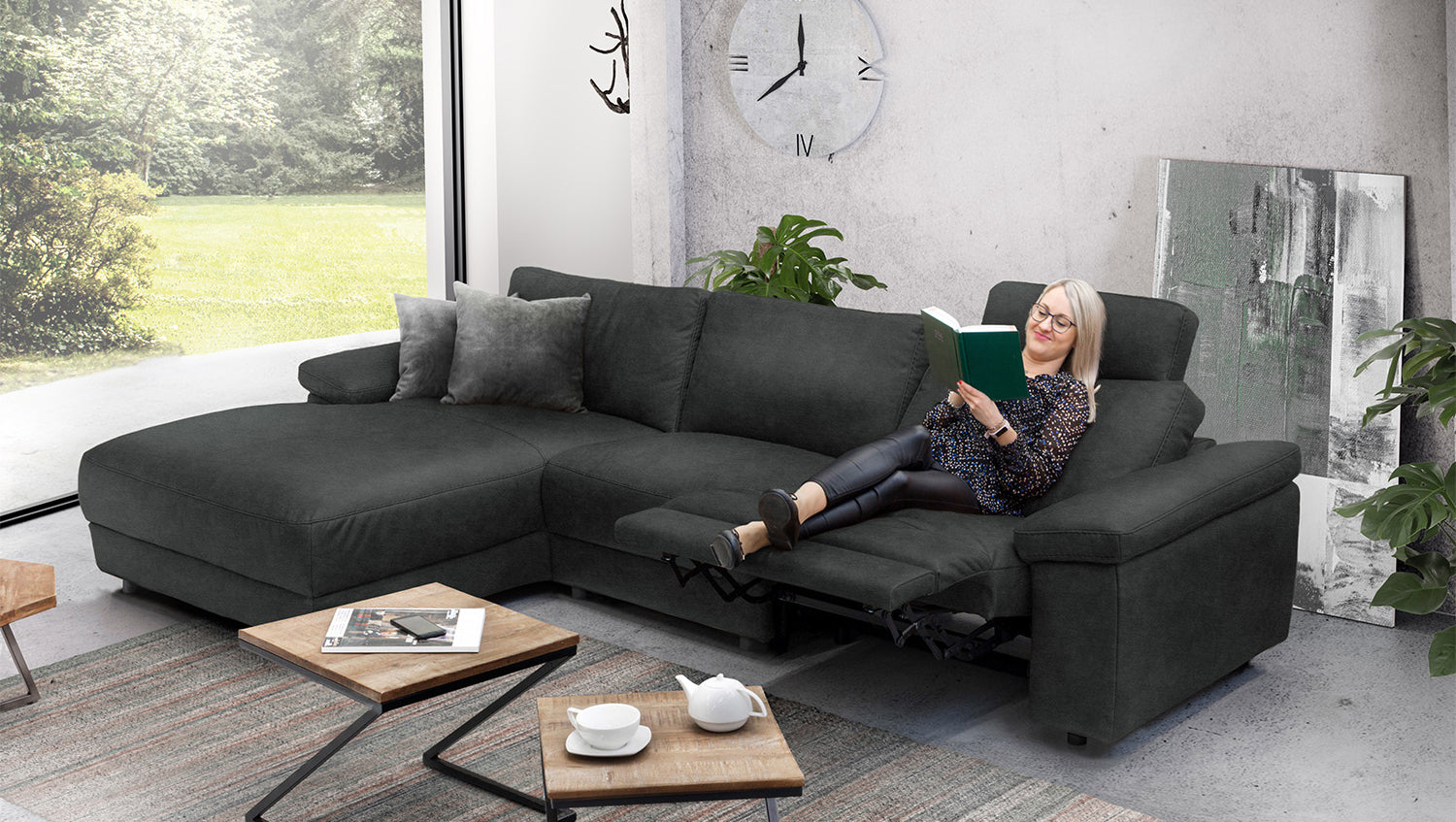 KAWOLA Sofá LOLA Sofá esquinero XL negro con función relax motorizada varias fundas fundas