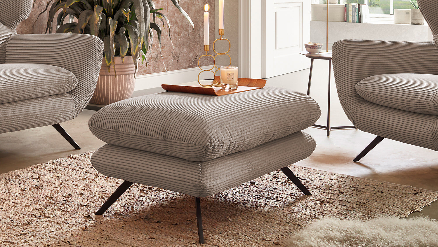 El taburete CHARME de KAWOLA es un banco taburete muy especial y pone nuevos acentos en el salón como auténtica pieza de diseño. El estilo del taburete CHARME recuerda a los años sesenta: en este caso se ha optado por el revestimiento de pana a juego con la forma inusual. Los pies de metal negro están ligeramente acampanados. El acolchado del banco taburete CHARME es de espuma PUR e impresiona por su comodidad de asiento suave y desenfadada. Naturalmente, el banco taburete está completamente revestido con la tela de pana, de modo que también puede colocarse en cualquier lugar de la habitación. Si no busca un simple taburete, sino un punto de atracción muy especial, ¡el banco taburete CHARME de KAWOLA es la elección perfecta!