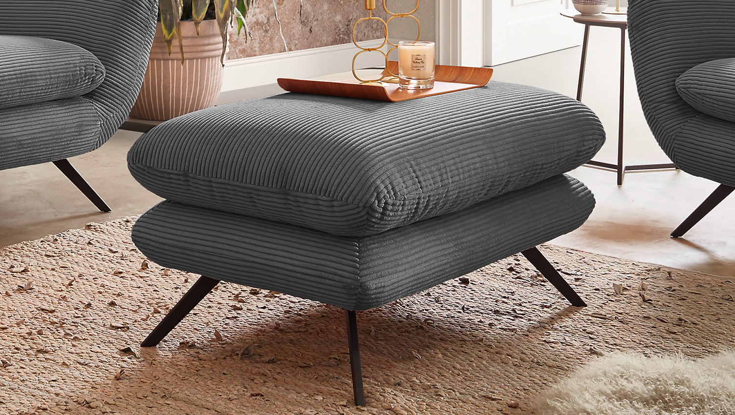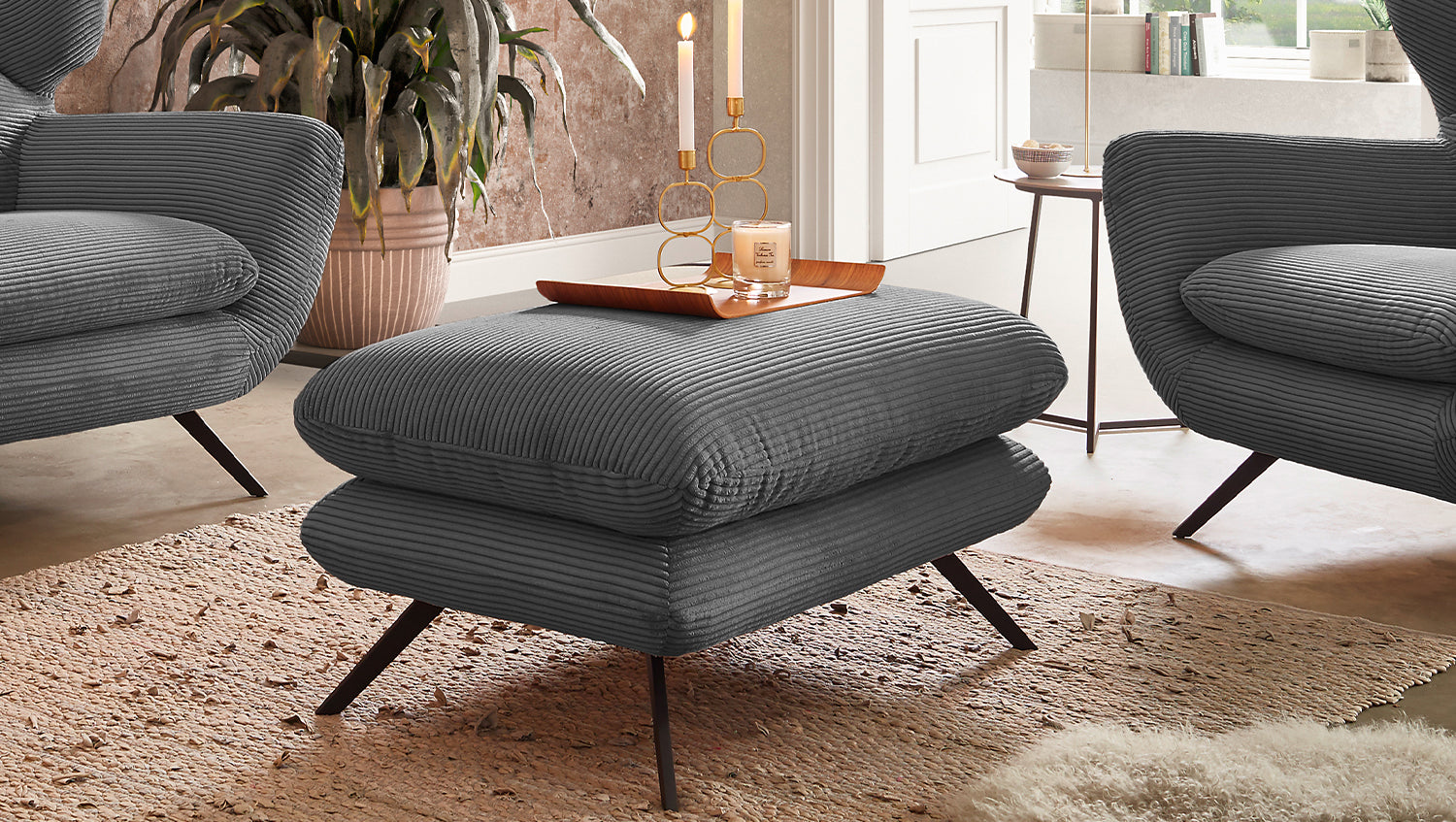 El taburete CHARME de KAWOLA es un banco taburete muy especial y pone nuevos acentos en el salón como auténtica pieza de diseño. El estilo del taburete CHARME recuerda a los años sesenta: en este caso se ha optado por el revestimiento de pana a juego con la forma inusual. Los pies de metal negro están ligeramente acampanados. El acolchado del banco taburete CHARME es de espuma PUR e impresiona por su comodidad de asiento suave y desenfadada. Naturalmente, el banco taburete está completamente revestido con la tela de pana, de modo que también puede colocarse en cualquier lugar de la habitación. Si no busca un simple taburete, sino un punto de atracción muy especial, ¡el banco taburete CHARME de KAWOLA es la elección perfecta!