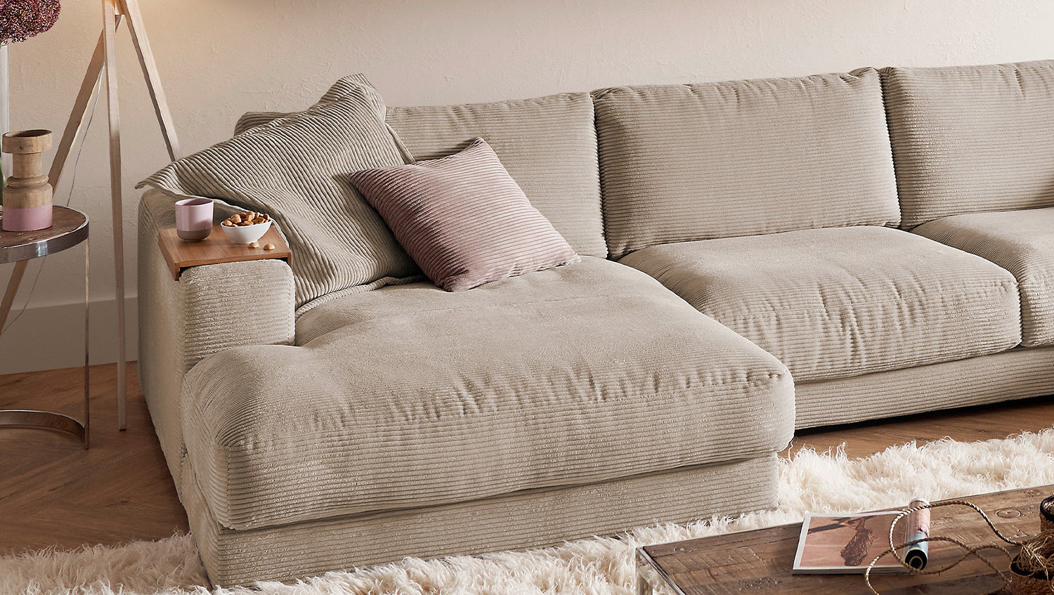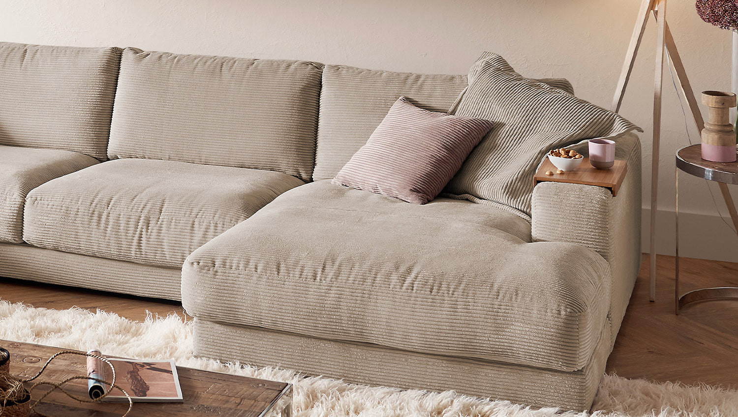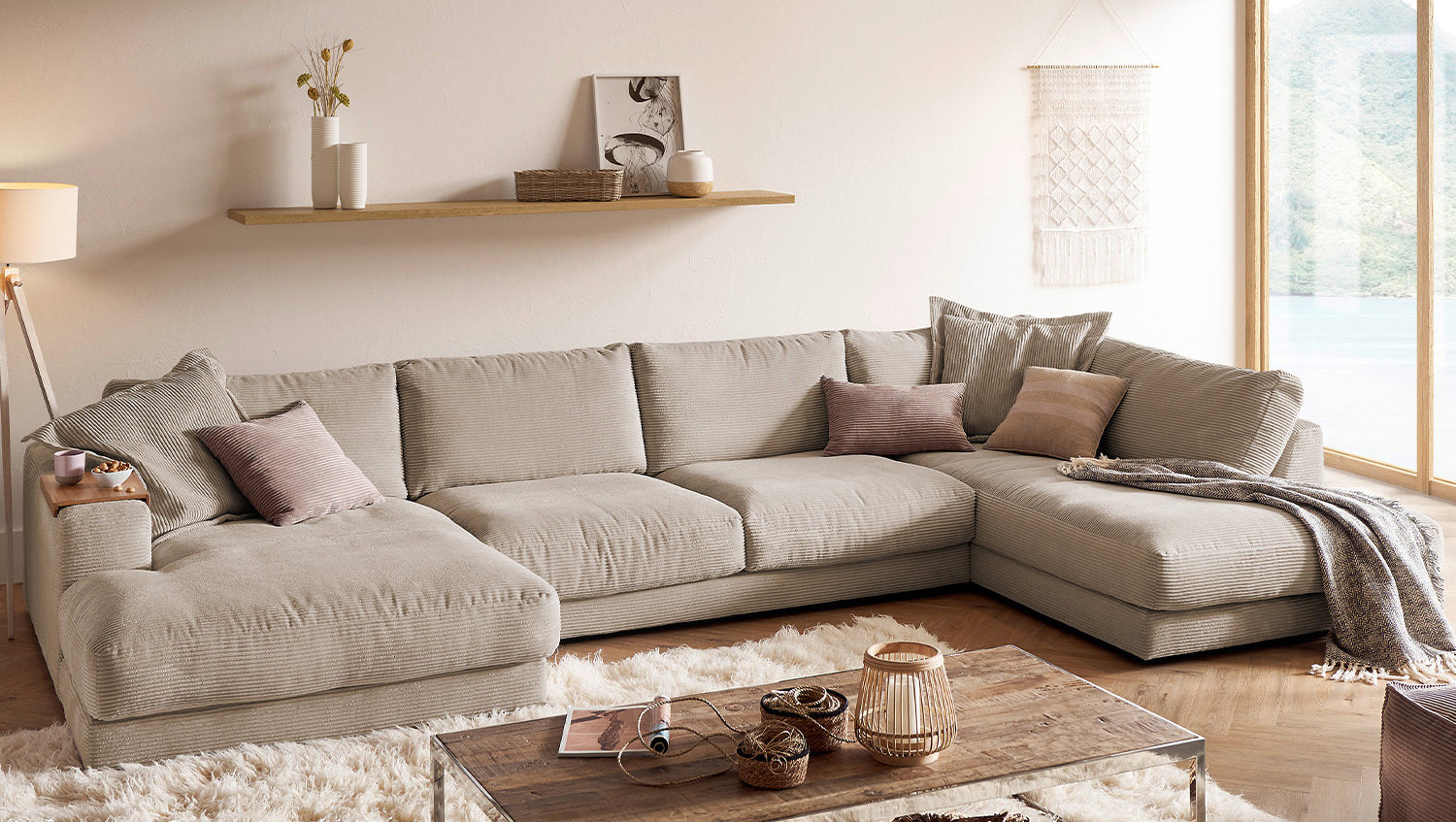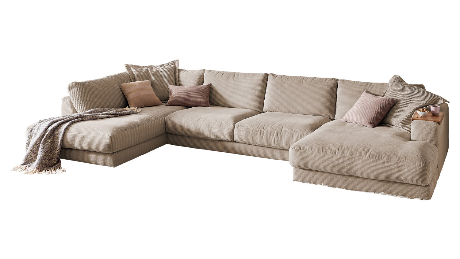 KAWOLA Sofá en forma de U MADELINE Pana taupe