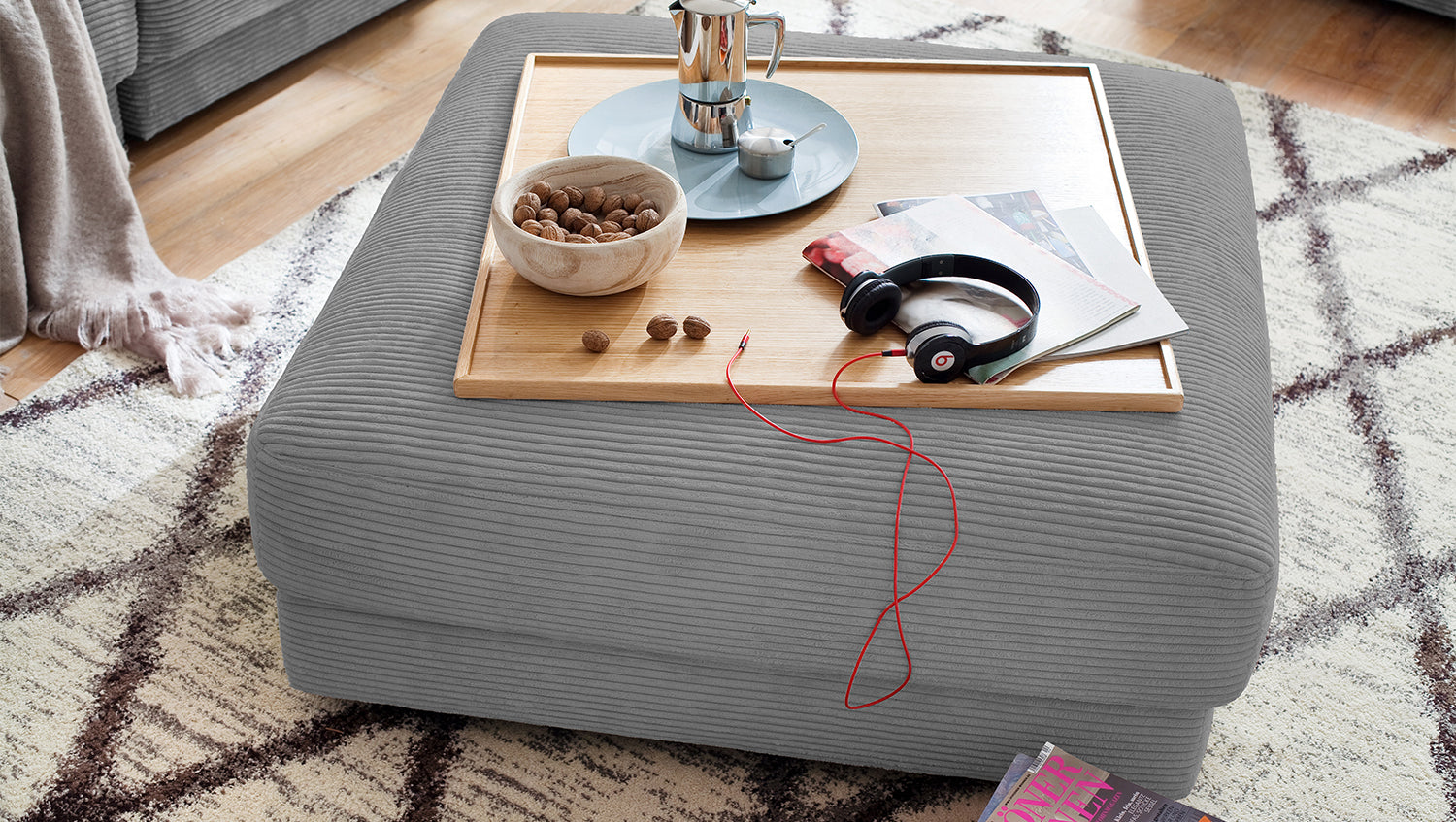 KAWOLA Taburete grande MADELINE taburete tapizado Pana gris