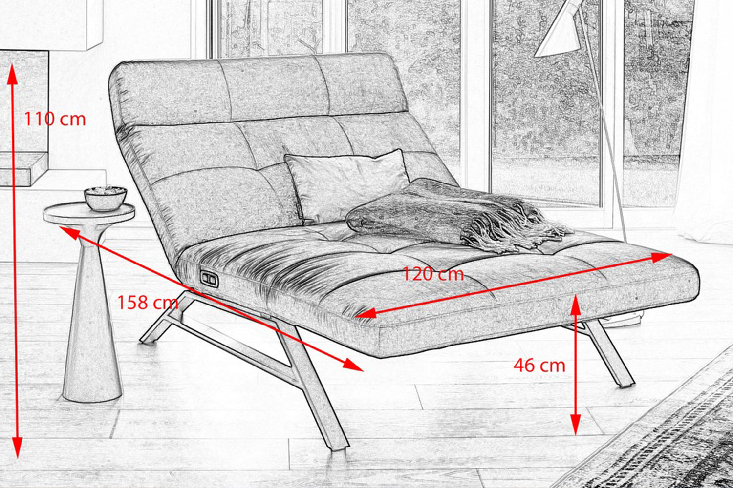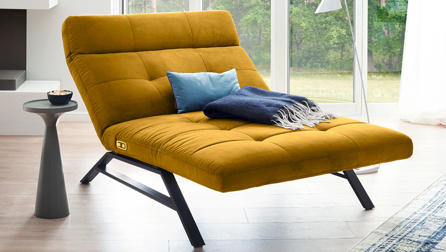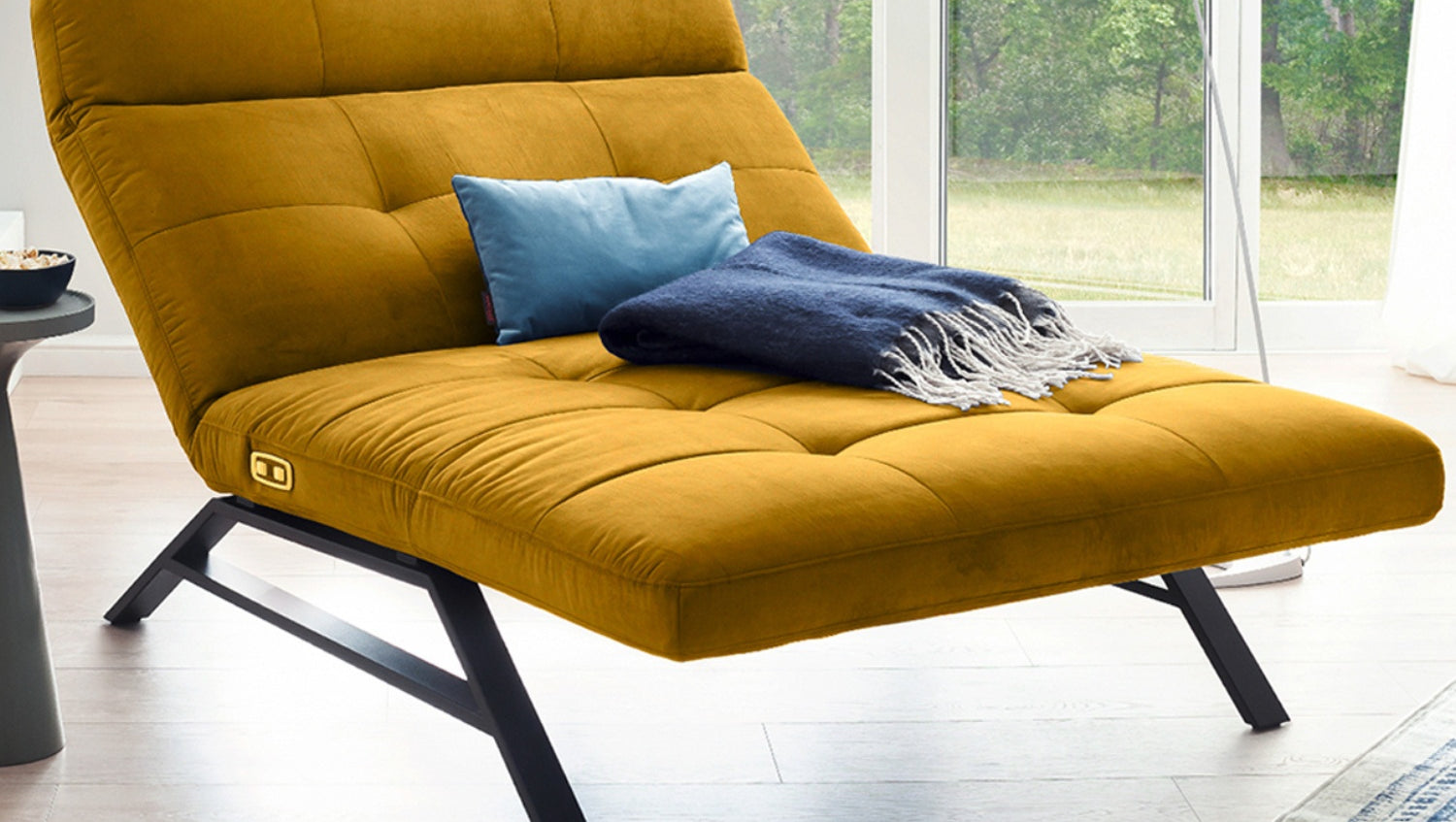 La Chaise longue AMERIVA de KAWOLA es una maravillosa combinación de diseño y funcionalidad. Las guías metálicas en negro mate contrastan con el moderno tejido de terciopelo. Sin embargo, la chaise longue no es sólo un verdadero atractivo visual, sino que también cumple todos los deseos en cuanto a funcionalidad. La función motorizada, que puede accionarse con los botones del lado derecho, ofrece una posición de reclinación infinitamente ajustable. La Chaise longue también dispone de conexión USB. La versatilidad de este mueble es tan variada como sus funciones: La chaise longue AMERIVA no sólo es ideal para el salón de casa, sino también para el vestíbulo o la sala de descanso.