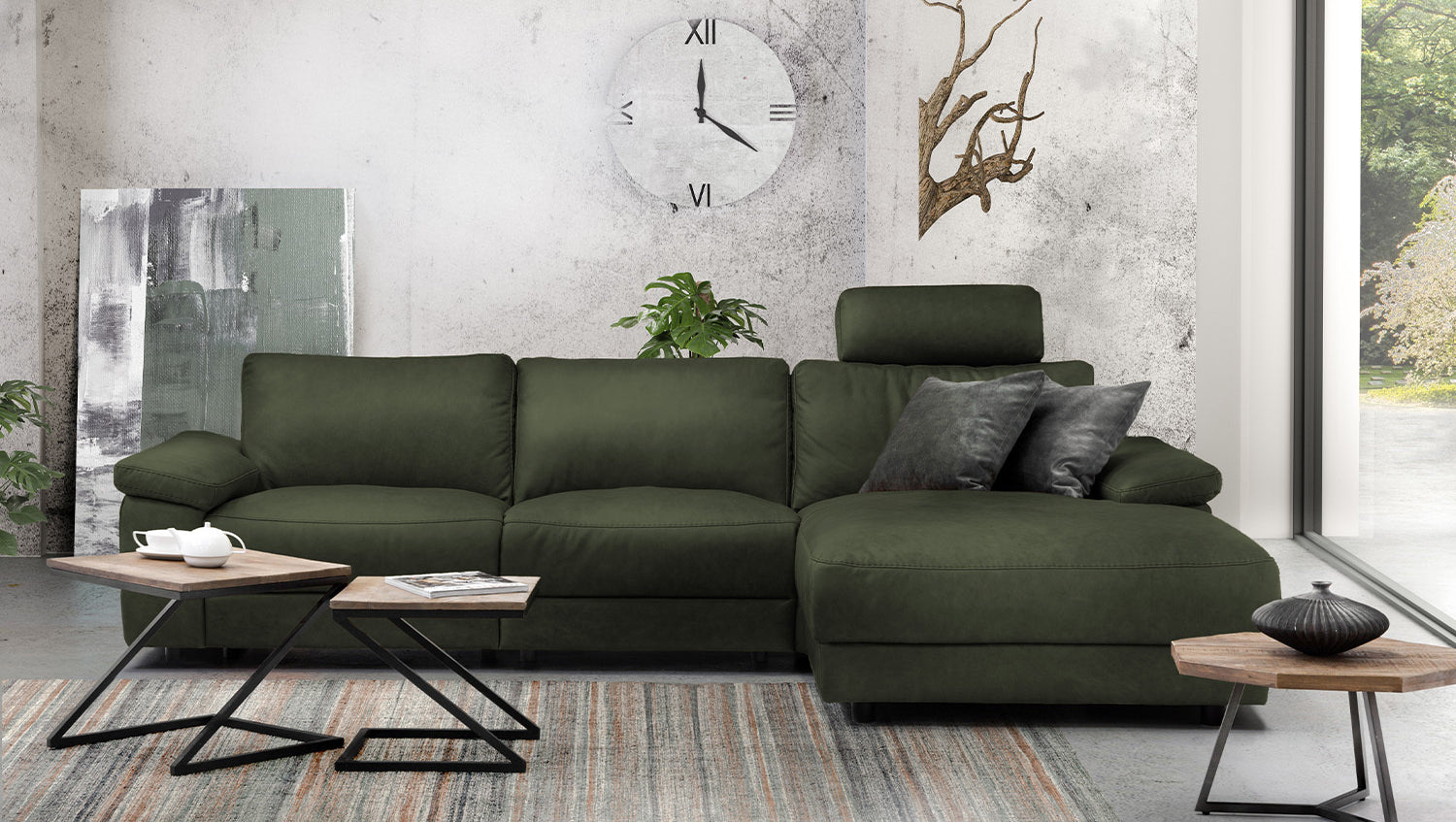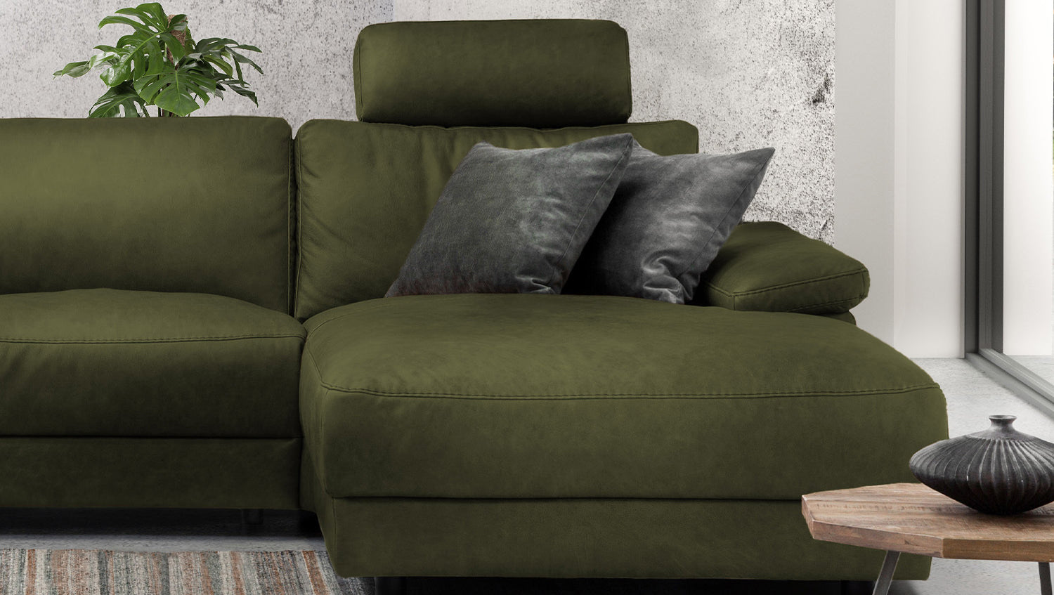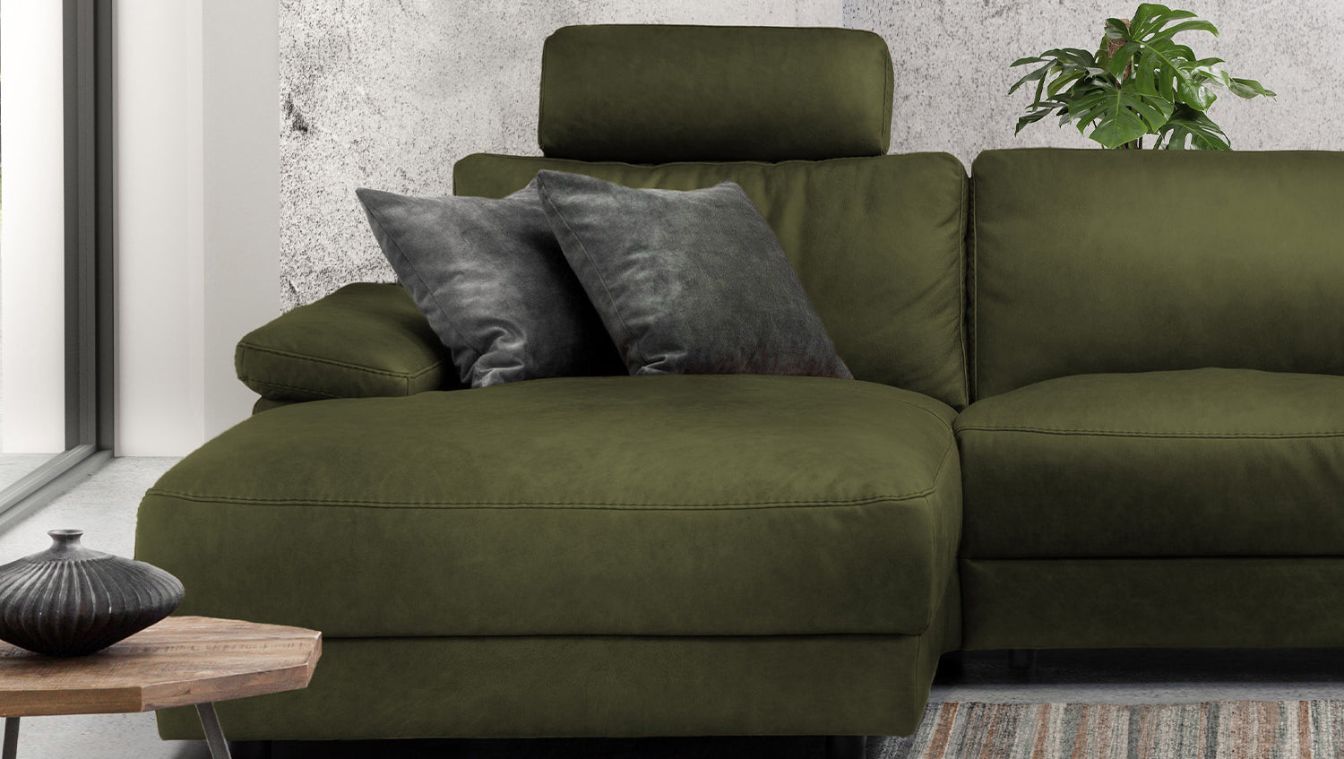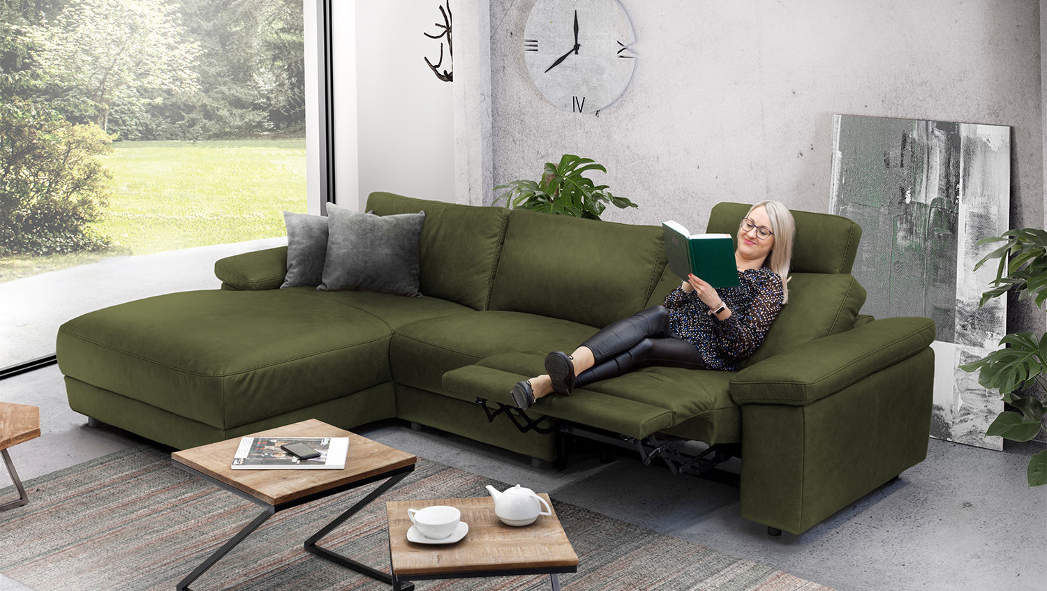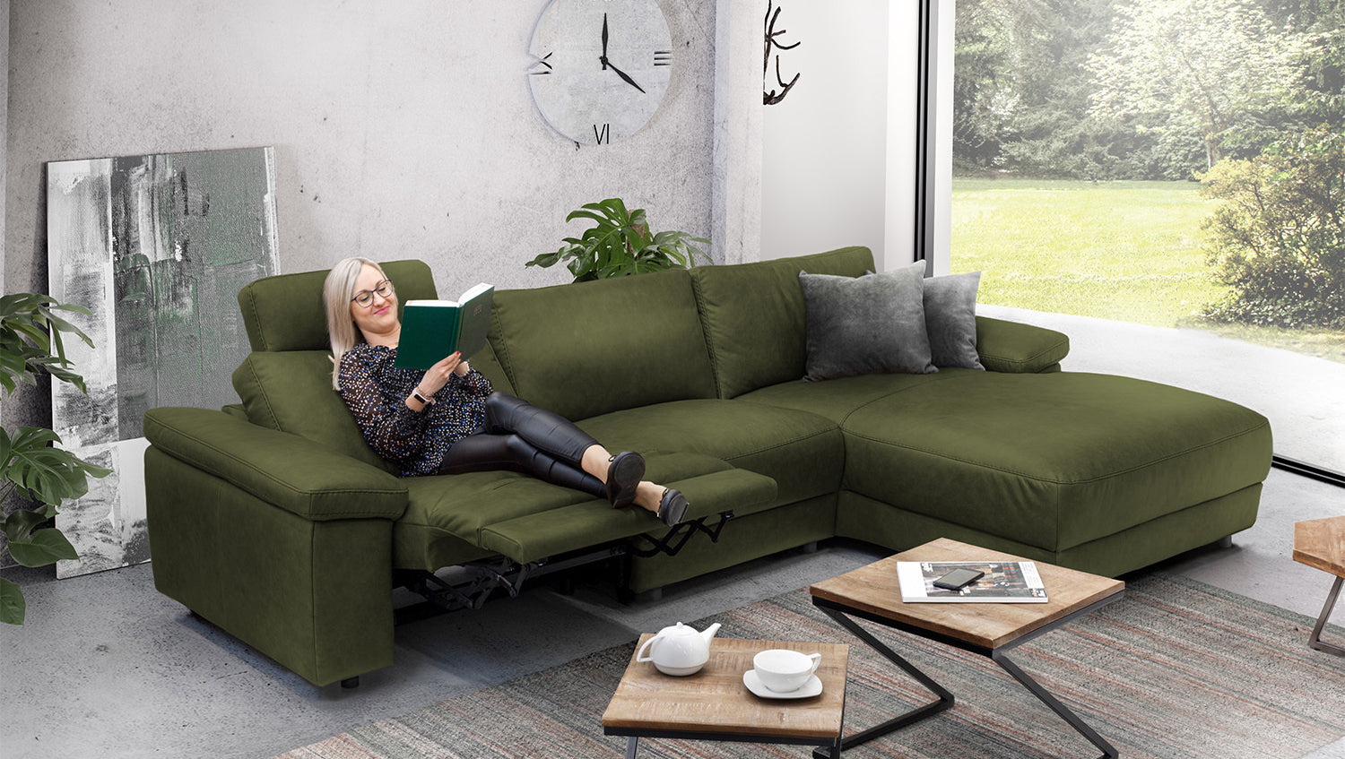 KAWOLA Sofá LOLA Sofá esquinero XL verde musgo con función relax motorizada varias fundas fundas