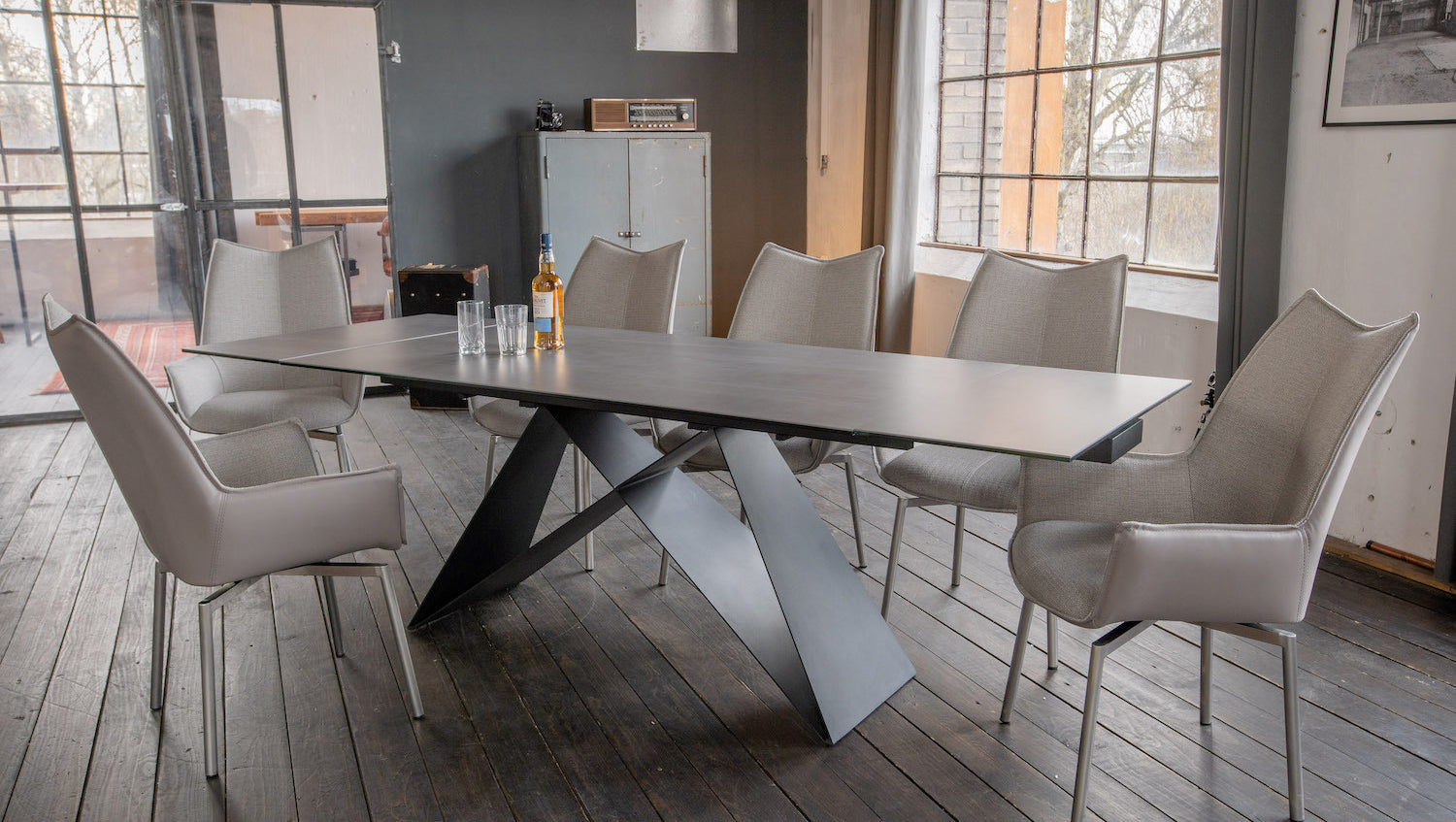 Moderna, elegante, especial: estas tres palabras vienen inmediatamente a la mente al ver la mesa BENNO. Esta mesa de comedor de cerámica, cristal y metal no sólo es bonita y especial, sino también muy práctica. Porque puede ampliarse hasta 240 cm. Esto es posible gracias a los tableros extensibles a ambos lados de los extremos de la mesa, lo que la hace ideal no sólo para las veladas en familia, sino también como mesa de reuniones en la oficina ¡Una mesa para todas las ocasiones!