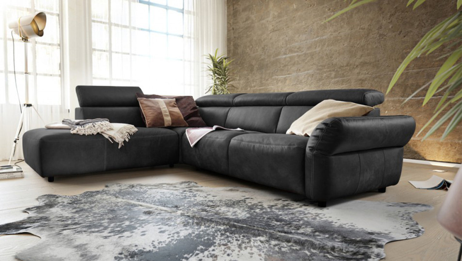 Este gran sofá esquinero ofrece espacio para usted y todos sus seres queridos. RISO está tapizado en piel suave de alta calidad y puede colocarse en cualquier lugar de la habitación. Los reposacabezas abatibles proporcionan un cómodo apoyo para la cabeza y la zona cervical al sentarse o reclinarse. El sofá de 2 plazas está motorizado y puede extraerse, lo que aumenta aún más la superficie para sentarse. La suspensión de muelles ondulados del sofá contribuye a un alto nivel de comodidad. Con este sofá, no sólo está comprando un mueble, está comprando comodidad con estilo y espacio.