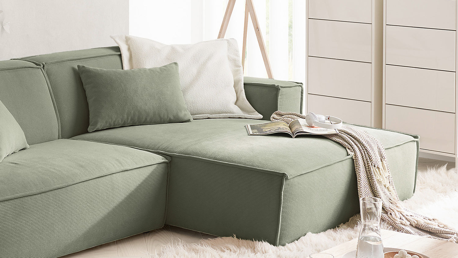 KAWOLA Sofá SAMU Sofá esquinero Pana fina verde oliva