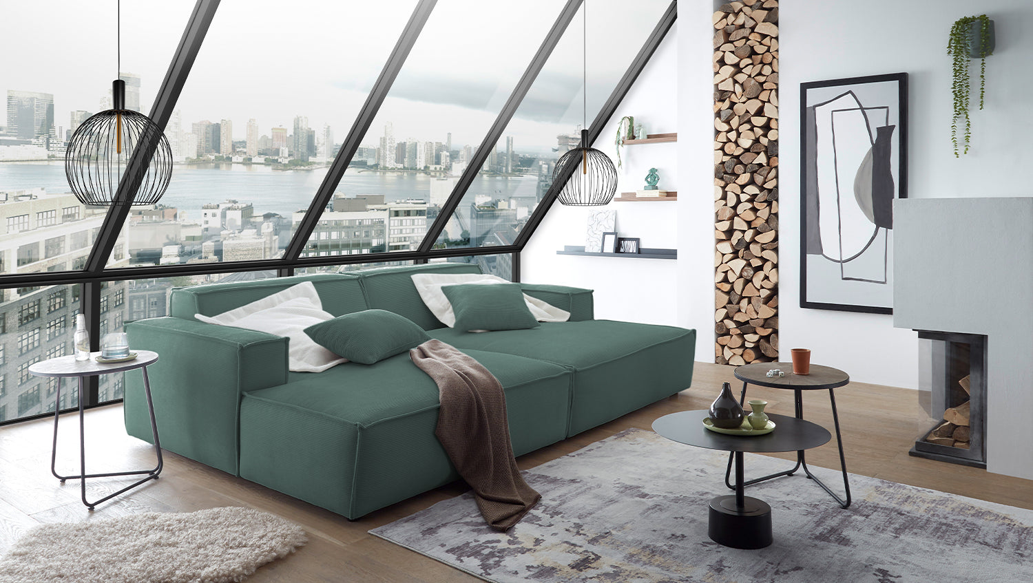 KAWOLA Sofá extra ancho SAMU pana fina verde
