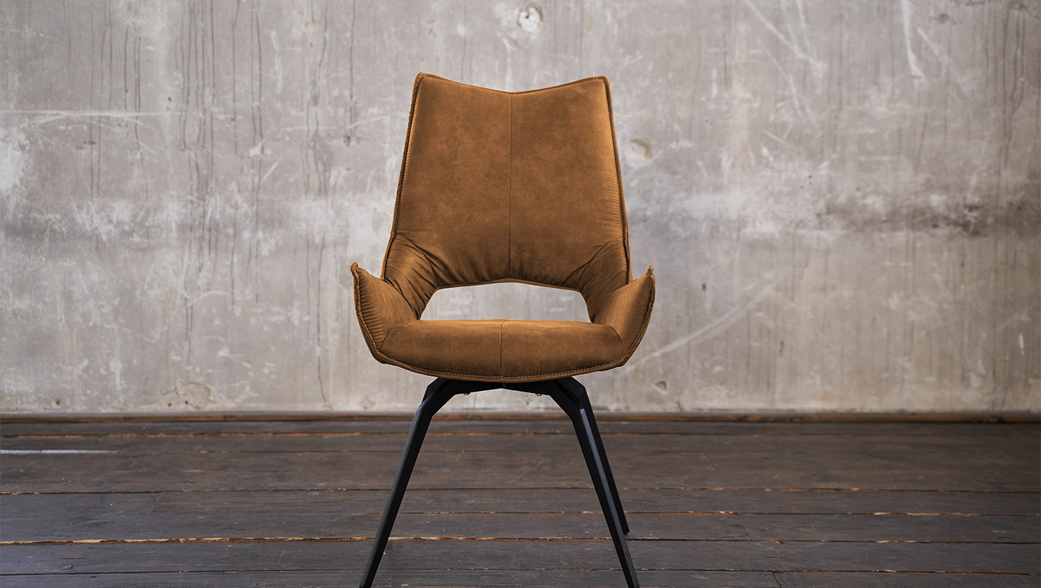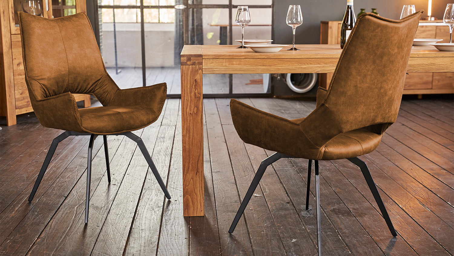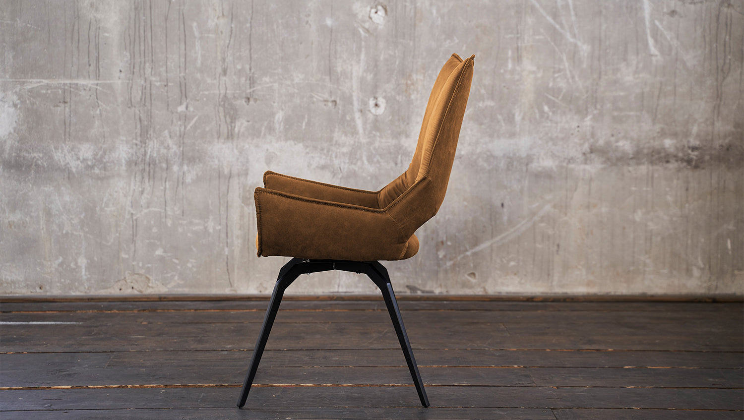 La silla de comedor SIVO llama inmediatamente la atención por su interesante forma. Tanto la carcasa del asiento, cómodamente acolchada, como las patas giratorias en ángulo tienen un diseño inusual. En la carcasa del asiento, que por lo demás es continua, hay un hueco en la parte inferior del respaldo que completa su aspecto especial. La funda de tela de la silla giratoria es fácil de cuidar y muy agradable al tacto. La silla tapizada es ideal para el comedor o la zona de trabajo en casa, como silla en la sala de espera o como silla de reuniones en la oficina.