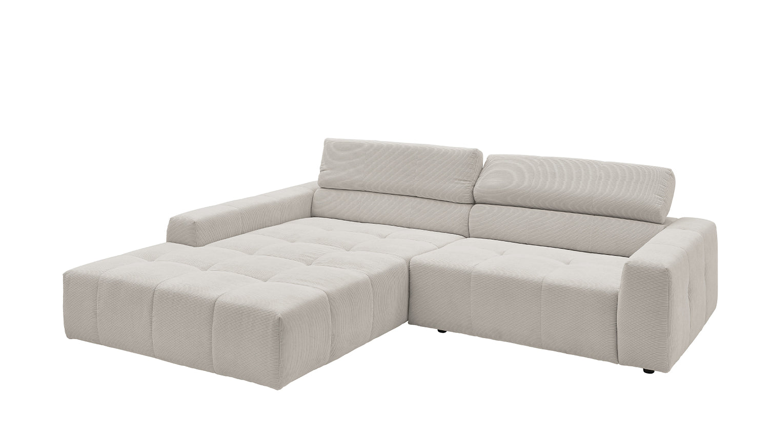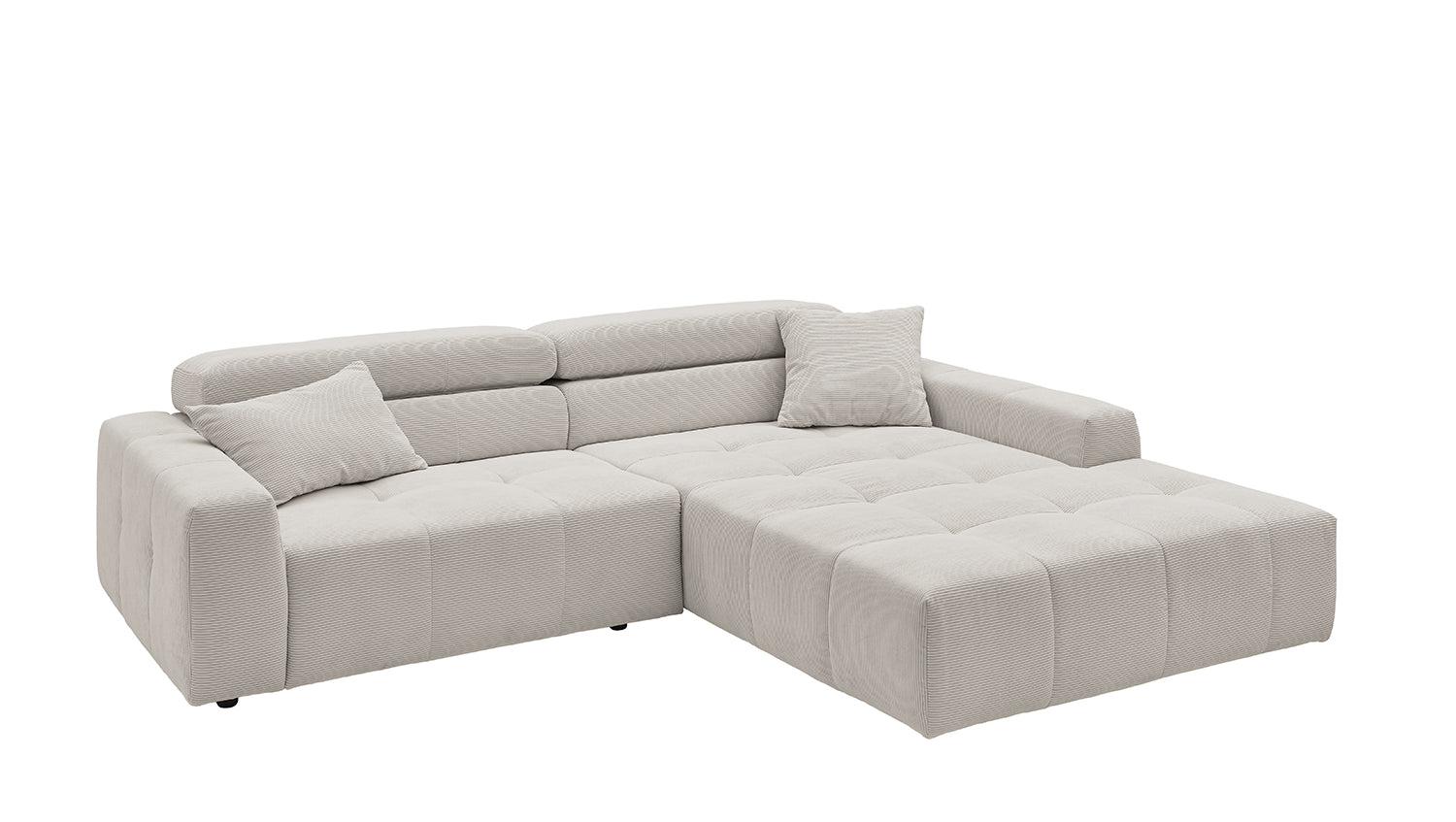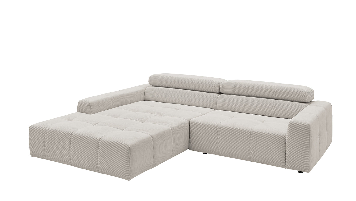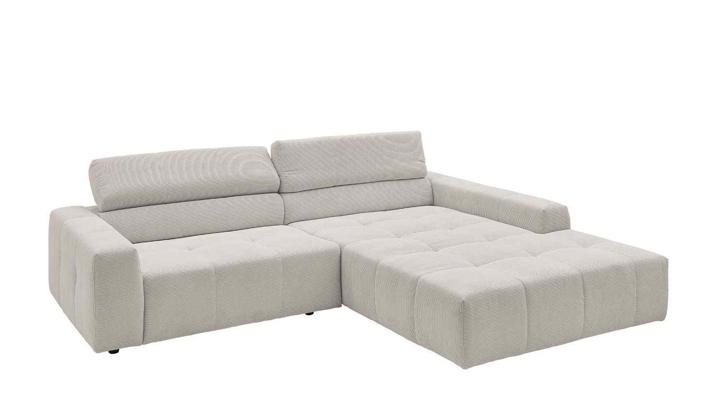 Descubra el elegante sofá esquinero RENO de KAWOLA, que impresiona por su funda de pana de alta calidad y el sofisticado ajuste del reposacabezas. La funda integral de pana de primera calidad confiere a este sofá esquinero un encanto atemporal y un tacto agradable. El respaldo ergonómico de espuma proporciona un confort adicional, mientras que la suspensión de muelles ondulados y la espuma PUR de la zona de asiento garantizan una agradable experiencia al sentarse. El innovador ajuste de los reposacabezas le permite inclinarlos individualmente o ponerlos en posición vertical para encontrar su posición de relajación personal. Con un confort de asiento de firmeza media, el sofá esquinero RENO ofrece la combinación perfecta de estilo y comodidad. Experimente la relajación pura en su salón con este cómodo y atractivo mueble. Entrega sin cojines ni decoración