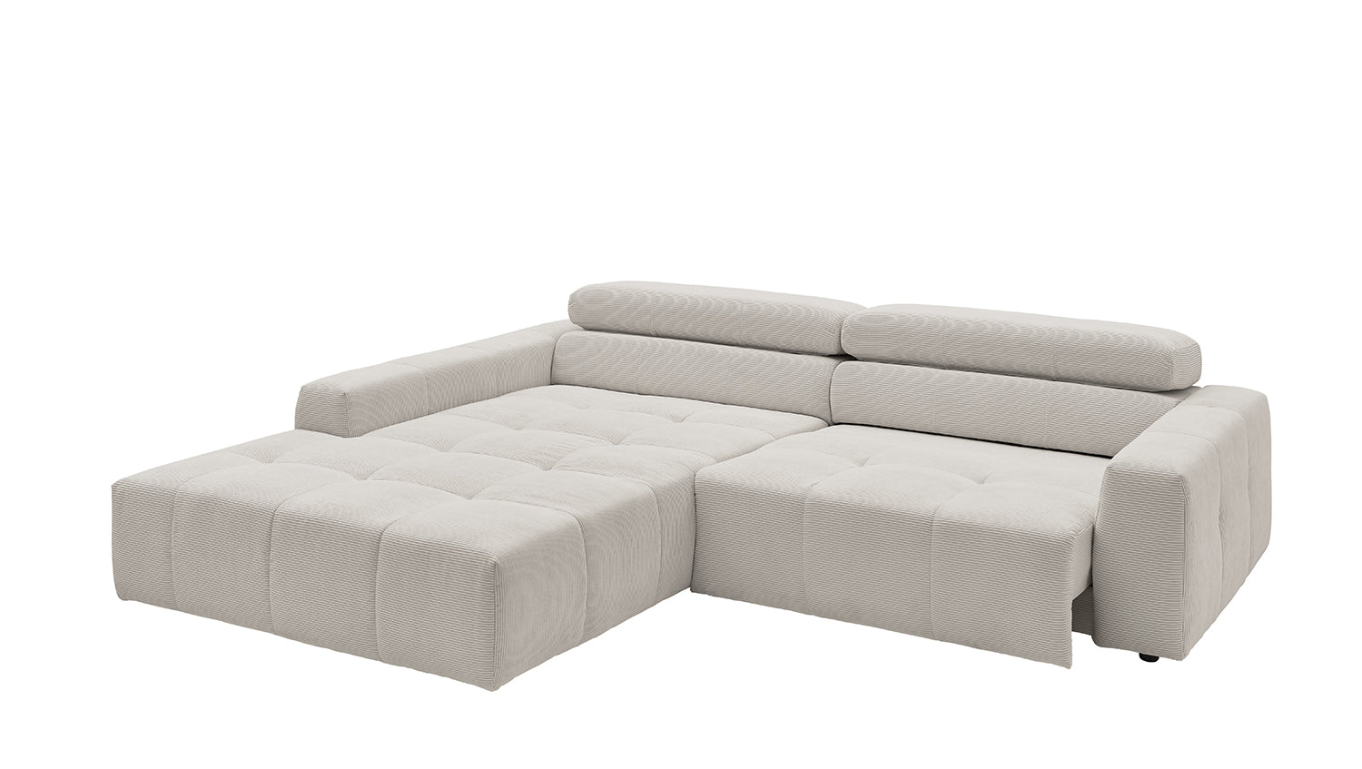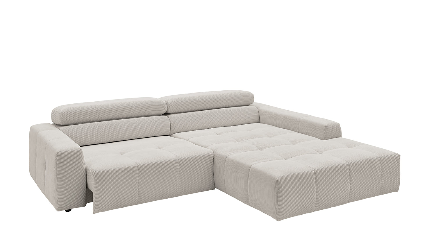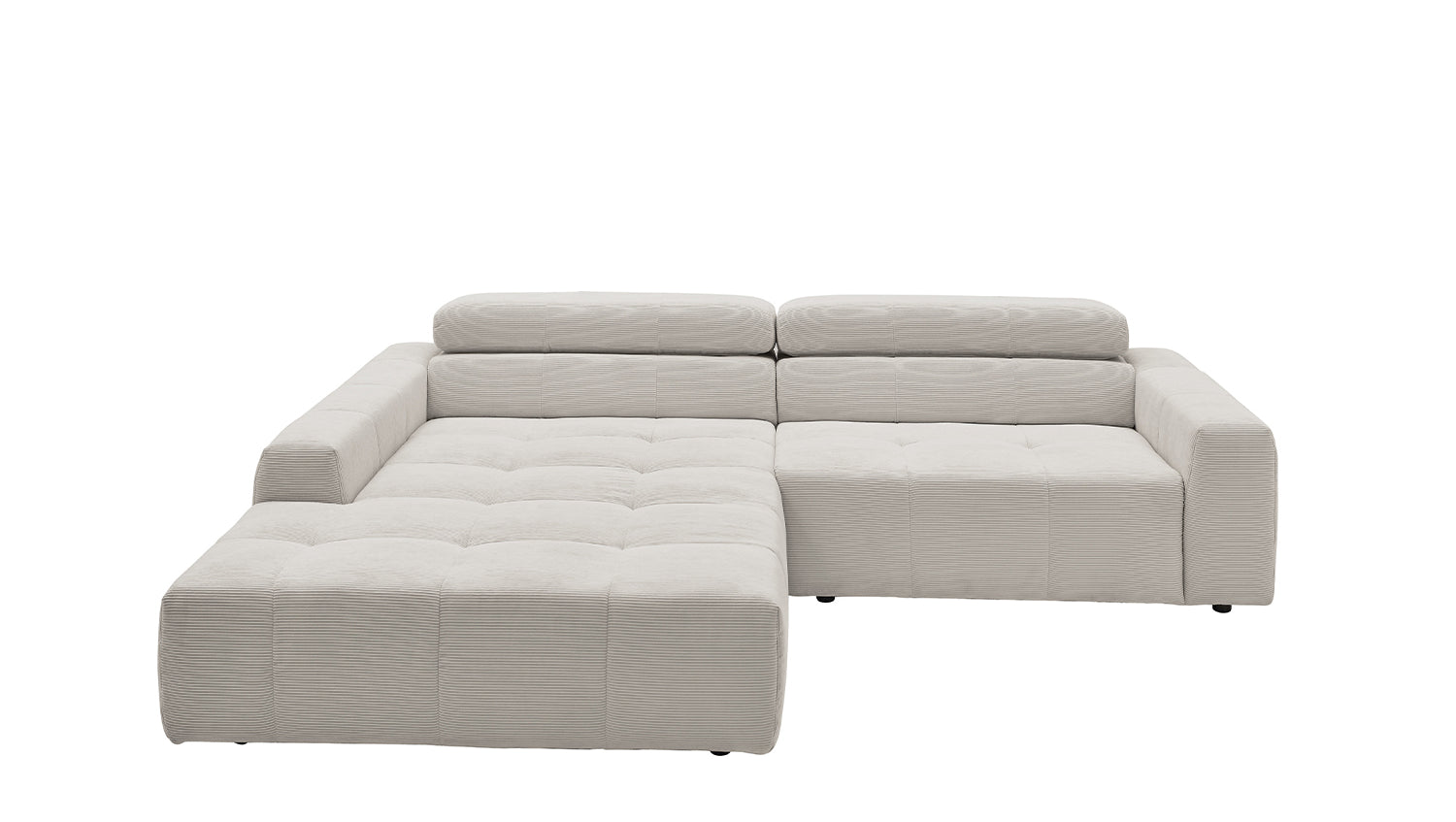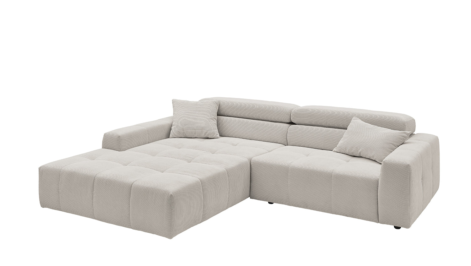 Descubra el elegante sofá esquinero RENO de KAWOLA, que impresiona por su funda de pana de alta calidad y el sofisticado ajuste del reposacabezas. La funda integral de pana de primera calidad confiere a este sofá esquinero un encanto atemporal y un tacto agradable. El respaldo ergonómico de espuma proporciona un confort adicional, mientras que la suspensión de muelles ondulados y la espuma PUR de la zona de asiento garantizan una agradable experiencia al sentarse. El innovador ajuste de los reposacabezas le permite inclinarlos individualmente o ponerlos en posición vertical para encontrar su posición de relajación personal. Con un confort de asiento de firmeza media, el sofá esquinero RENO ofrece la combinación perfecta de estilo y comodidad. Experimente la relajación pura en su salón con este cómodo y atractivo mueble. Entrega sin cojines ni decoración