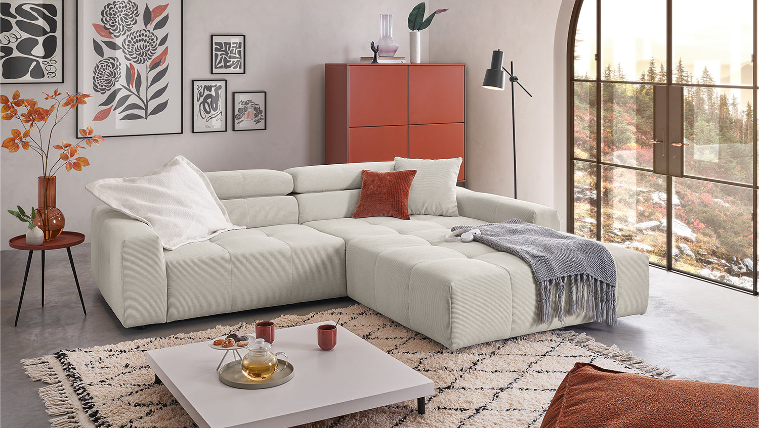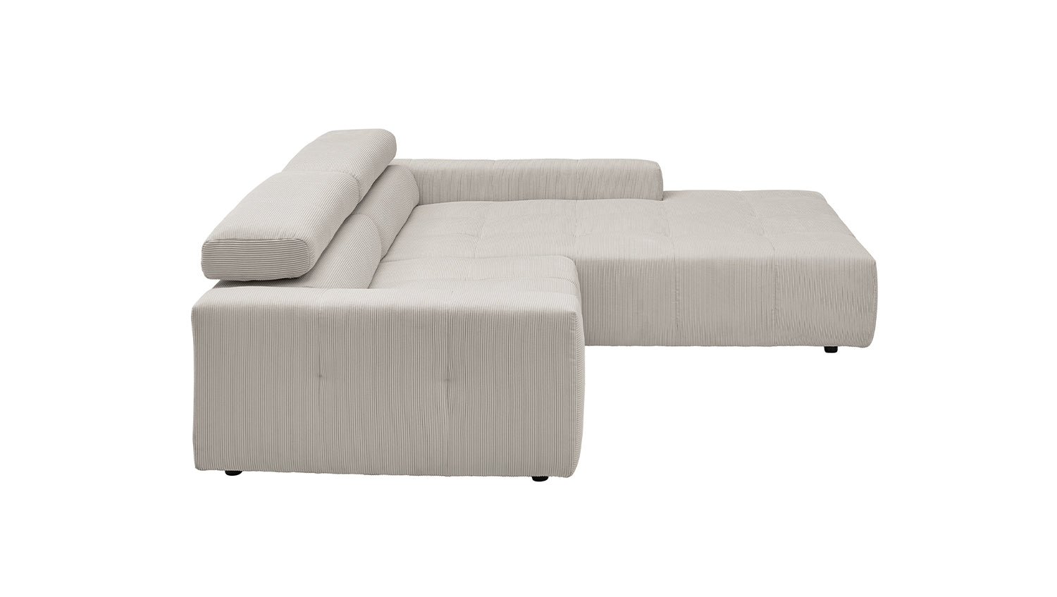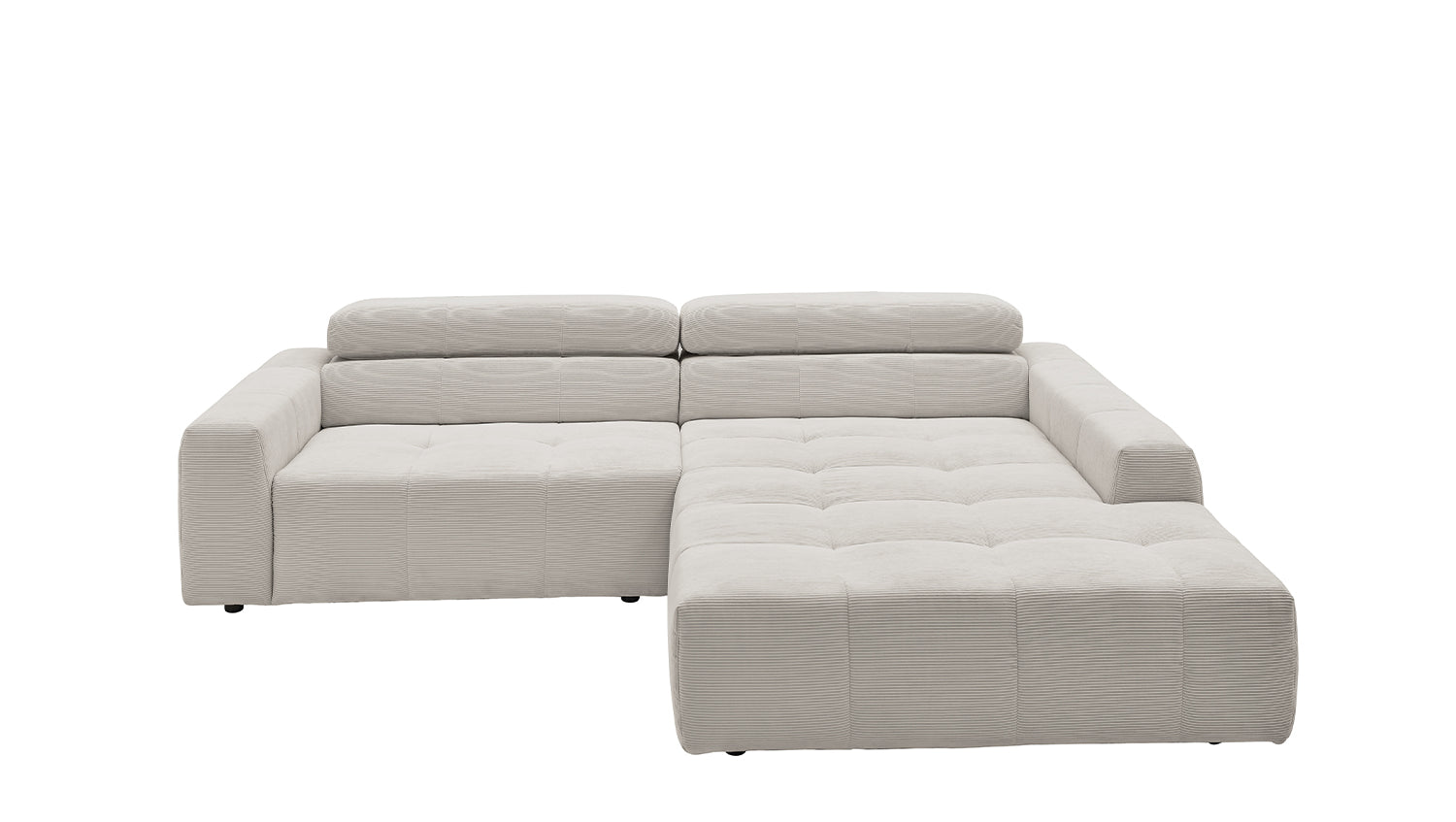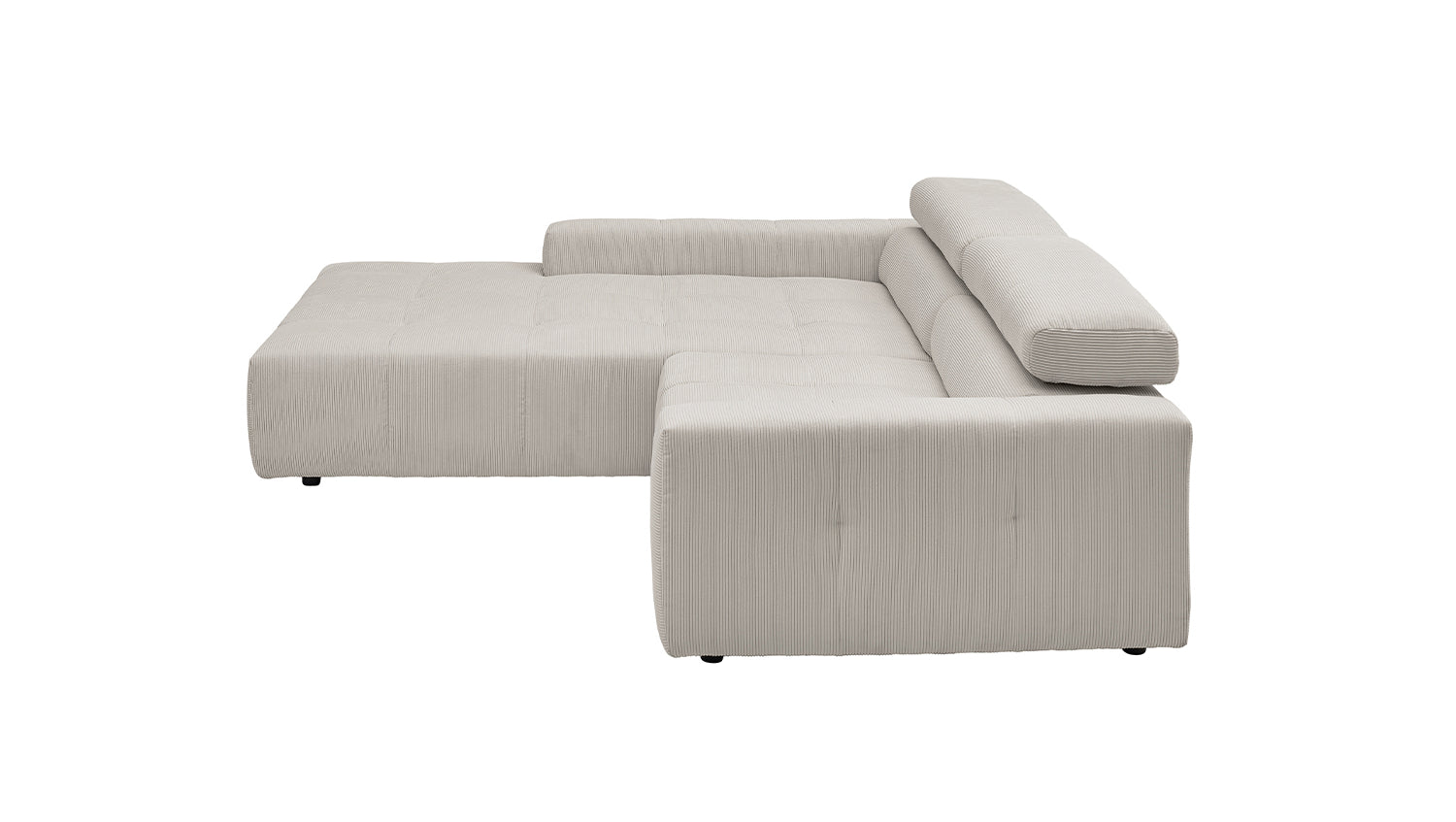 Descubra el elegante sofá esquinero RENO de KAWOLA, que impresiona por su funda de pana de alta calidad y el sofisticado ajuste del reposacabezas. La funda integral de pana de primera calidad confiere a este sofá esquinero un encanto atemporal y un tacto agradable. El respaldo ergonómico de espuma proporciona un confort adicional, mientras que la suspensión de muelles ondulados y la espuma PUR de la zona de asiento garantizan una agradable experiencia al sentarse. El innovador ajuste de los reposacabezas le permite inclinarlos individualmente o ponerlos en posición vertical para encontrar su posición de relajación personal. Con un confort de asiento de firmeza media, el sofá esquinero RENO ofrece la combinación perfecta de estilo y comodidad. Experimente la relajación pura en su salón con este cómodo y atractivo mueble. Entrega sin cojines ni decoración