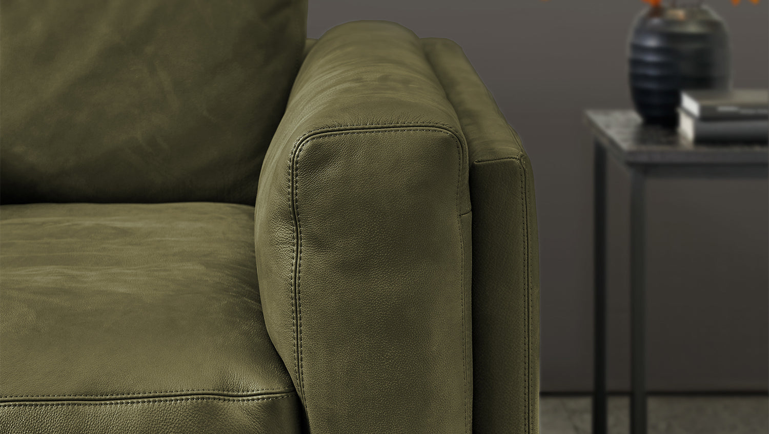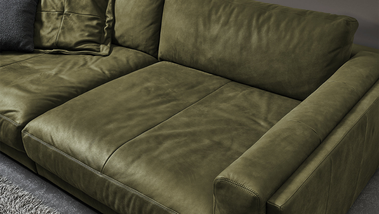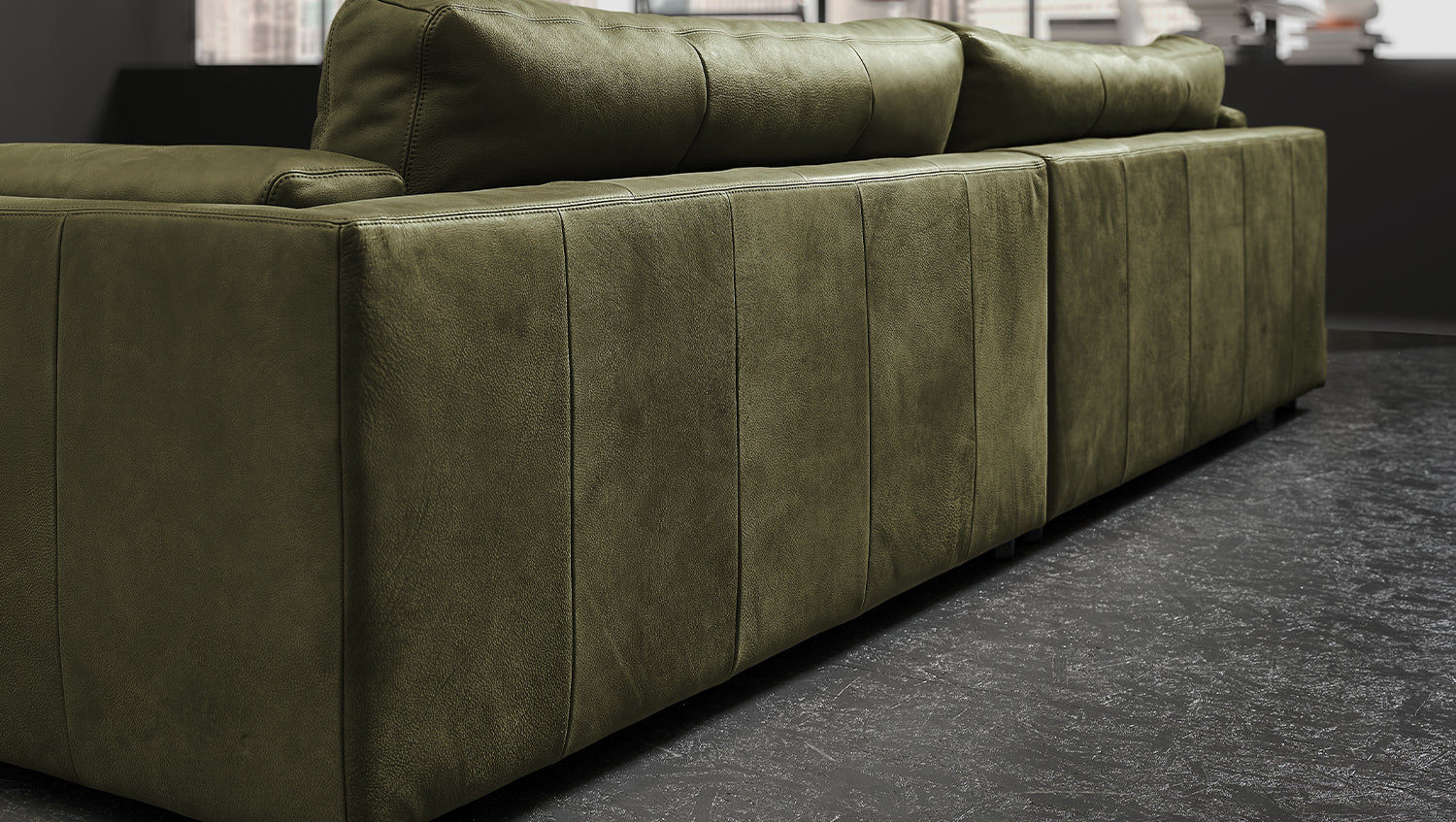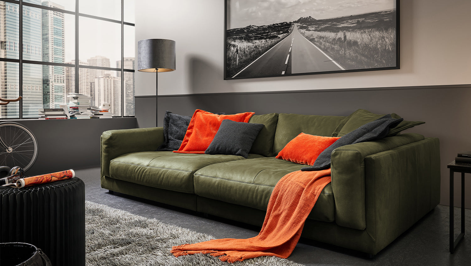 Sofá grande KAWOLA RAINA de cuero verde oliva