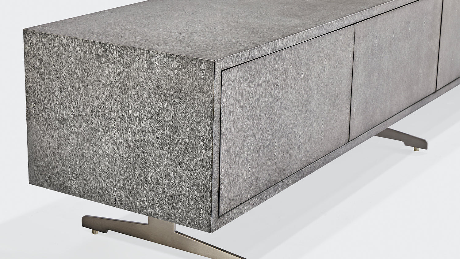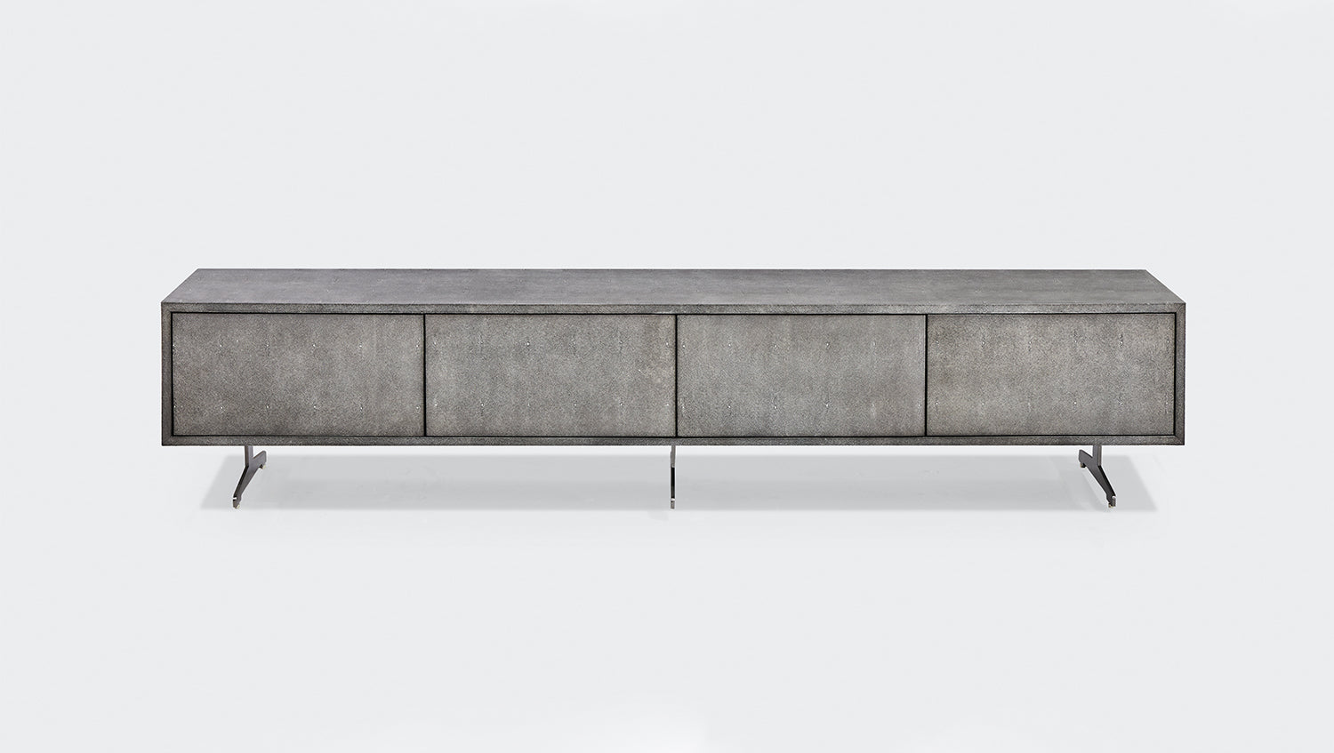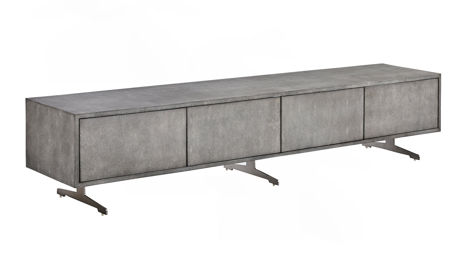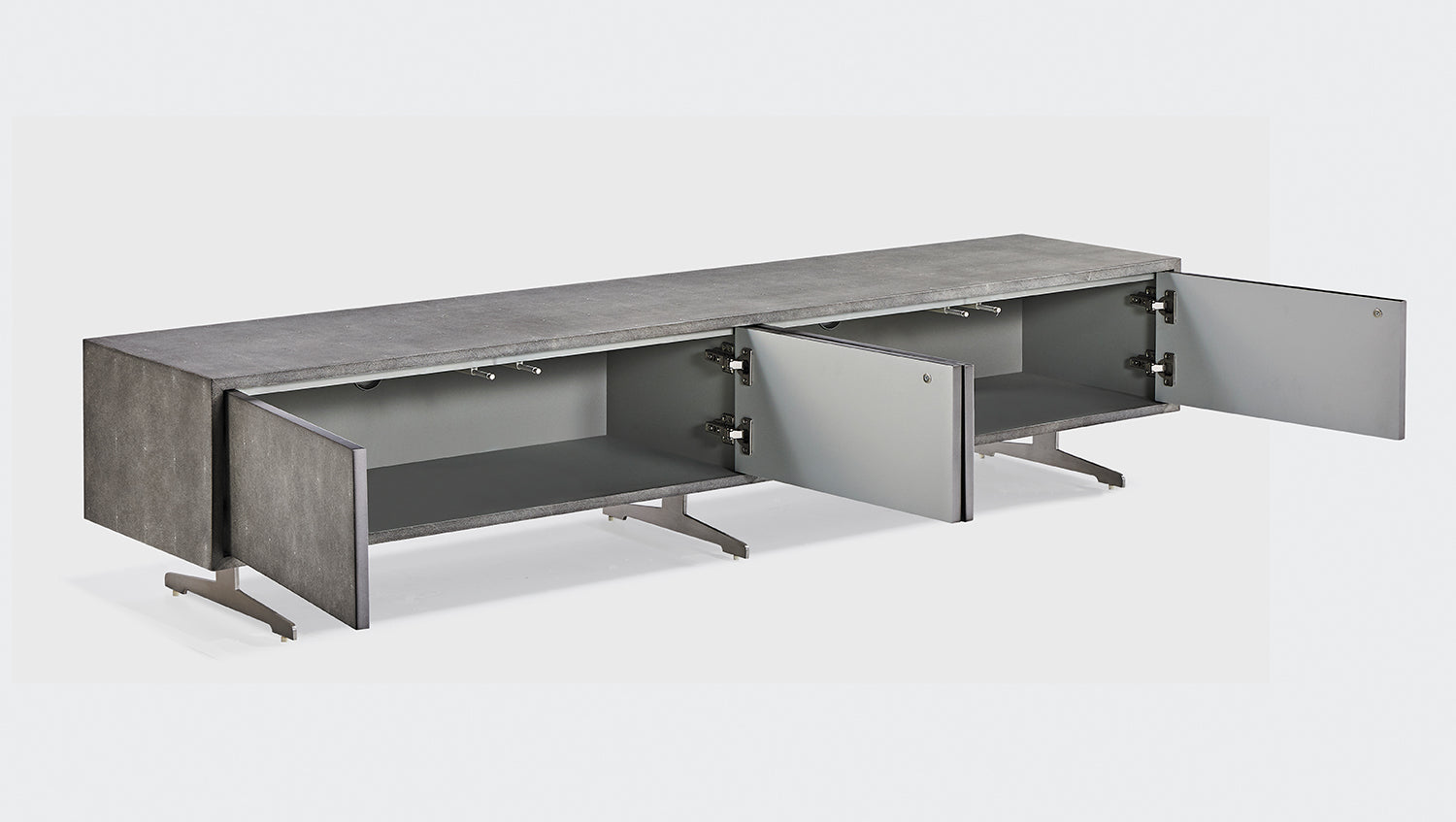 Mueble bajo para TV GALA KAWOLA, 4 puertas, piel sintética, pie gris, acero inoxidable cepillado
