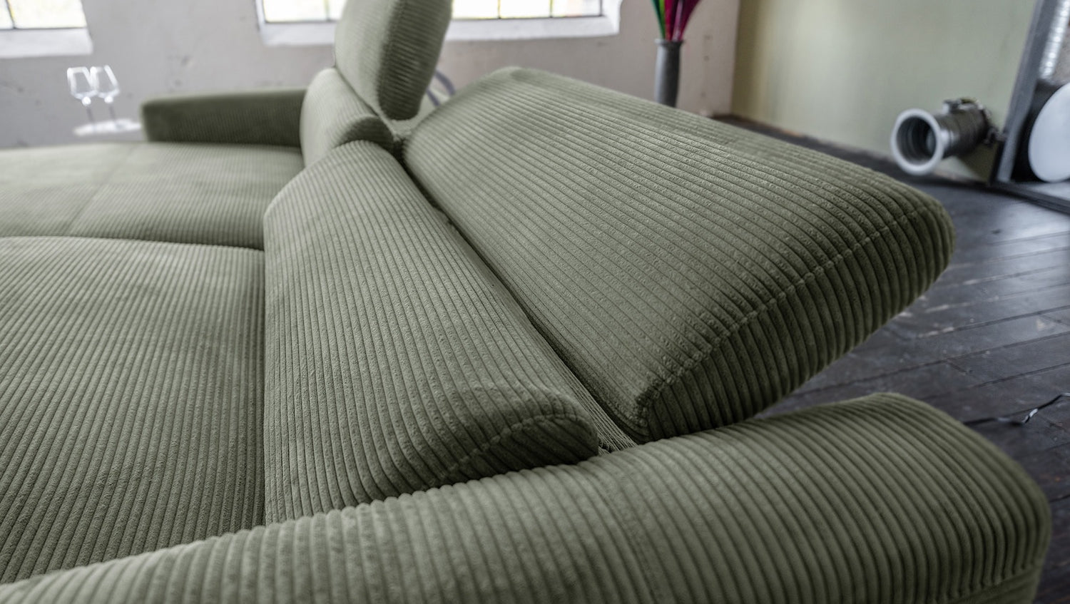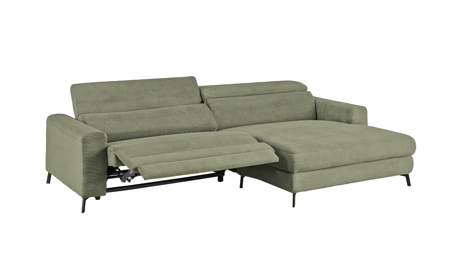 KAWOLA Sofá de esquina LAISKA función relax semi-motorizado Pana verde oliva