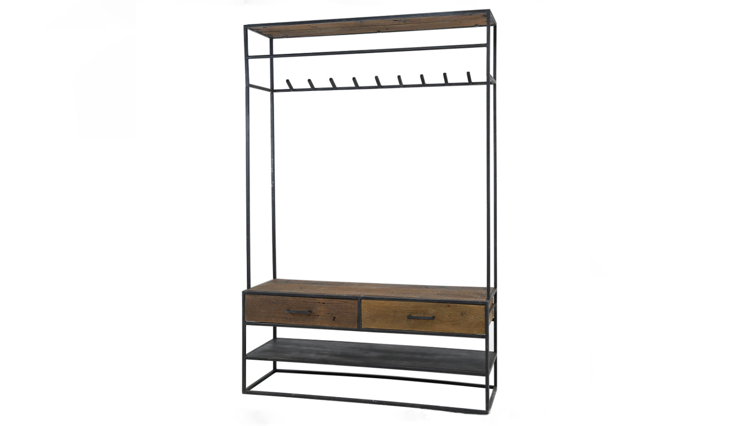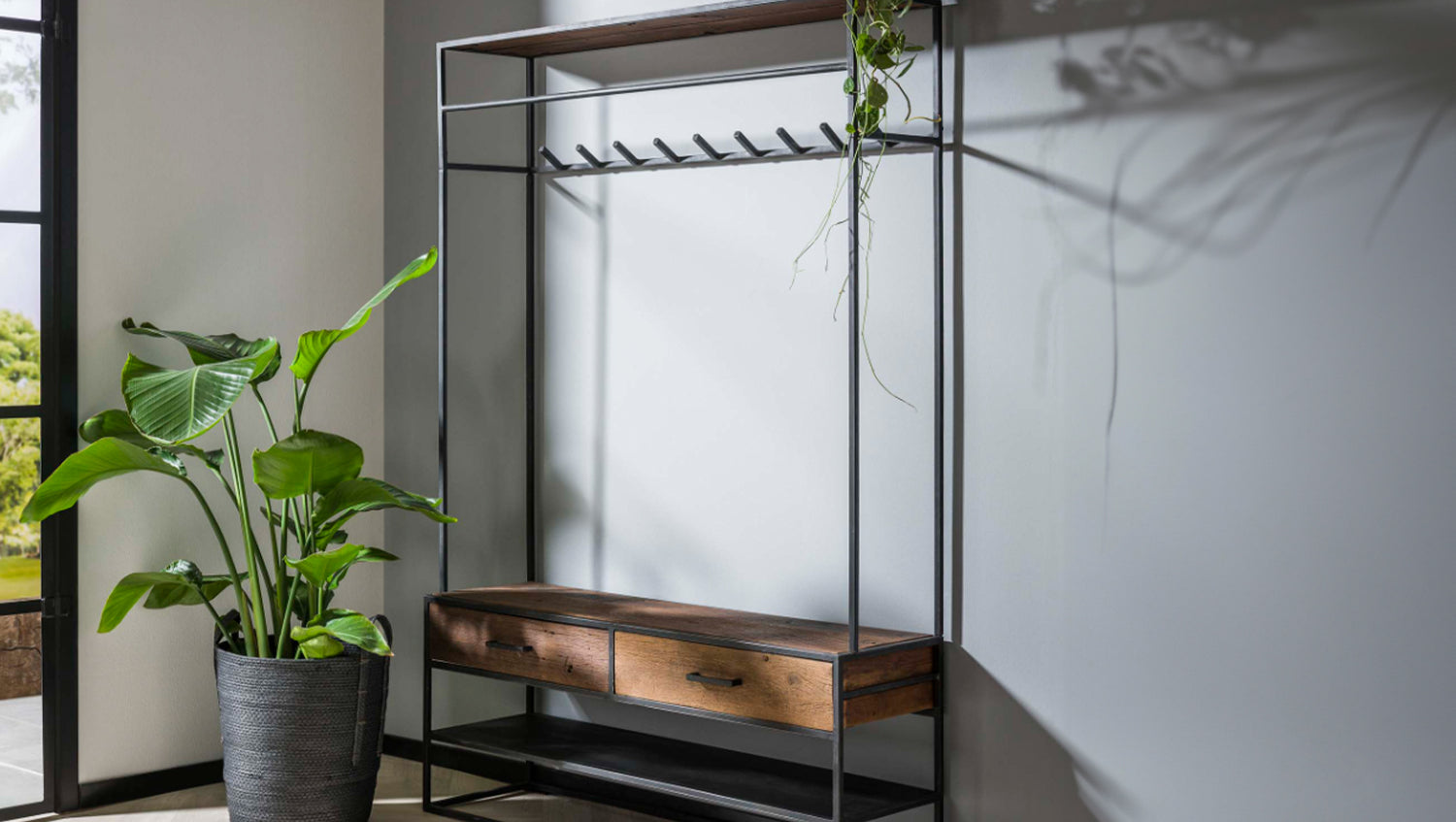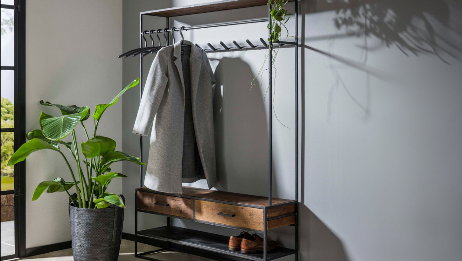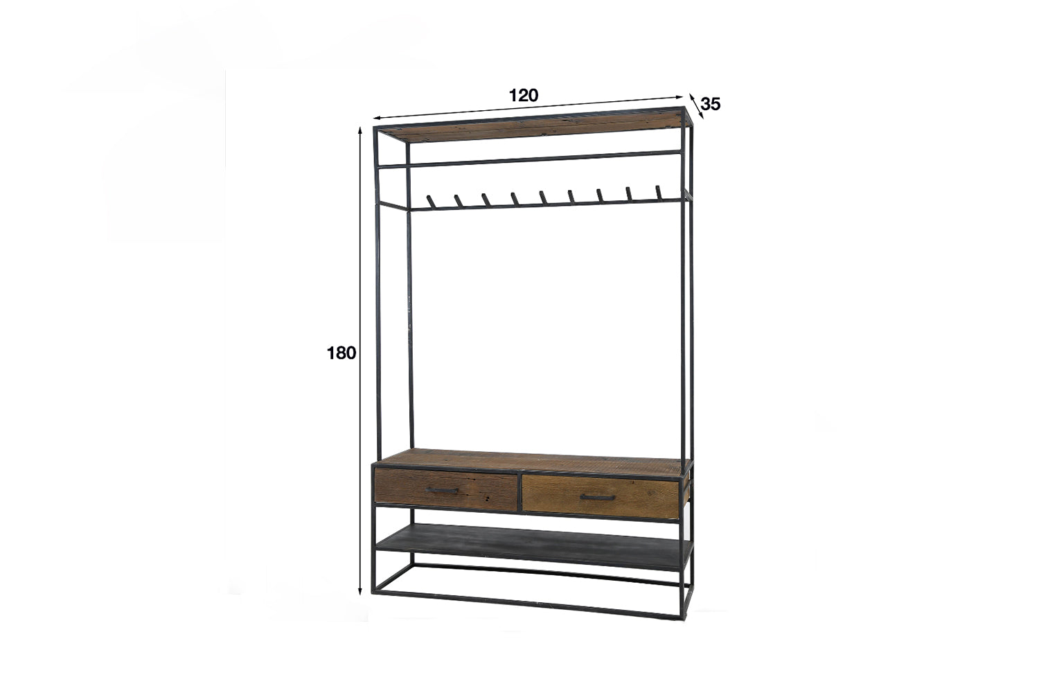 El Guardarropa KAWOLA TENBY combina el robusto metal con cálidos elementos de madera y ofrece una solución ideal para tener ordenada la zona de entrada. Con una altura de 180 cm, una anchura de 120 cm y una profundidad de 35 cm, crea espacio suficiente para abrigos, chaquetas, zapatos y accesorios. El compartimento abierto permite guardar rápidamente bolsos o sombreros, mientras que los dos amplios cajones de madera con tiradores metálicos ofrecen espacio de almacenamiento adicional para guantes, bufandas u objetos pequeños. Gracias a su robusta construcción y a su diseño industrial atemporal, TENBY se integra a la perfección en los conceptos de vida modernos. Ya sea en el recibidor, el pasillo o el vestidor, este Guardarropa combina funcionalidad con un diseño elegante y crea un ambiente ordenado y elegante.