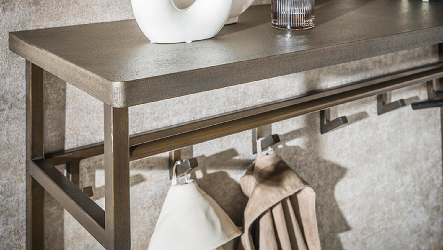 El perchero de pared AUREA de KAWOLA impresiona con su acabado artesanal en ferro, que crea una llamativa textura 3D y añade un toque sofisticado a cualquier habitación. Equipado con un práctico estante para sombreros, su extraordinario diseño se complementa además con 12 ganchos y una varilla en acabado de latón envejecido, combinando funcionalidad con elegancia atemporal. Perfecto para chaquetas, bolsos y accesorios, AUREA no sólo es práctico, sino que también atrae todas las miradas. Con una anchura de 100 cm, una altura de 80 cm y una profundidad de 33 cm, es ideal para pasillos, vestíbulos o dormitorios. Dé a su hogar un toque elegante y moderno.