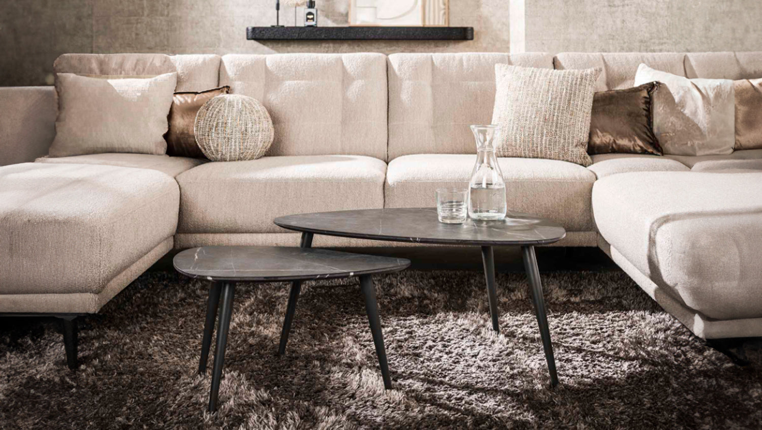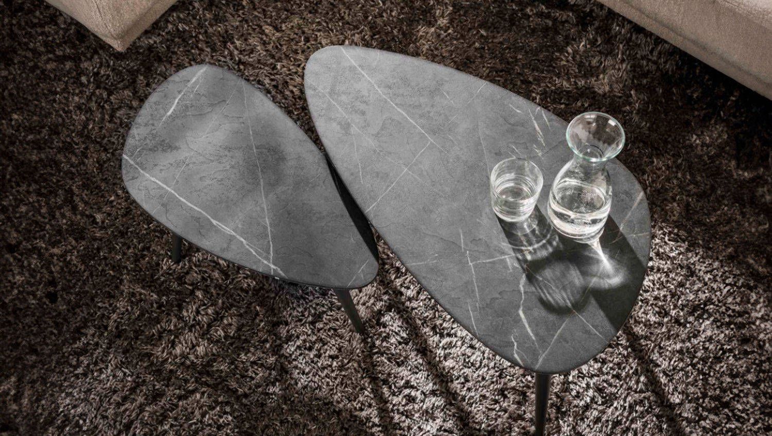 El juego de mesa de centro con forma de pera PARANA de KAWOLA está fabricado en melamina con aspecto cerámico y estructura de acero. La mesa es casi indistinguible de una mesa de cerámica. El tablero de la mesa, hecho a mano, consiste en una capa de resina de melamina que se aplica sobre madera. El material se aplica mediante calor y presión. La belleza del material en combinación con la forma de pera da como resultado una mesa moderna pero atemporal. El juego consta de dos mesas. La mesa más grande tiene una superficie de 80 x 44 cm y una altura de 40 cm, mientras que la mesa más pequeña tiene una superficie de 60 x 33 cm y una altura de 35 cm. Ya sea en un moderno loft, en un acogedor salón o en una elegante sala de estar, el juego de mesa de centro PARANA pone acentos de estilo y combina funcionalidad con estética atemporal.