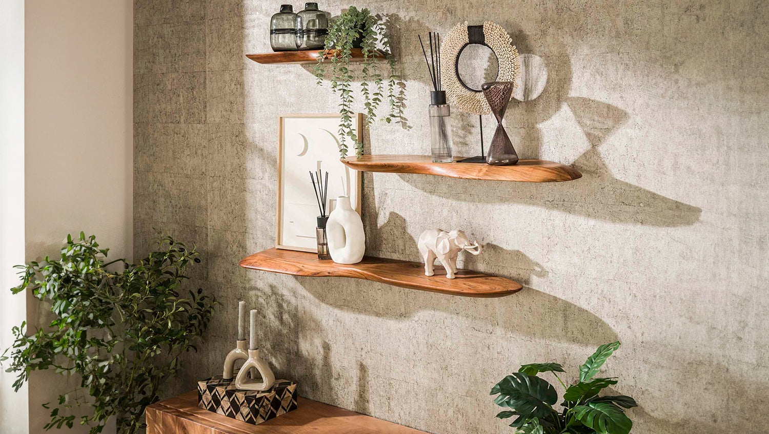 La estantería de pared KAWOLA HUZO de 60 cm está fabricada en madera de acacia y acabada con un lacado mate transparente que resalta sutilmente las vetas naturales de la madera. Su forma orgánica y sus tonos cálidos confieren a la estantería un aspecto tranquilo. El montaje es muy sencillo gracias a las levas invisibles suministradas, que hacen que la estantería parezca flotar en la pared. Con su longitud de 60 cm, puede utilizarse de múltiples maneras.
