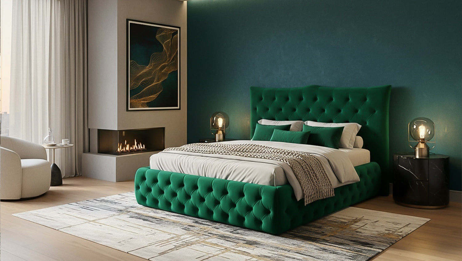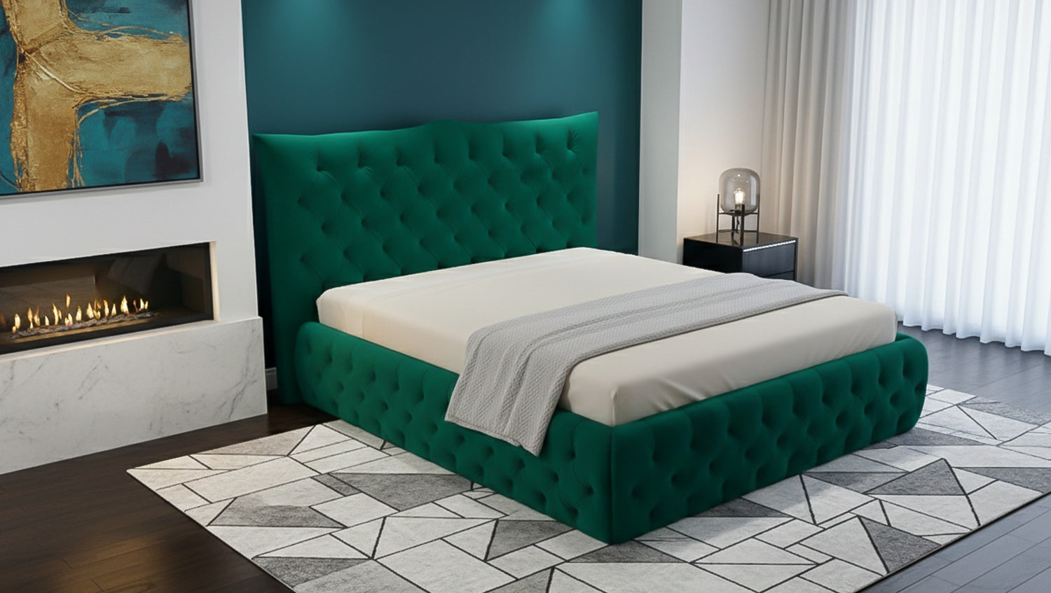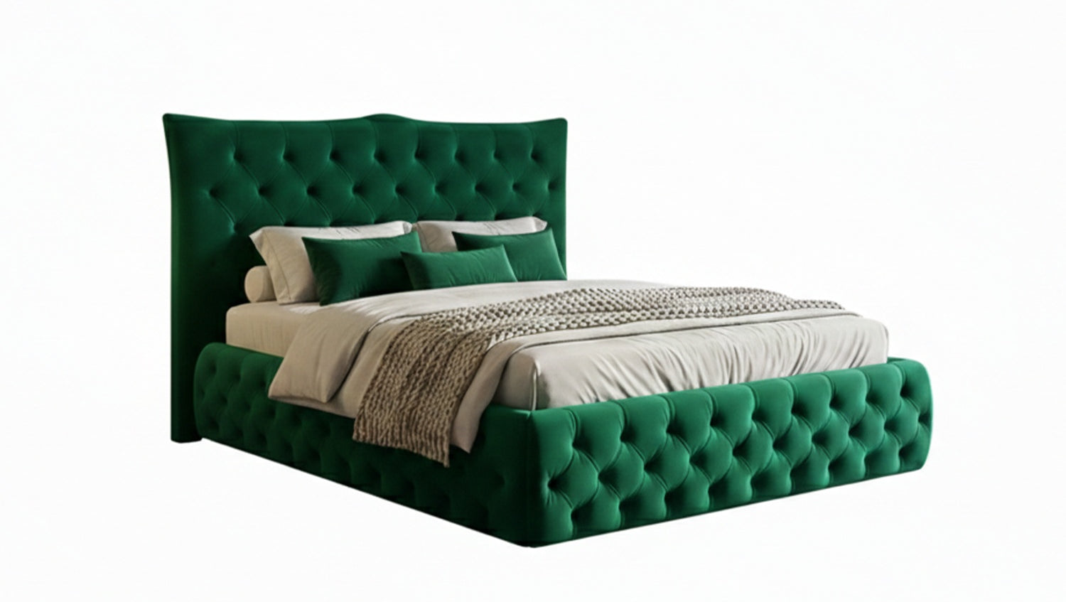Cama KAWOLA BERTINI tapizada en terciopelo verde, 160 x 200 cm, con somier de láminas