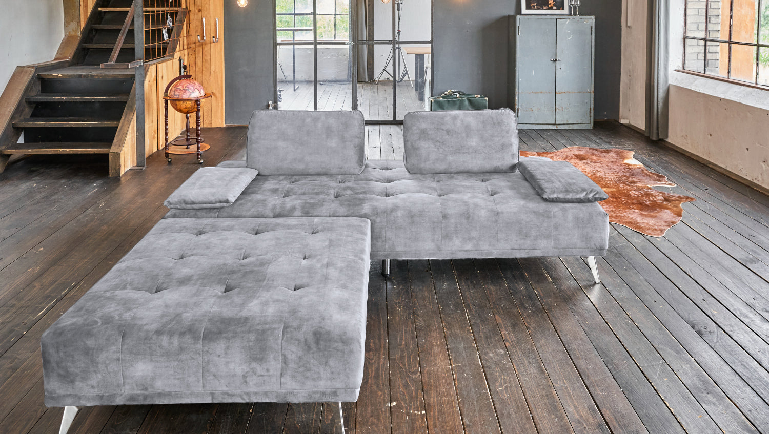 KAWOLA Sofá cama WIOLO con Puf terciopelo gris