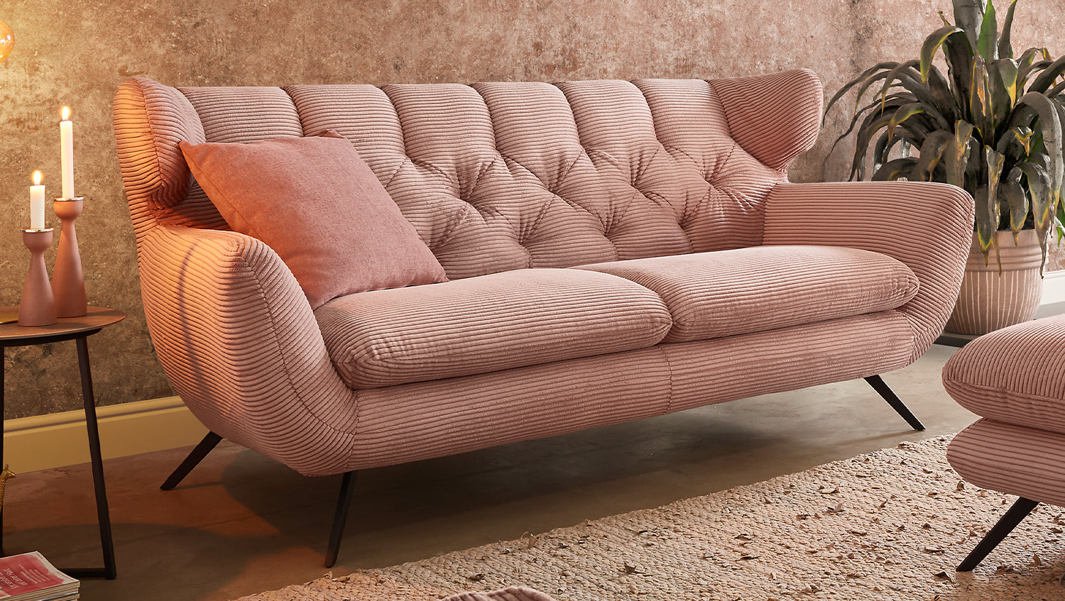 El grupo de asientos KAWOLA CHARME, compuesto por un sofá, un sillón y un Puf, está completamente revestido de pana. El respaldo también es de pana, lo que permite colocar el sofá y el sillón en cualquier lugar de la habitación. El estilo recuerda a los años sesenta: los respaldos del sofá y el sillón se han acolchado de forma elaborada sin botones; los respaldos se han curvado ligeramente hacia delante en ambos lados y recuerdan la forma de un sillón de ala; los pies de metal negro son ligeramente acampanados. La tapicería de la colección KAWOLA CHARME es de espuma PUR e impresiona por su comodidad de asiento suave y desenfadada. Los cojines del asiento se amoldan cómodamente a la forma del cuerpo. Si lo que busca no es simplemente un lugar donde sentarse, sino un punto de atracción muy especial, el grupo de asientos CHARME es la elección perfecta.