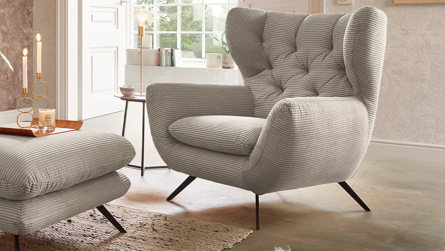 El grupo de asientos KAWOLA CHARME, compuesto por un sofá, un sillón y un Puf, está completamente revestido de pana. El respaldo también es de pana, lo que permite colocar el sofá y el sillón en cualquier lugar de la habitación. El estilo recuerda a los años sesenta: los respaldos del sofá y el sillón se han acolchado de forma elaborada sin botones; los respaldos se han curvado ligeramente hacia delante en ambos lados y recuerdan la forma de un sillón de ala; los pies de metal negro son ligeramente acampanados. La tapicería de la colección KAWOLA CHARME es de espuma PUR e impresiona por su comodidad de asiento suave y desenfadada. Los cojines del asiento se amoldan cómodamente a la forma del cuerpo. Si lo que busca no es simplemente un lugar donde sentarse, sino un punto de atracción muy especial, el grupo de asientos CHARME es la elección perfecta.
