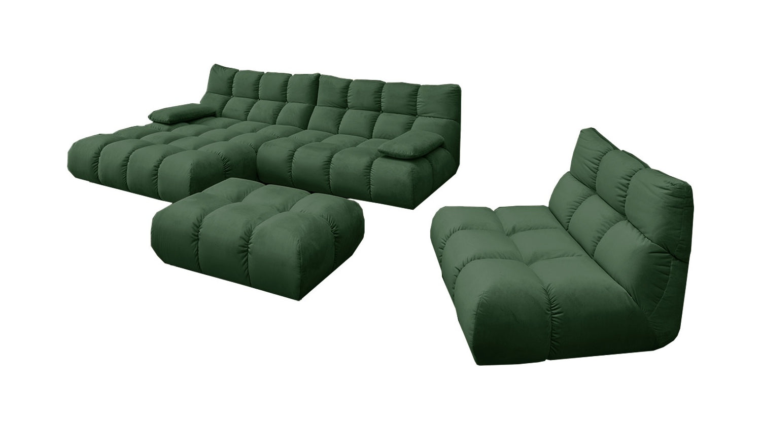 El conjunto de sofás VIVIEN de KAWOLA combina un aspecto lujoso con el máximo confort y funcionalidad. El conjunto consta de un amplio sofá esquinero, un versátil Banco y un cómodo sillón giratorio, que juntos crean una imagen armoniosa para un estilo de vida moderno. El sofá esquinero invita a relajarse con su profundo asiento y su cómodo acolchado. El banco complementa al sofá de forma flexible como asiento, reposapiés o superficie de apoyo. El sillón giratorio, con su función de 360°, garantiza la libertad de movimiento y ofrece un asiento cómodo. La tapicería de terciopelo noble confiere al conjunto de asientos un toque elegante. La superficie suave como el terciopelo y el brillo sutil convierten cada mueble en un punto de atracción y crean un ambiente lujoso. Gracias a la combinación de muelles ondulados de acero de elasticidad permanente y espuma HR/fría multicapa, disfrutará de una estabilidad duradera y del máximo confort al sentarse. El conjunto de asientos VIVIEN es la elección ideal para todos aquellos que buscan un conjunto completo para el salón con un diseño moderno, un aspecto elegante y un amplio espacio.