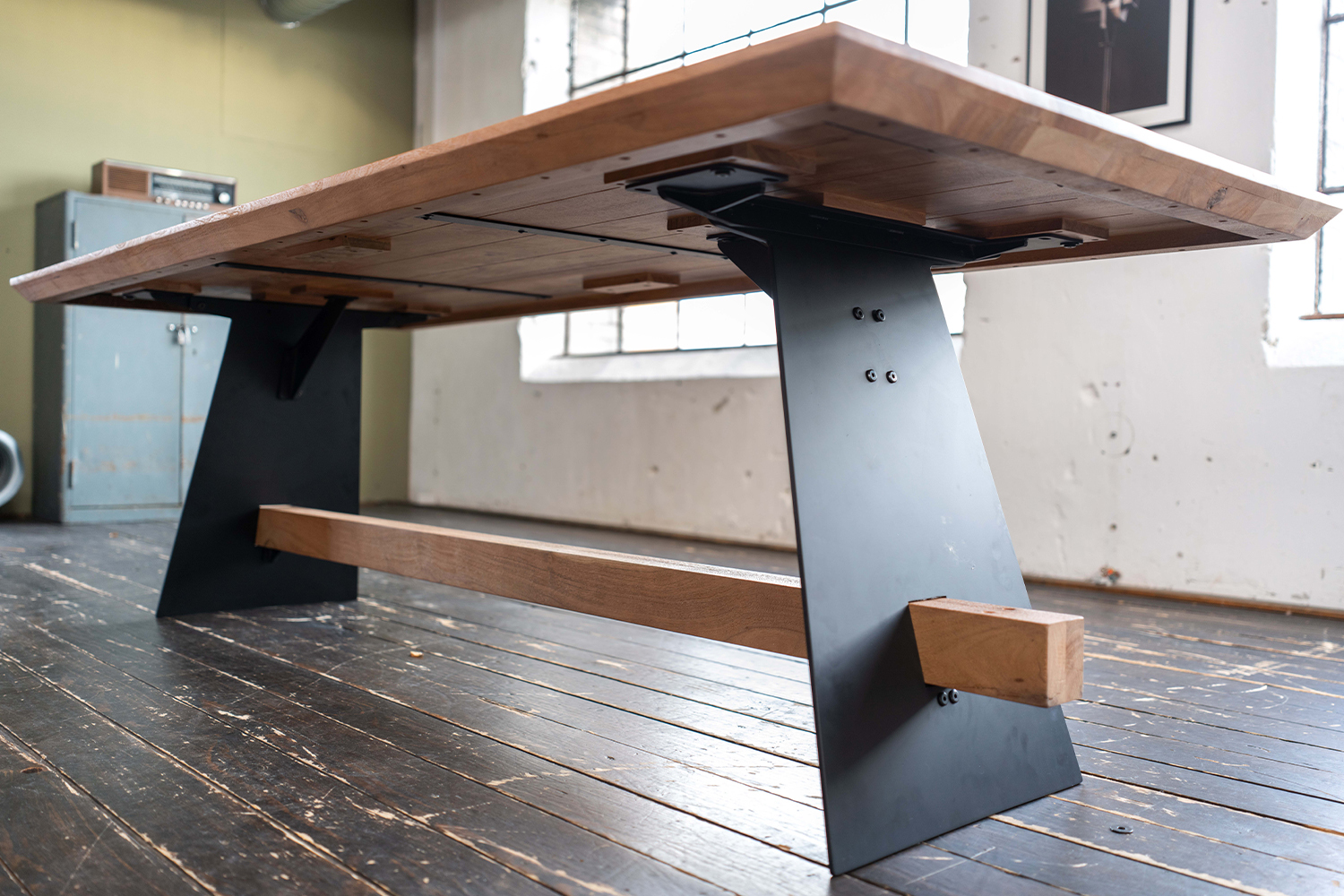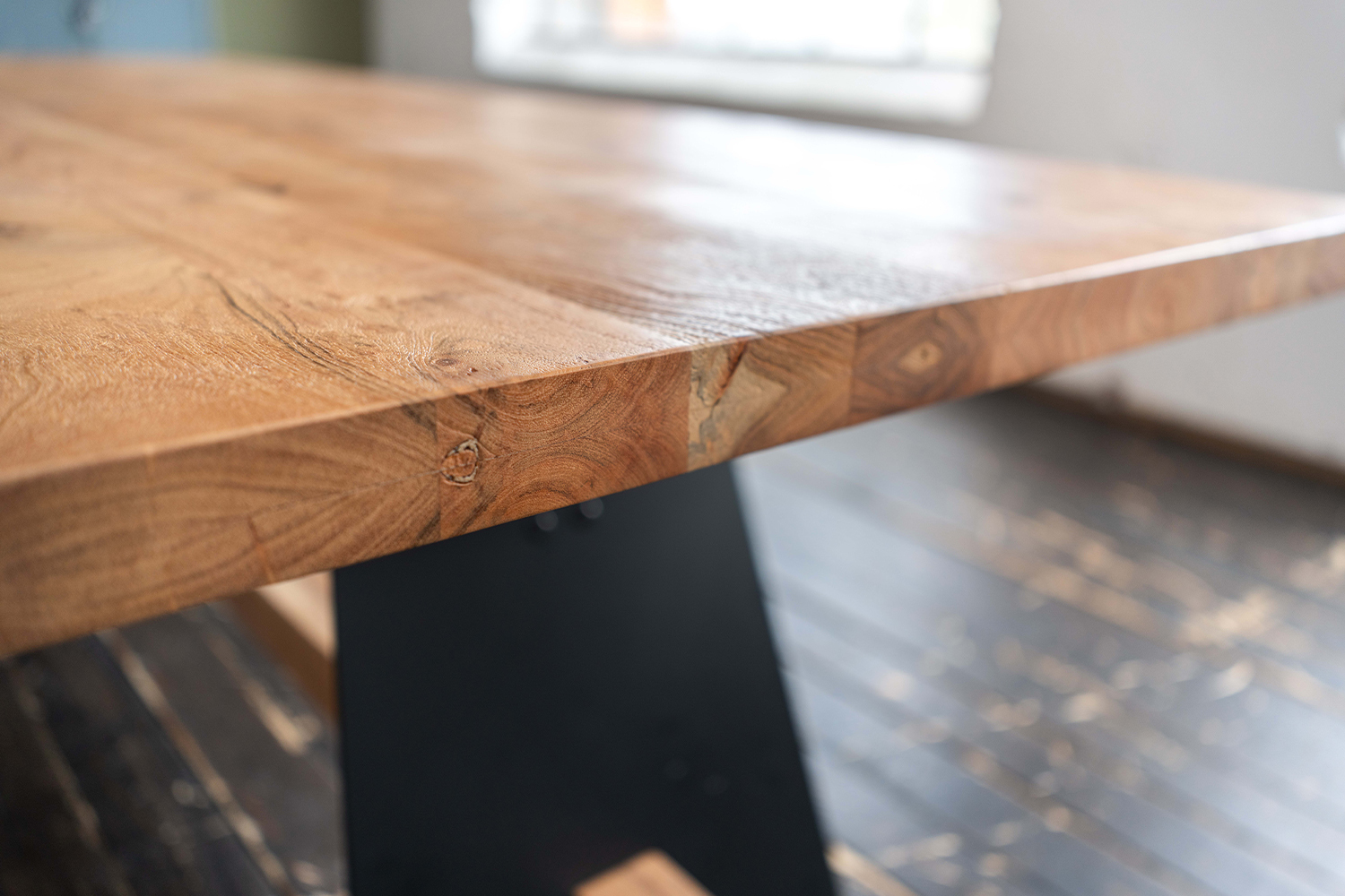 Das rustikal geschweißte, schwarz lackierte Untergestell im Industriedesign verleiht dem Tisch eine moderne, industrielle Note. Diese gelungene Kombination aus natürlichem Holz und robustem Metall macht den Tisch zu einem Design-Highlight in Ihrem Esszimmer.